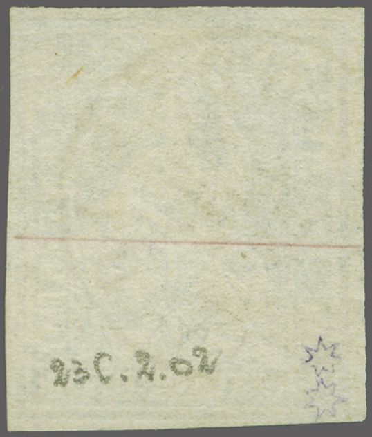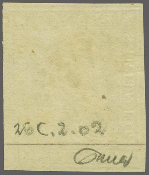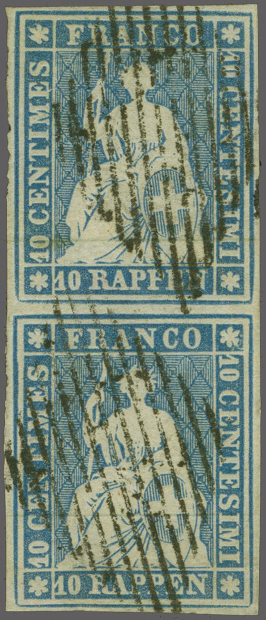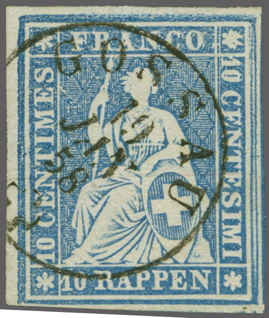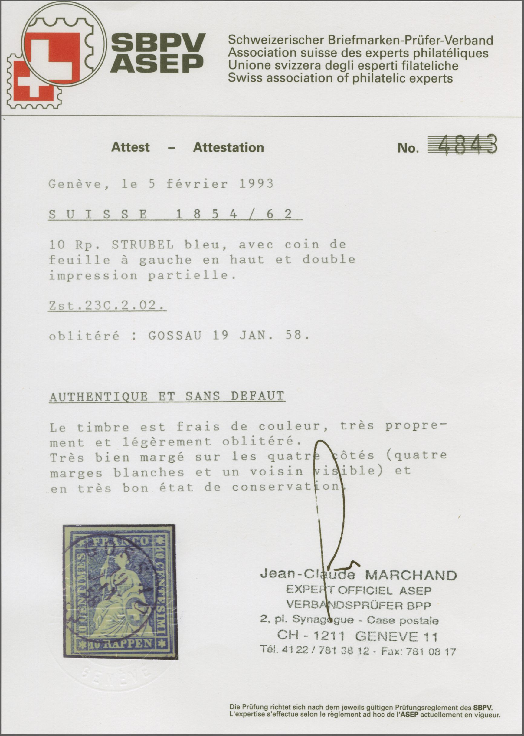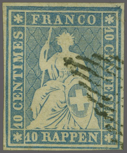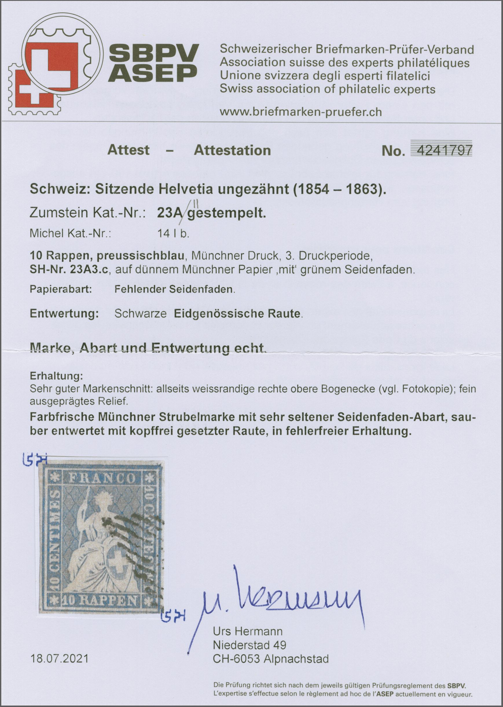 10 Rp. preussischblau mit Abart 'fehlender Seidenfaden', farbfr. und voll- bis weissrandig von der Bogenecke rechts oben, klar und kopffrei entw. mit eidg. Raute. Attest Hermann (2021) (Image 1)