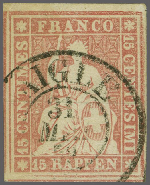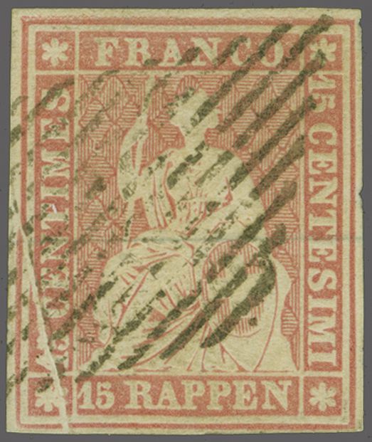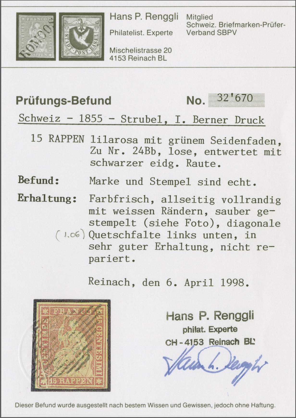 15 Rp. lilarosa mit deutlicher Quetschfalte links unten, farbfr. und allseits weissrandig, zart entw. mit eidg. Raute. Befund Renggli (1998) (Image 1)