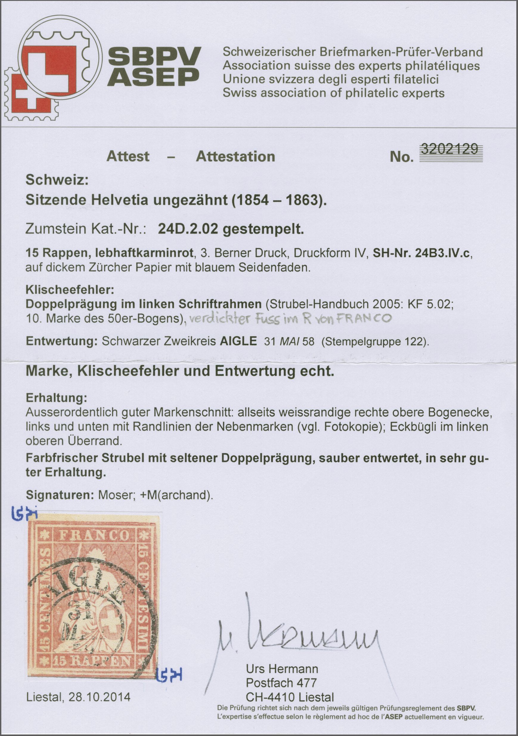 Nachbarmarken, zart entw. mit Zweikreiser "AIGLE 31 MAI 58". Signiert Moser & Marchand; Attest Hermann (2014) Zu Spez 24D.2.02 = CHF 400+ (Image