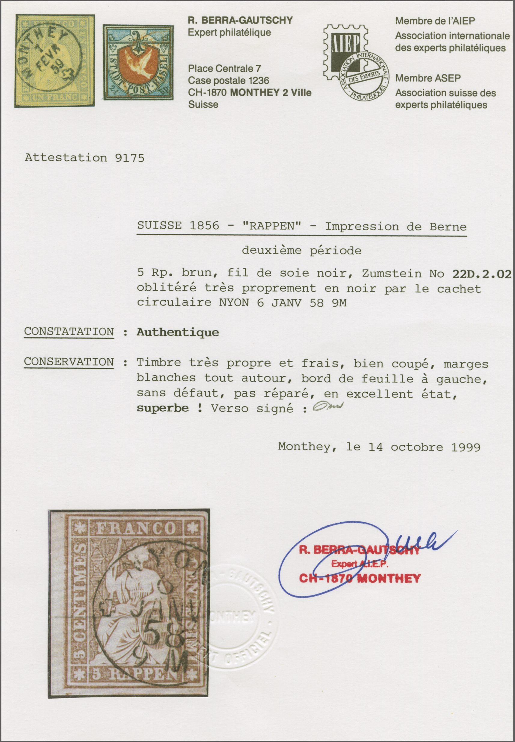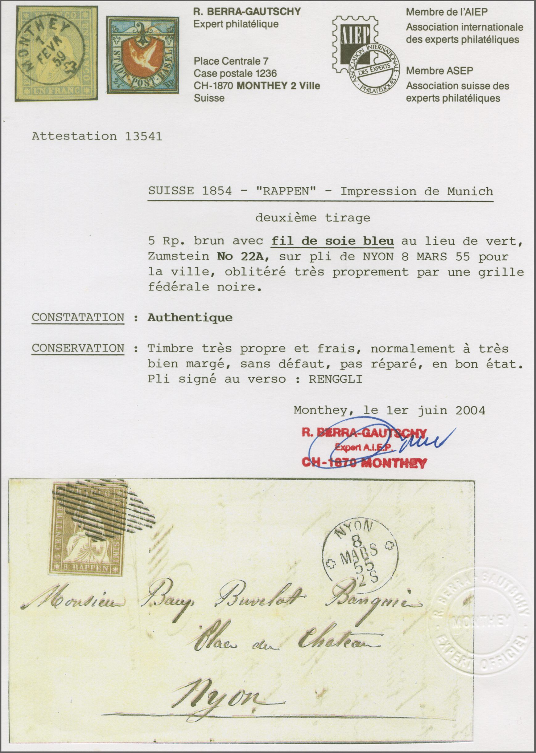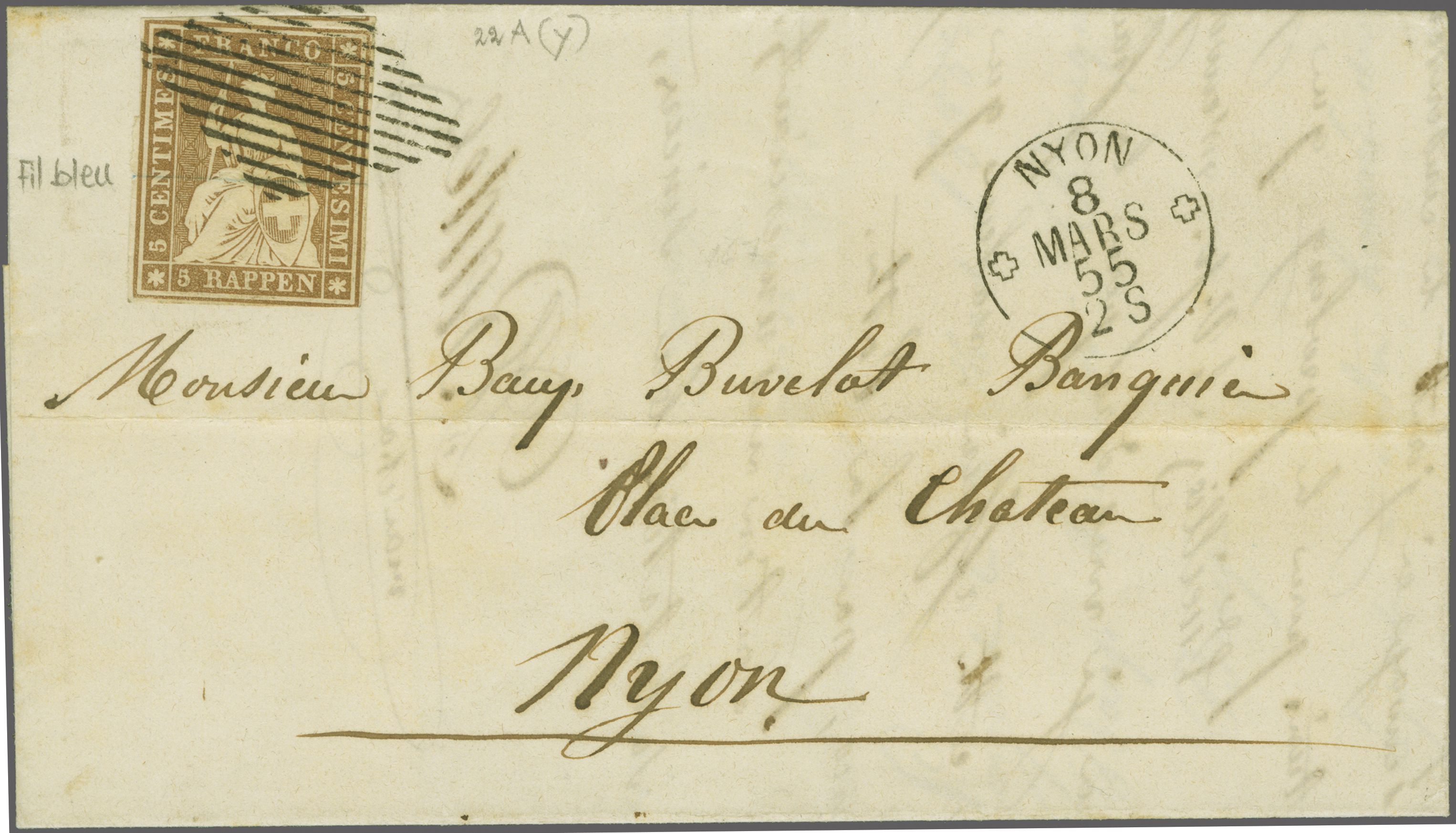 5 Rp. braun mit blauem statt grünem Seidenfaden, farbfr. und voll- bis überrandige mit Teilen der oberen Nachbarmarke, ideal klar und übergehend entw. mit eidg. Raute mit nebenges. Einkreiser "NYON 8 MARS 55" auf lokalem