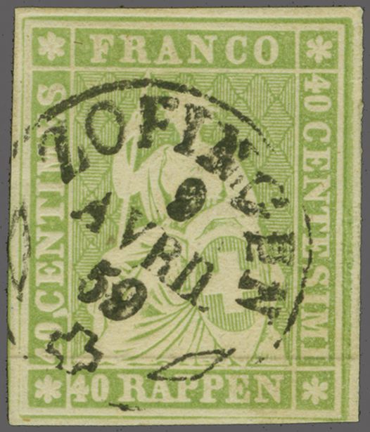 40 Rp. blassgelbgrün mit Plattenfehler: weisser Punkt rechts vom Kopf (Zu Spez 2.01), farbfr. und allseits regelmässig weissrandig, klar und die Helvetia freilassend entw. mit schwarzer Raute. Ein Prachtstück, Atteste von der