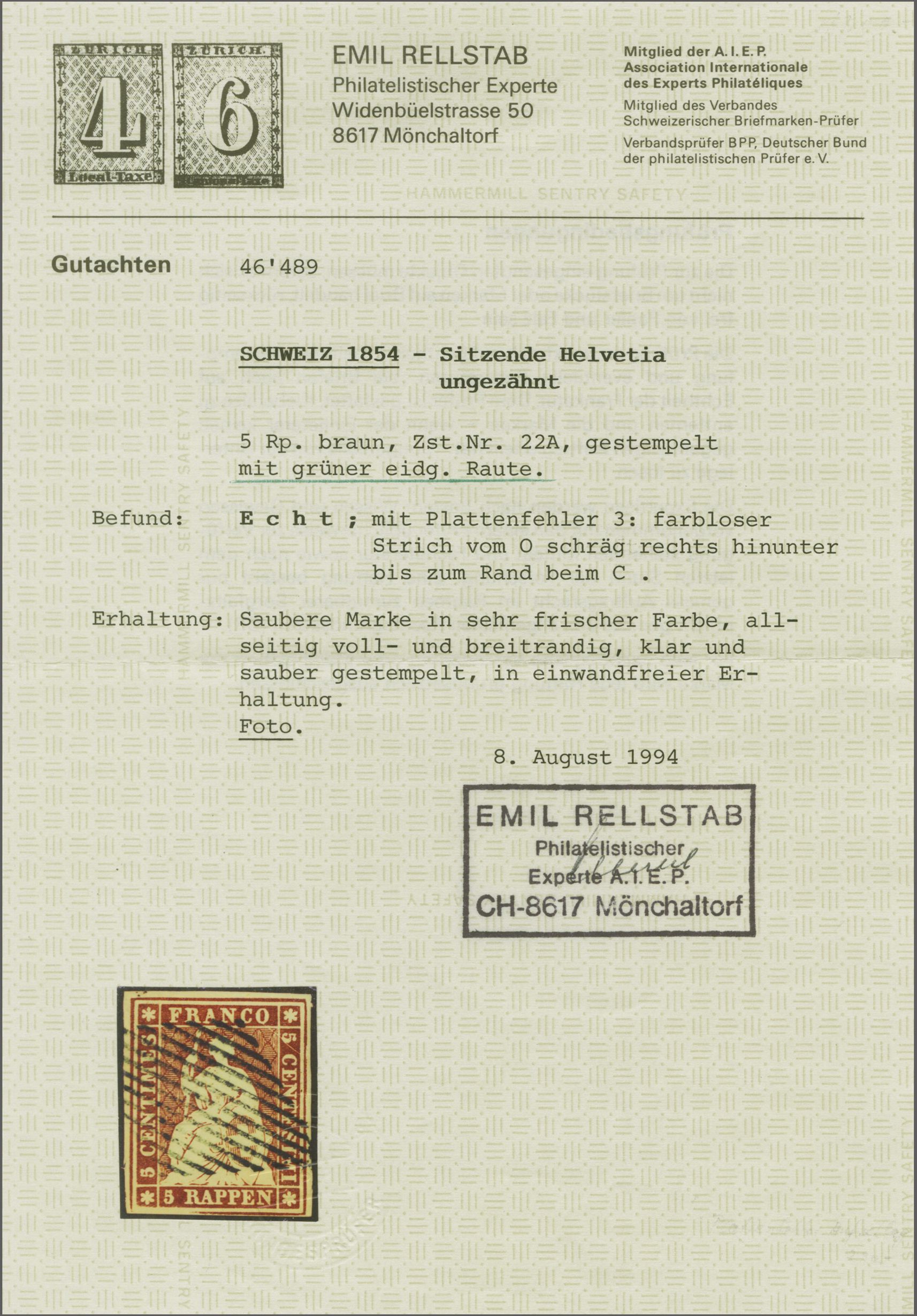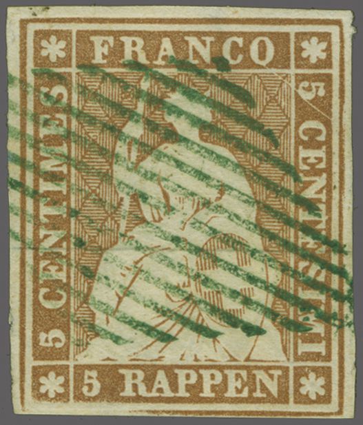 5 Rp. braun mit Plattenfehler: farbloser Strich vom 'O' schräg rechts hinunter bis zum Rand beim 'C', ein farbintensives und allseits weissrandiges Stück (oben leicht dünn), klar entw. mit seltener grüner eidg. Raute. Attest