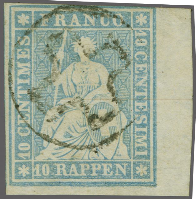 10 Rp. grauultramarin mit Abart: "Stern rechts oben rosettenartig eingefasst", farbfr. und voll- bis weissrandig, schön zartklar und übergehend entw. mit schwarzer 9-liniger Raute des IV. Postkreises (AW 52) mit nebenges.