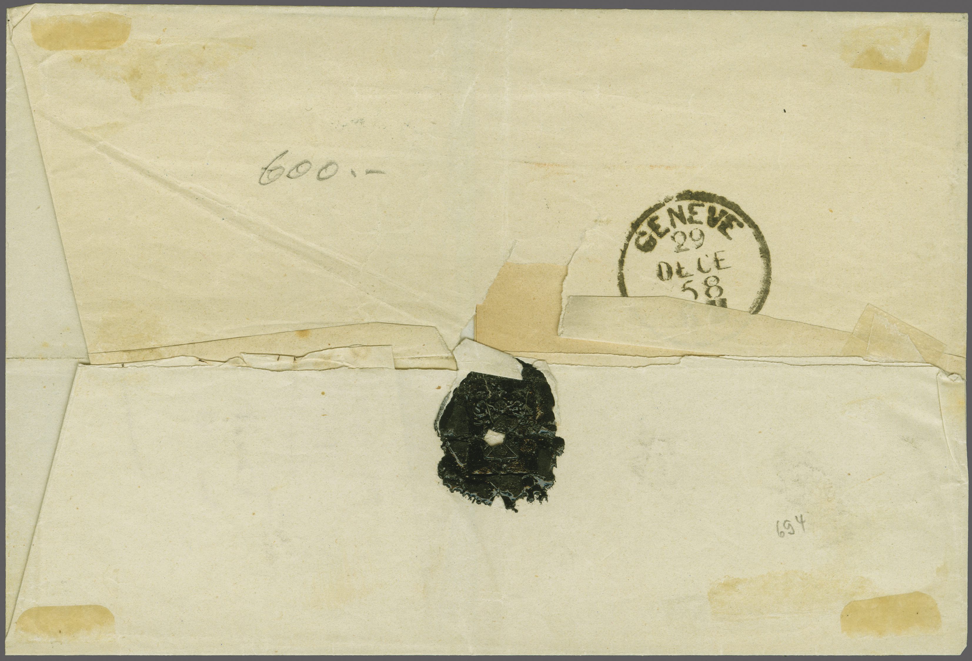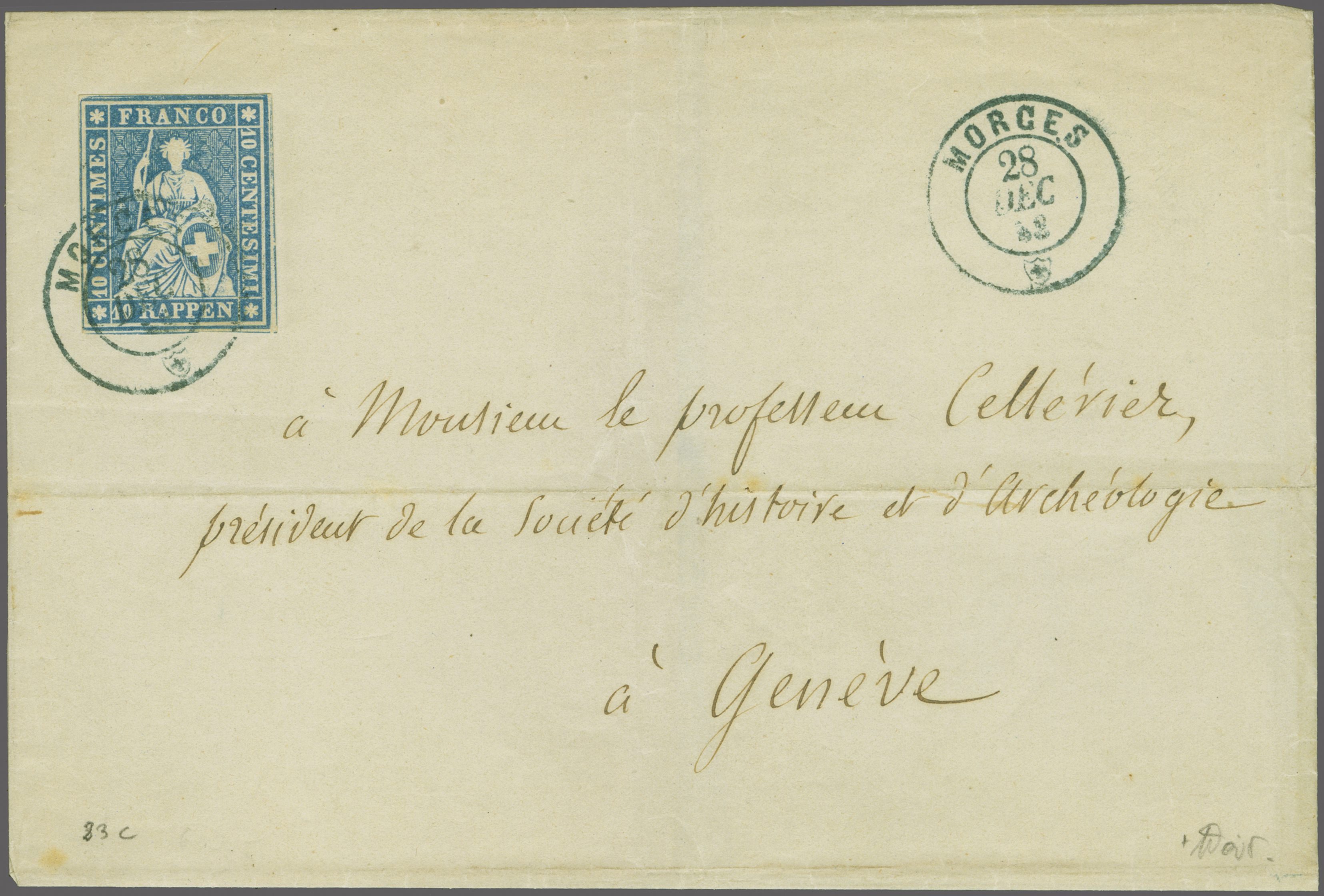 Briefkreis an "Monsieur le professeur Cellérier, président de la Société d'histoire et d'Archéologie" in Genf. Rücks. Ankunftsstp. vom Folgetag. Eine schöne und seltene Entwertung blau in blau; Attest von der Weid (1984) resp. Attestbestätigung