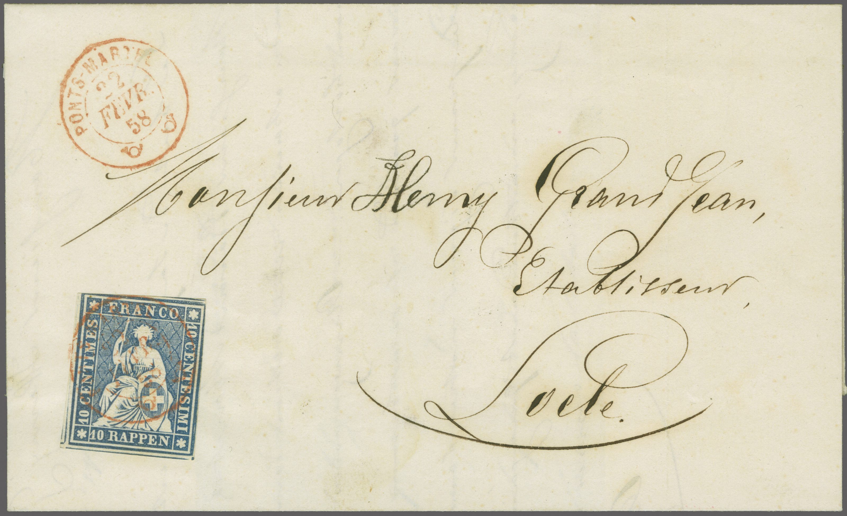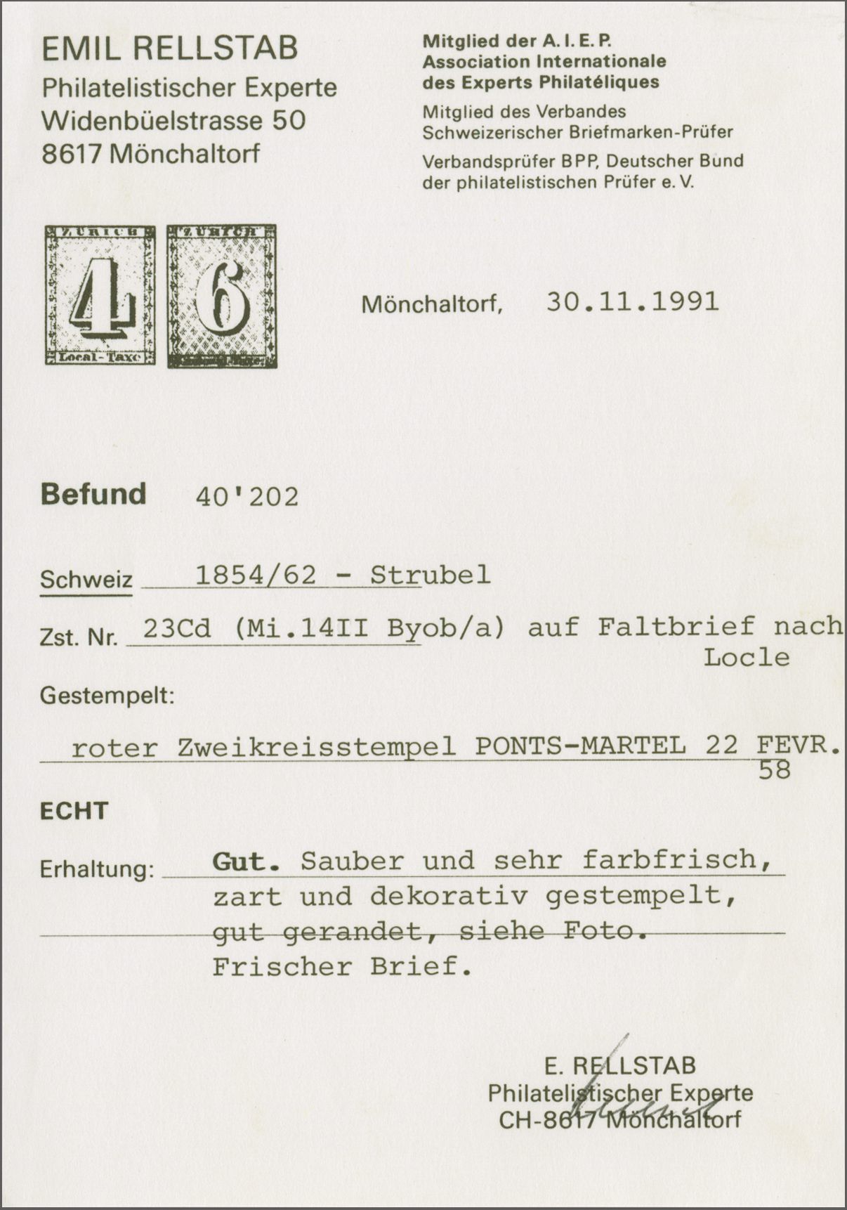 FEVR. 58" in seltenem rot, dieser nochmals klar nebengesetzt, auf vollständigem Faltrief im 2. Briefkreis nach Le Locle. Rücks. Ankunftsstp. vom Folgetag. Eine reizvolle und äusserst seltene Datumstempel-Entwertung in rot; Befund Rellstab (1991).