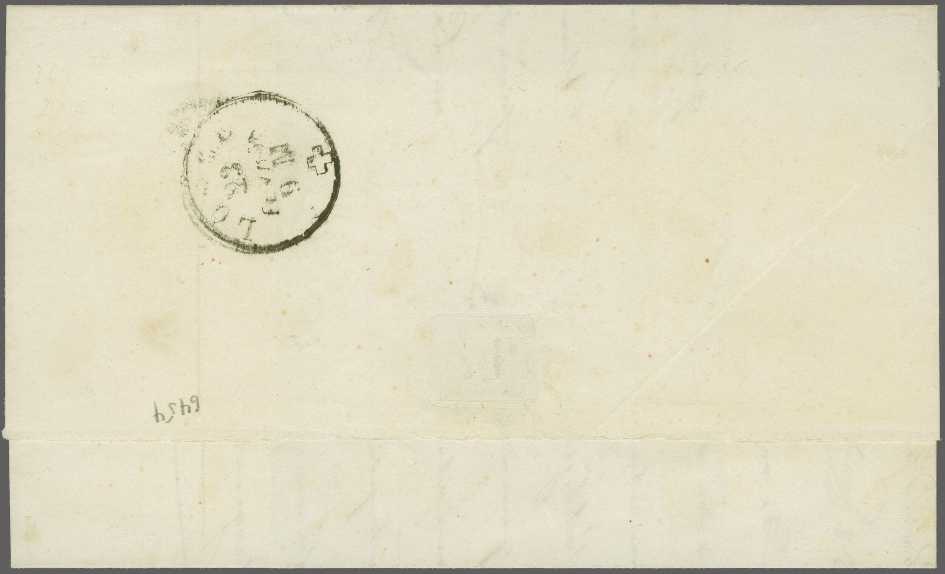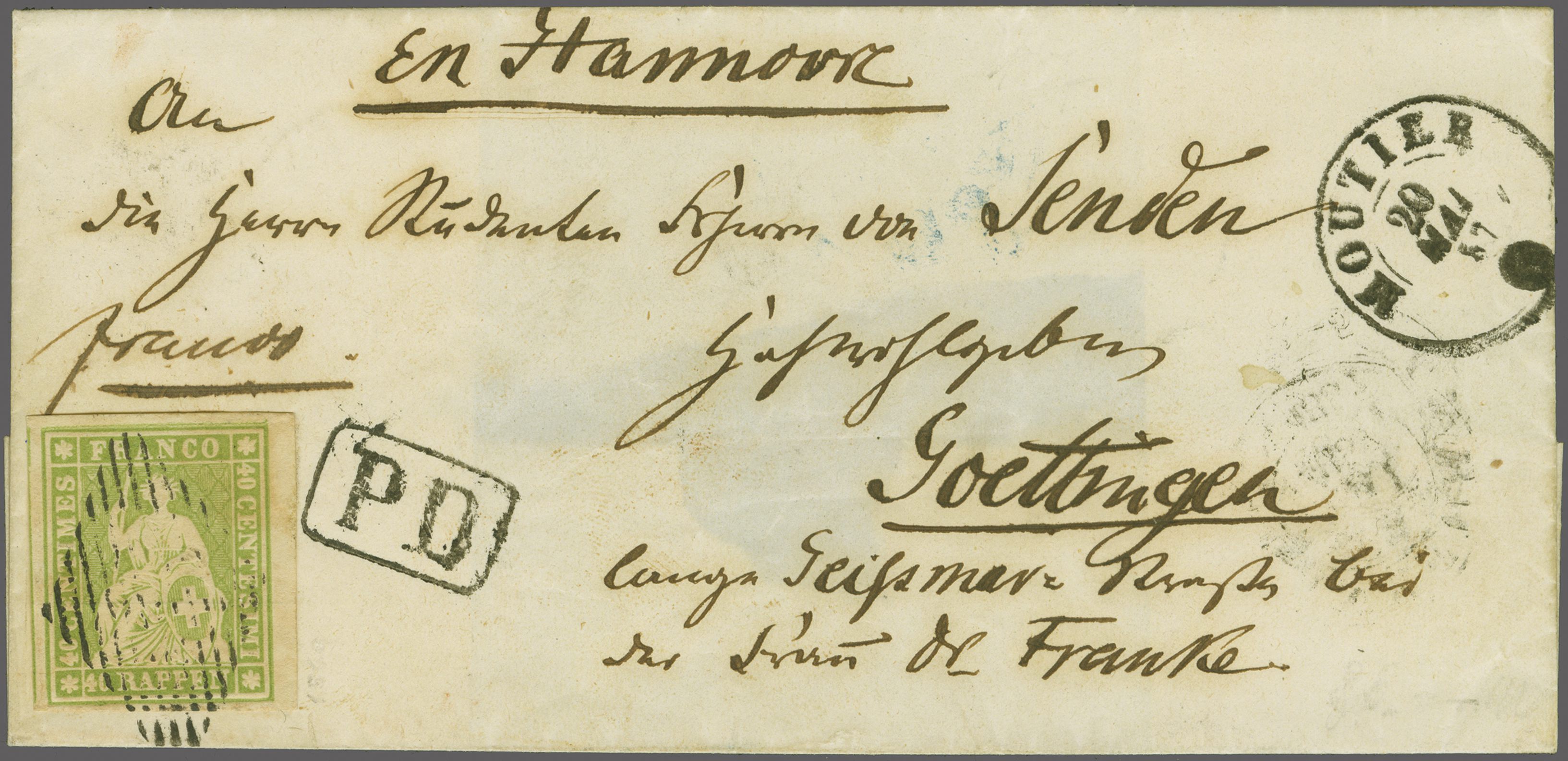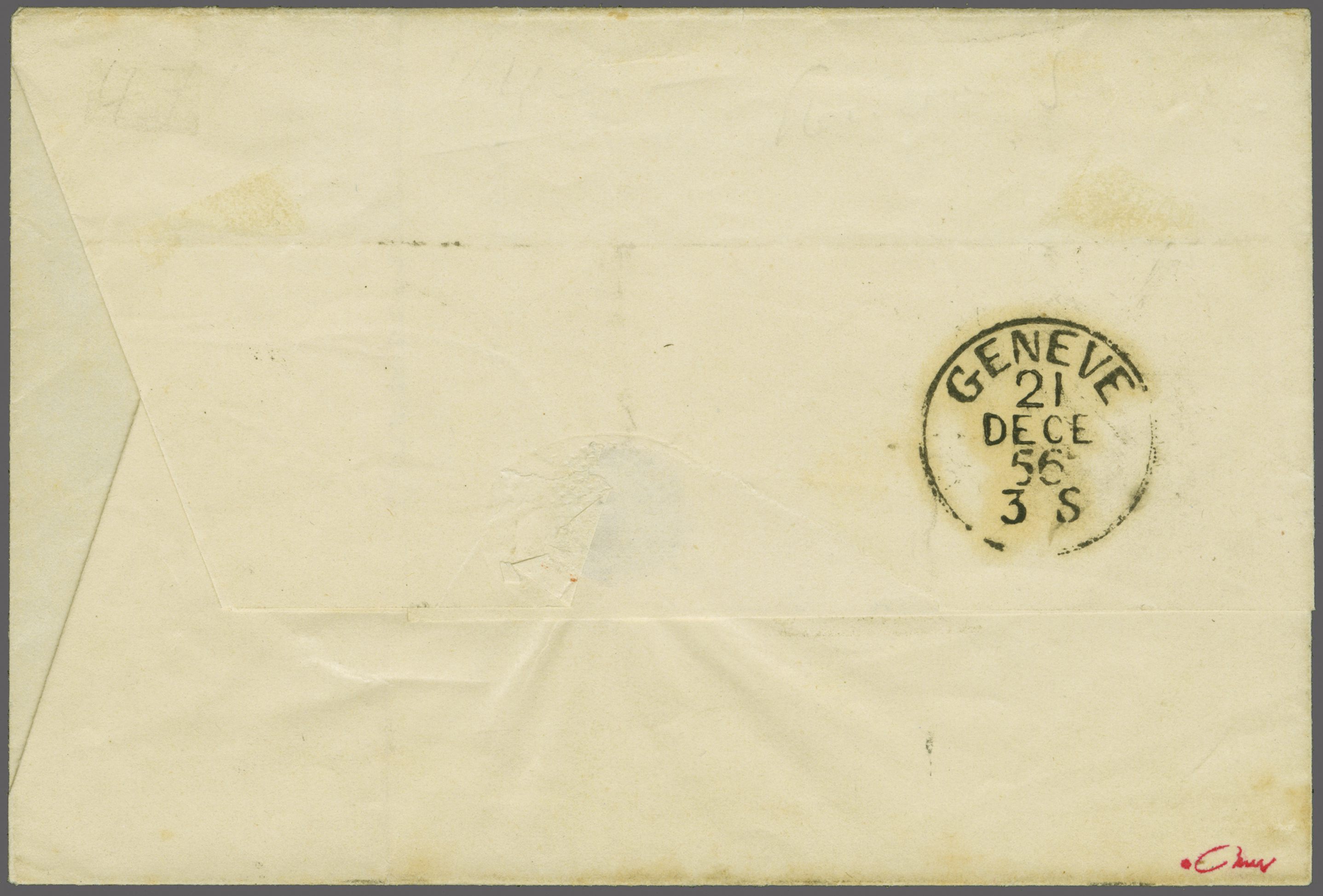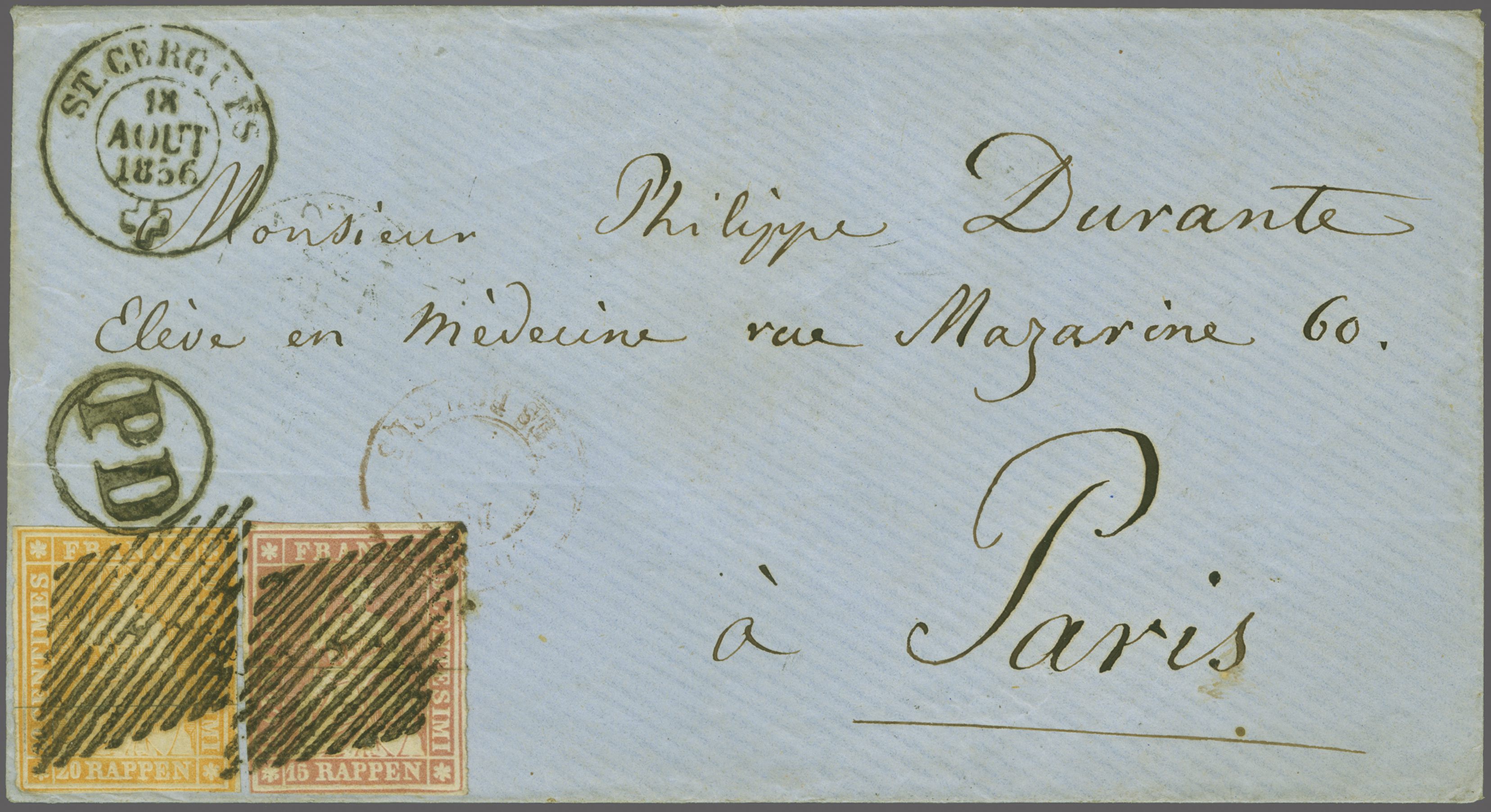 nebenges. kl. Zweikreisstp. "ST. CERGUES 18 AOUT 1856" sowie "PD" im Kreis auf vollständigem Damen-Briefcouvert an die Rue Mazarine in Paris. Befördert über Les Rousses und Pontarlier mit vorders. franz. Grenzübergangsstp. und rücks. Transit- sowie
