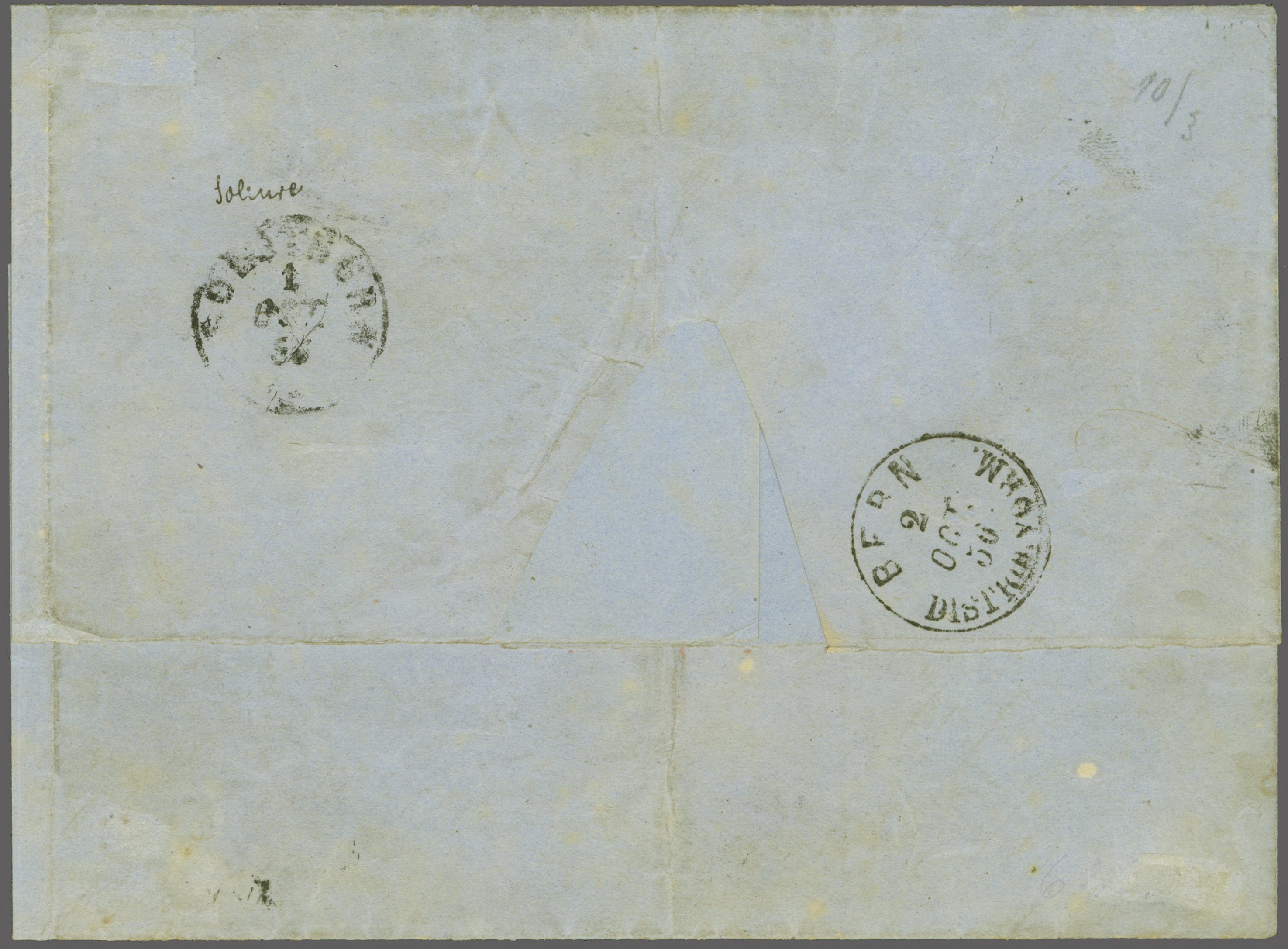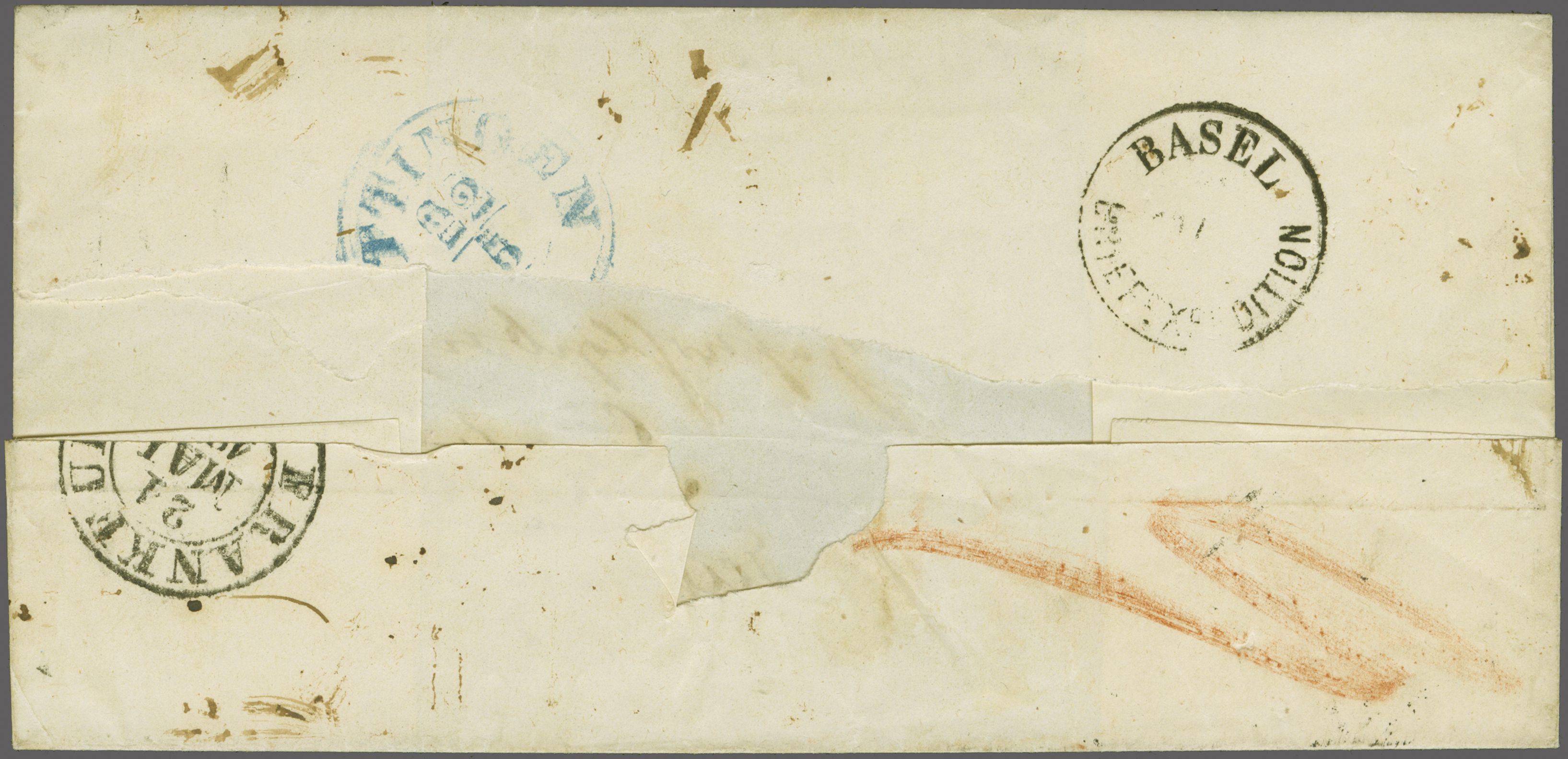 vollständigem, archivfrischem Forwarded-Faltbrief aus dünnem Seidenpapier (Marke zur Kontrolle gelöst und zurückgefalzt) datiert "San Francisco 19. August 1858" und an den Bankier Hieronymus Bischoff-Respinger (1795-1870) adressiert. Auf möglichst