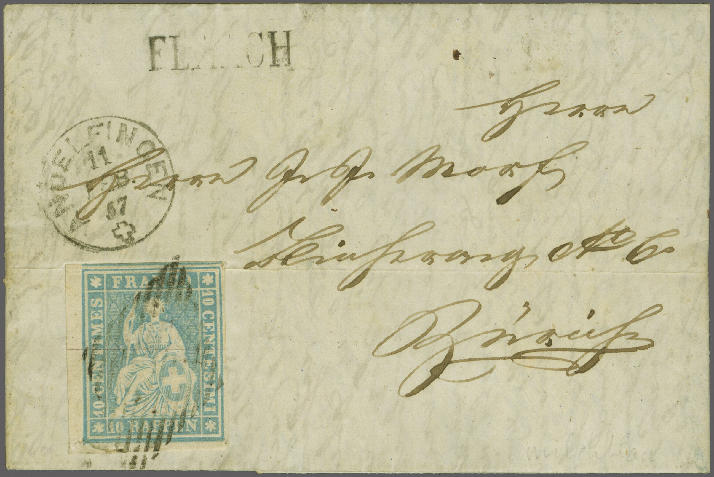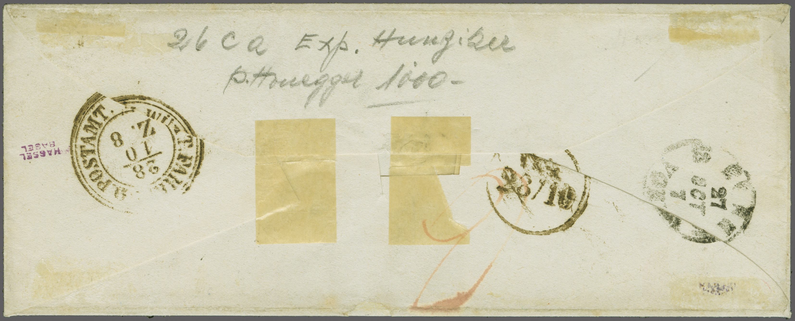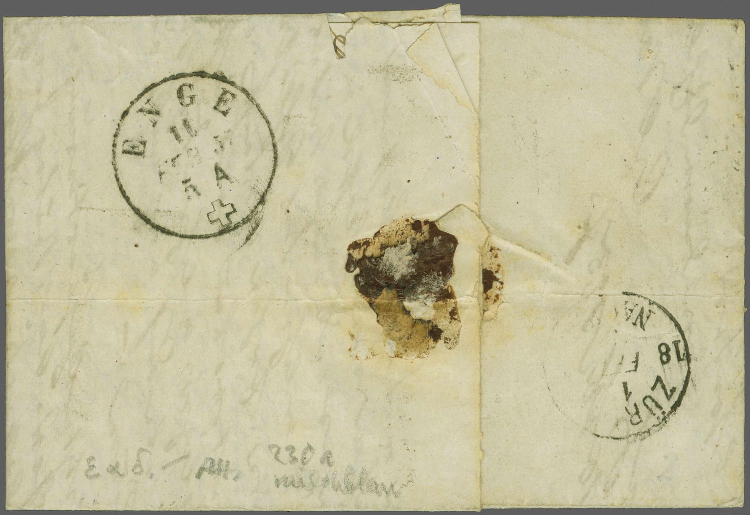 einen Brief aus dem 2. Schweizer in den 2. vereinsländischen Rayon gemäss Postvertrag mit dem DÖPV vom 15. Oktober 1852. Rücks. Weiterfrankonotiz "6" Konventionskreuzer in roter Tinte. Signiert Hassel, Attest Hunziker (1965). Provenienz: 150.