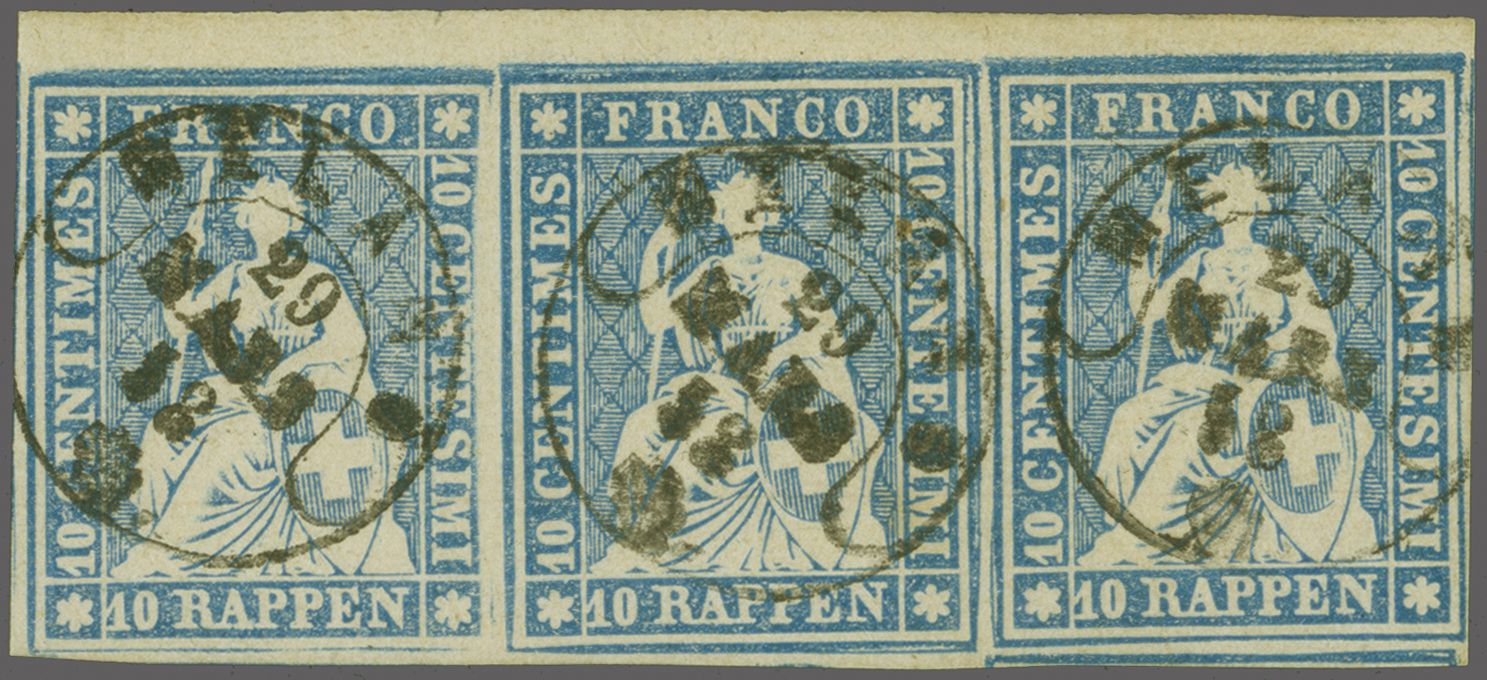 10 Rp. dunkelblau in leuchtend frischer und kräftiger Farbe, voll- bis meist weissrandig mit Teilen von fünf Nebenmarken, schön zartklar, zentrisch und doch minim übergehend entw. mit kleinem Zweikreisstempel "PONTS-MARTEL 22