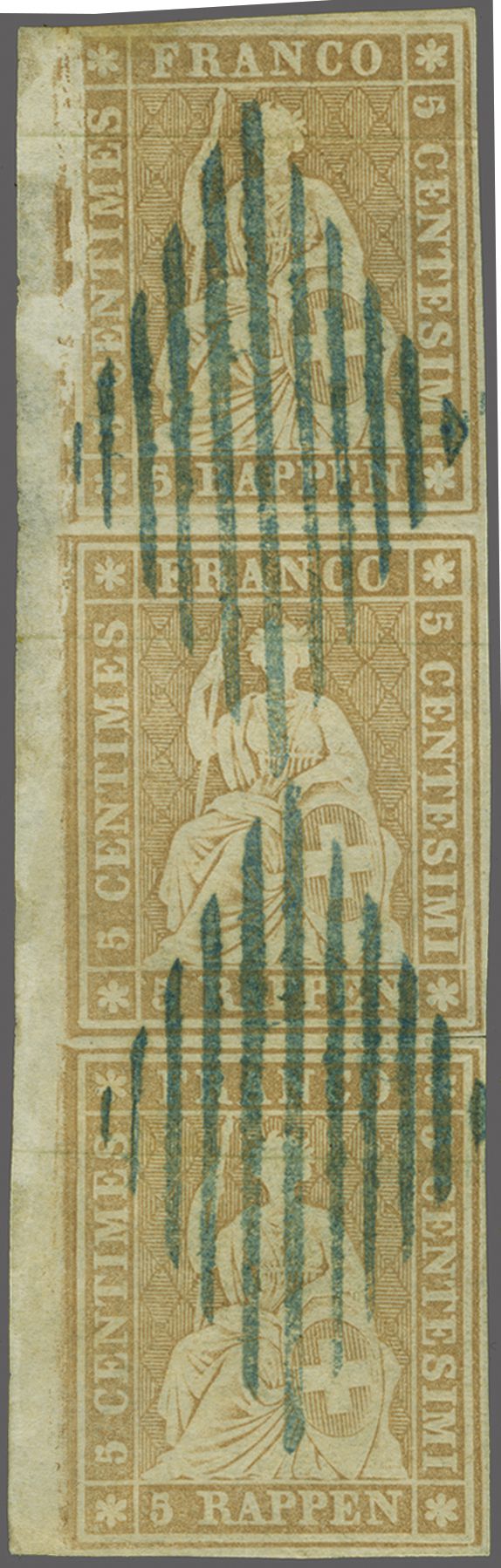5 Rp. hellmattbraun im senkr. Dreierstreifen, farbfr. und voll- bis zumeist weissrandig mit breitem Bogenrand links (darin kl. Papierschürfungen und kl. Eckbug unten, Vortrennschnitt rechts zwischen den unteren beiden Marken),