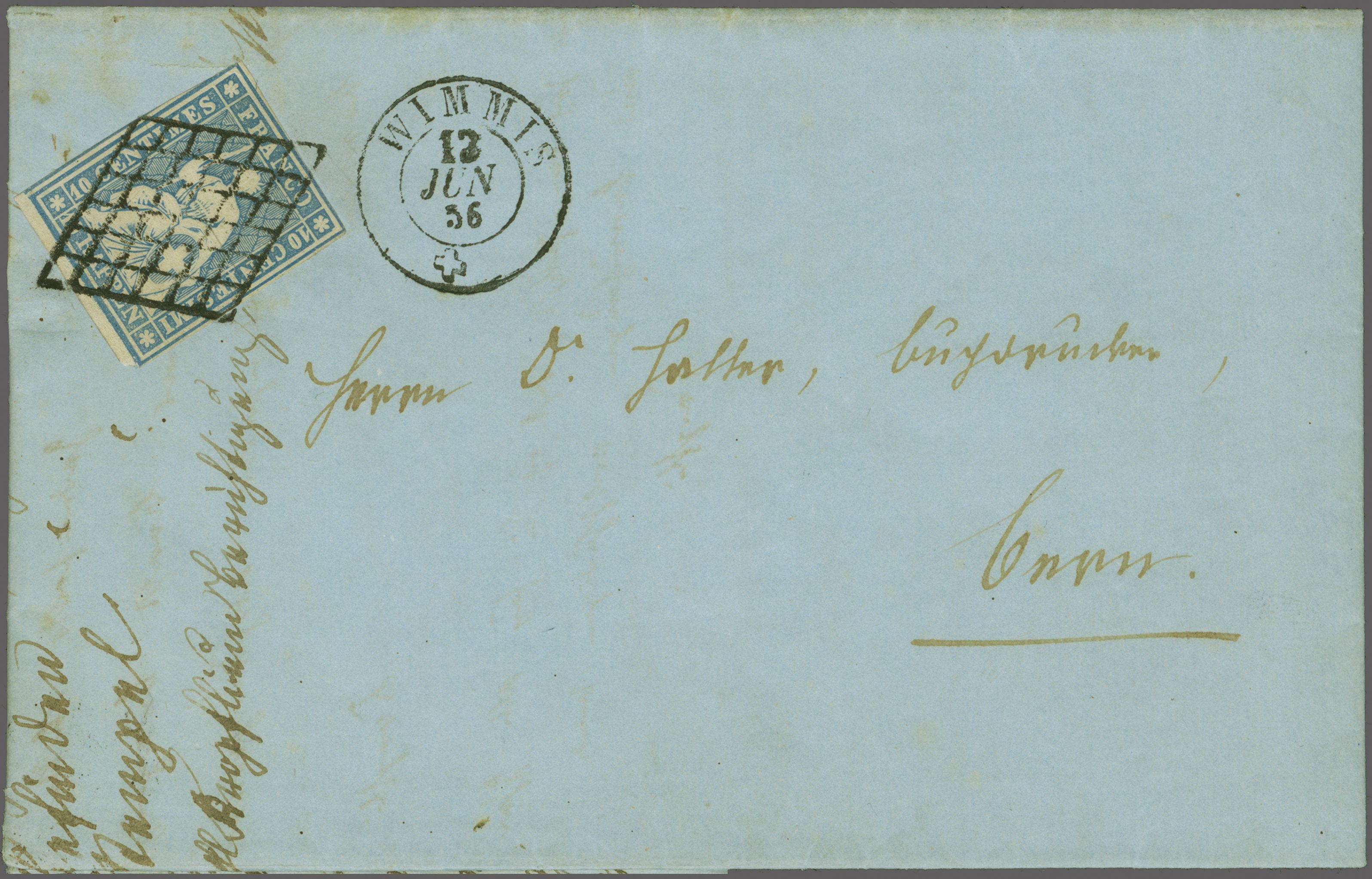 10 Rp. grauultramarin, farbfr. und voll- bis weissrandig mit Bogenrand unten und Ansatz der linken Nebenmarke, schön klar und zweiseitig übergehend entwertet mit schwarzer Gitterraute von Wimmis (AW 102, teils nachgezogen) mit