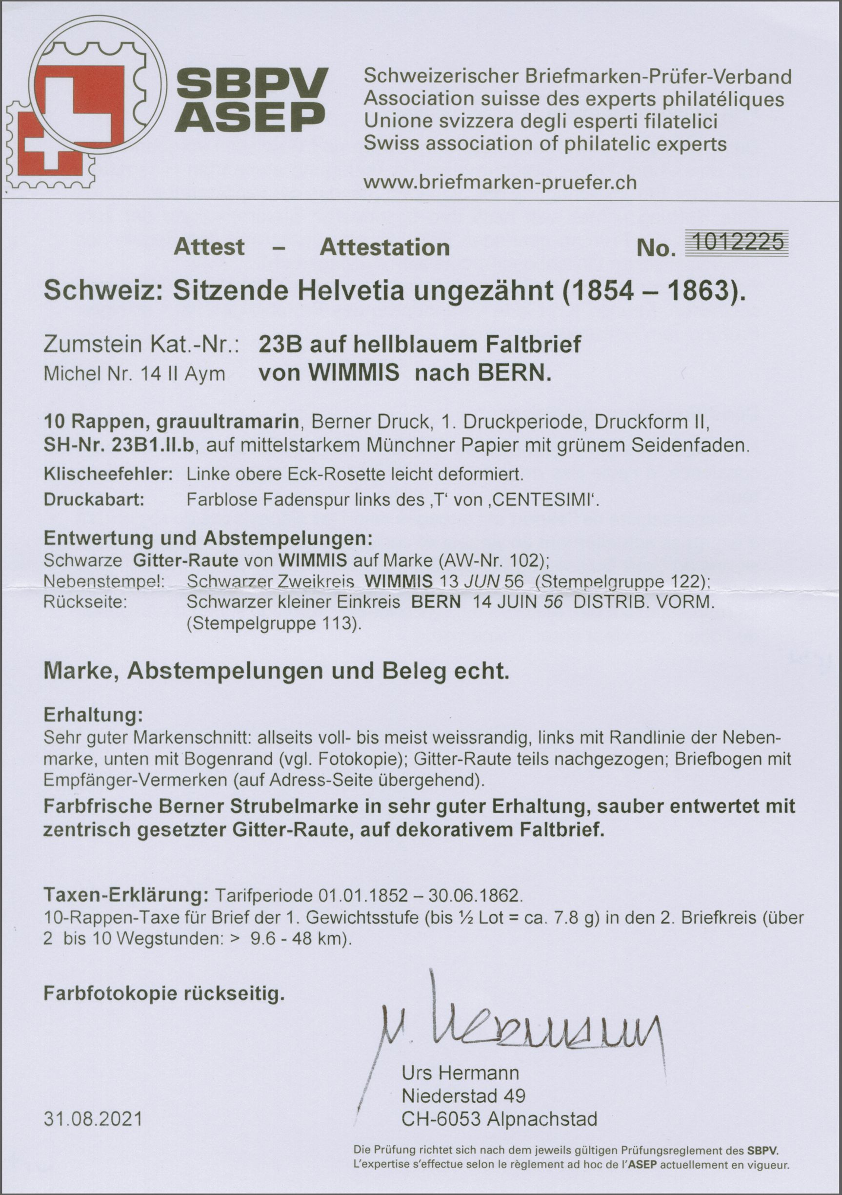 beigefügtem kl. Zweikreisstp. "WIMMIS 13 JUN 56" auf frischem und vollständigem, blauem Faltbrief im 2. Briefkreis nach Bern (Empfängernotiz auf die Vorderseite übergehend). Ein schöner Brief mit dieser seltenen und eleganten Entwertung; Attest
