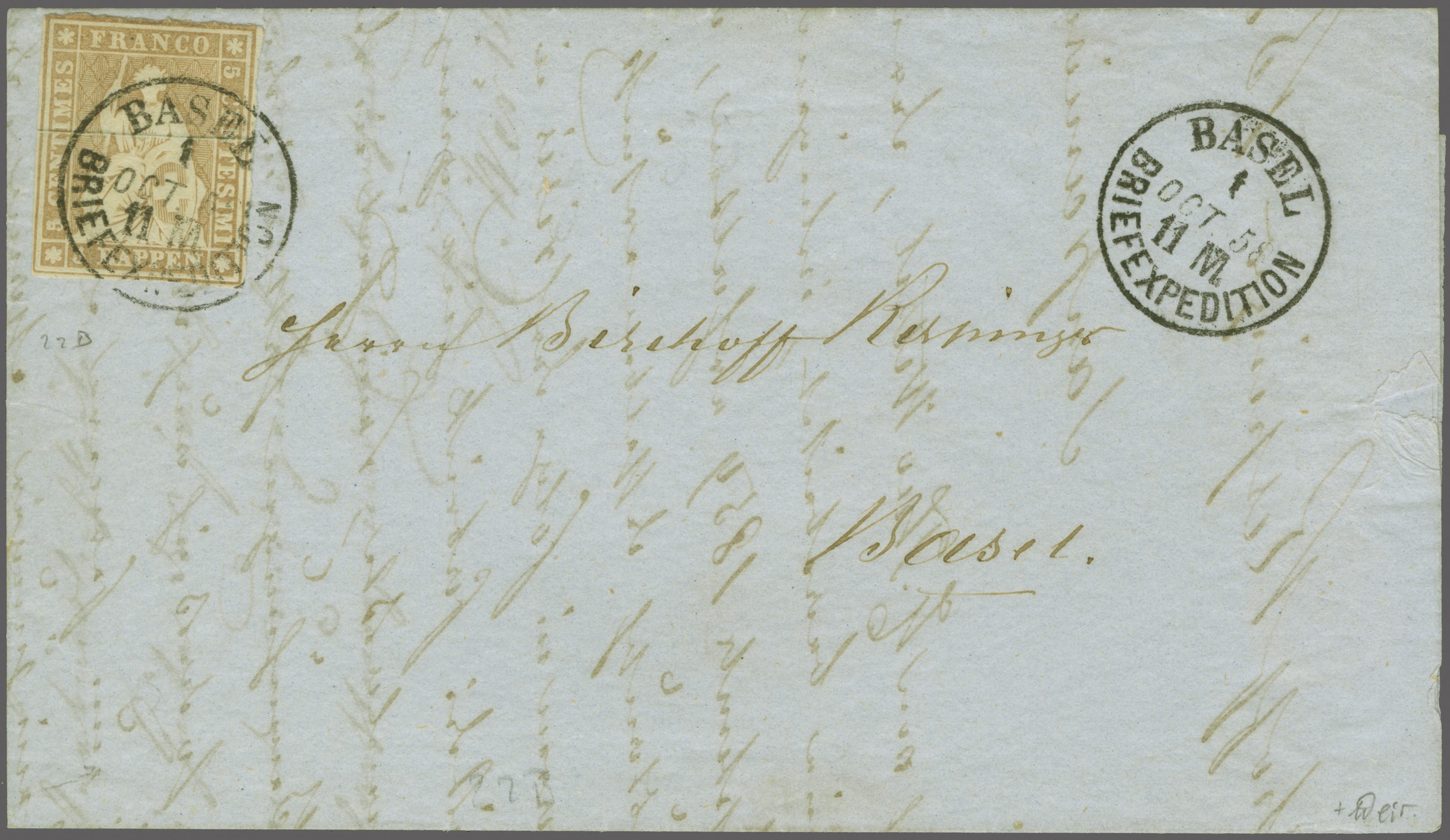 5 Rp. graubraun, farbfr. und voll- bis weissrandig mit fein ausgeprägtem Relief, schön klar und übergehend entw. mit Elzevir-Einkreisstp. "BASEL BRIEFEXPEDITION 1 OCT. 58 11M", dieser nebenstehend nochmals wiederholt, auf