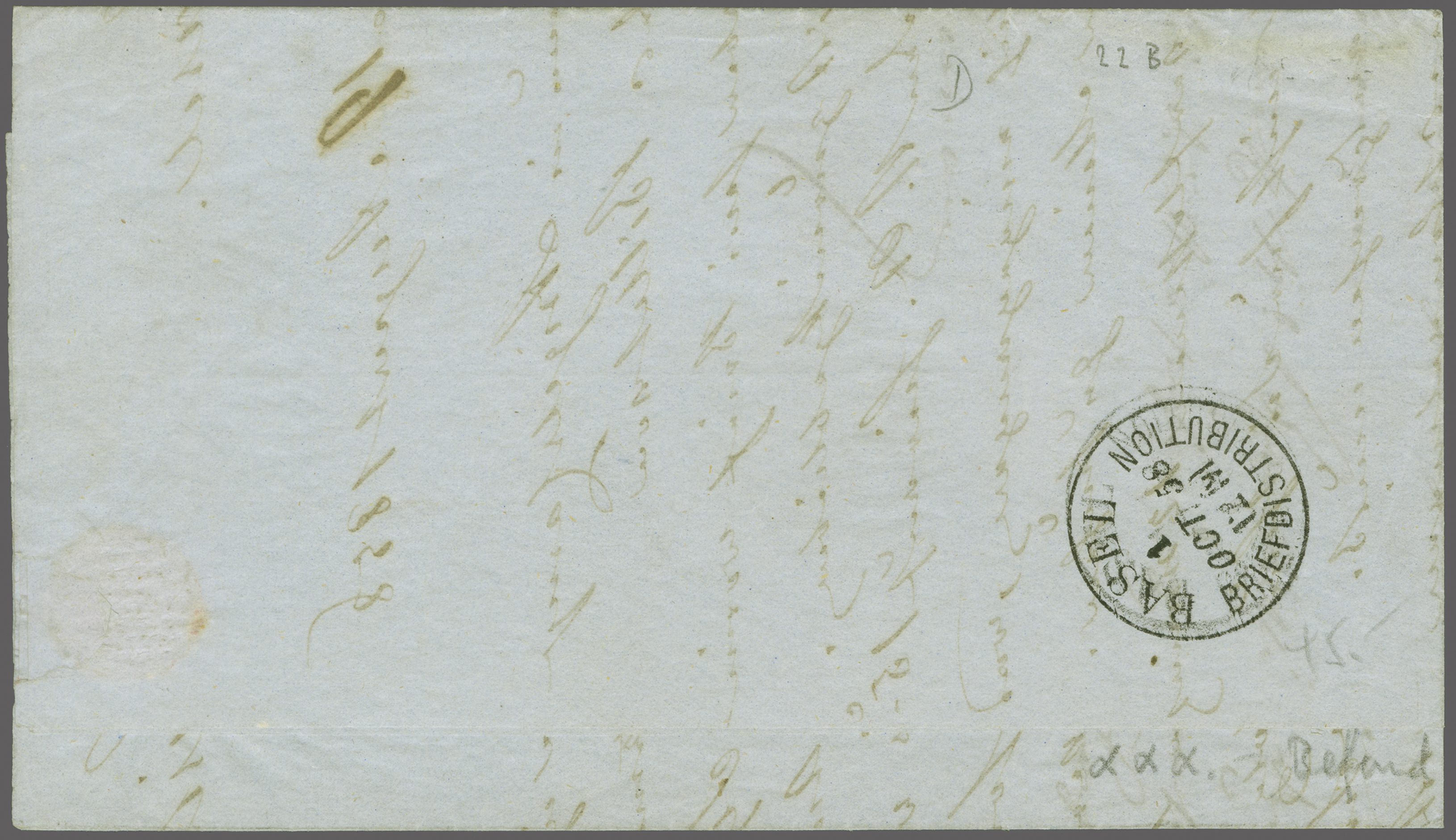 leichtem Papier verfasst und vom Absender versiegelt, wurde das Schreiben wohl einem Brief aus San Francisco an einen anderen Adressaten in Basel beigeschlossen und dann von letzterem in Basel als Ortsbrief aufgegeben. Ein interessanter und höchst