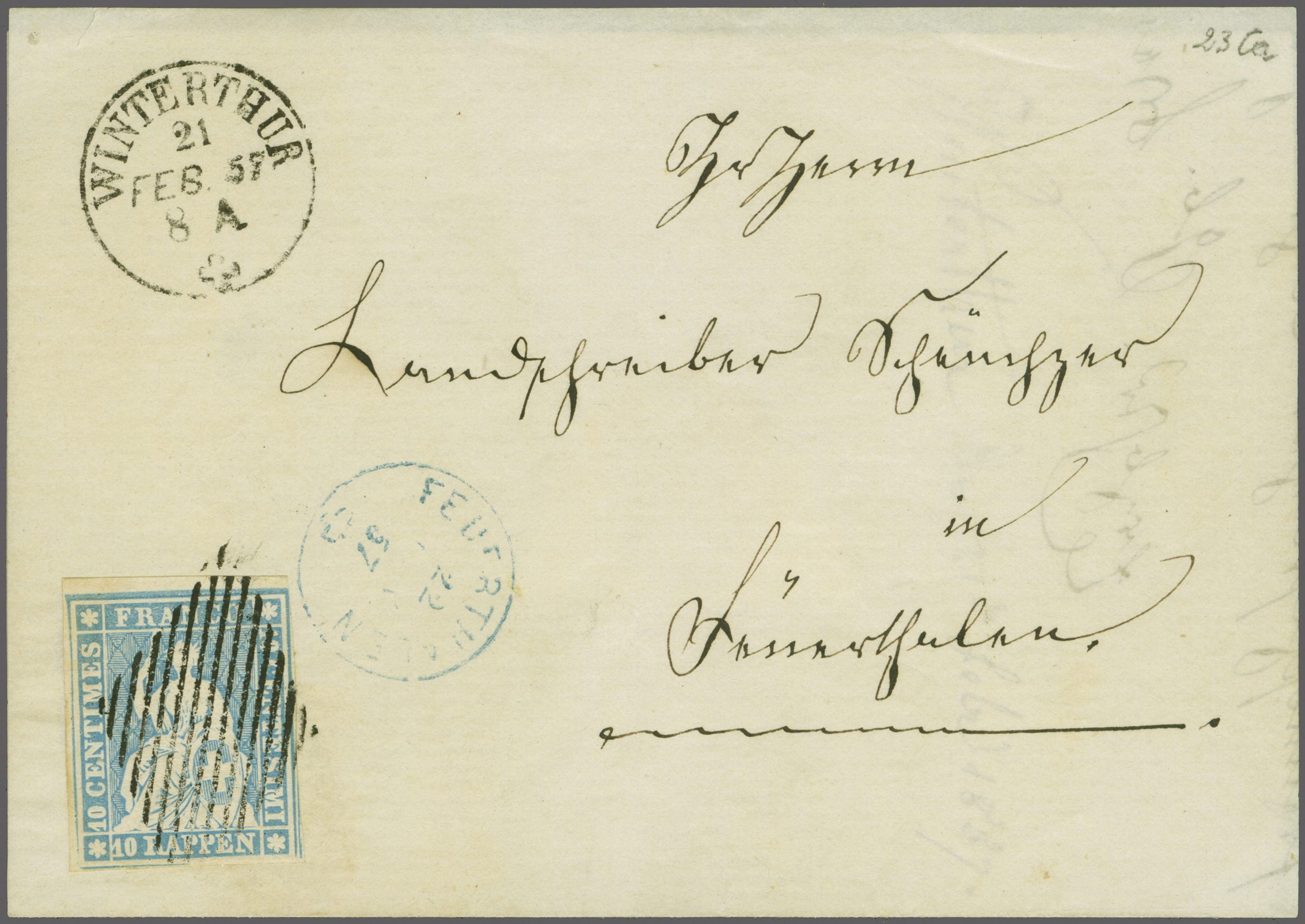 eidg. Raute mit nebenges. Elzevir-Einkreisstp. "WINTERTHUR 21 FEB. 57 8A"in der selben Farbe auf grossem Briefteil im 2. Briefkreis nach Feuerthalen. Vorders. Fingerhutstempel "FEUERTHALEN 22 FEB. 57" in blau zur Bestätigung des Ankunftszeitpunktes.