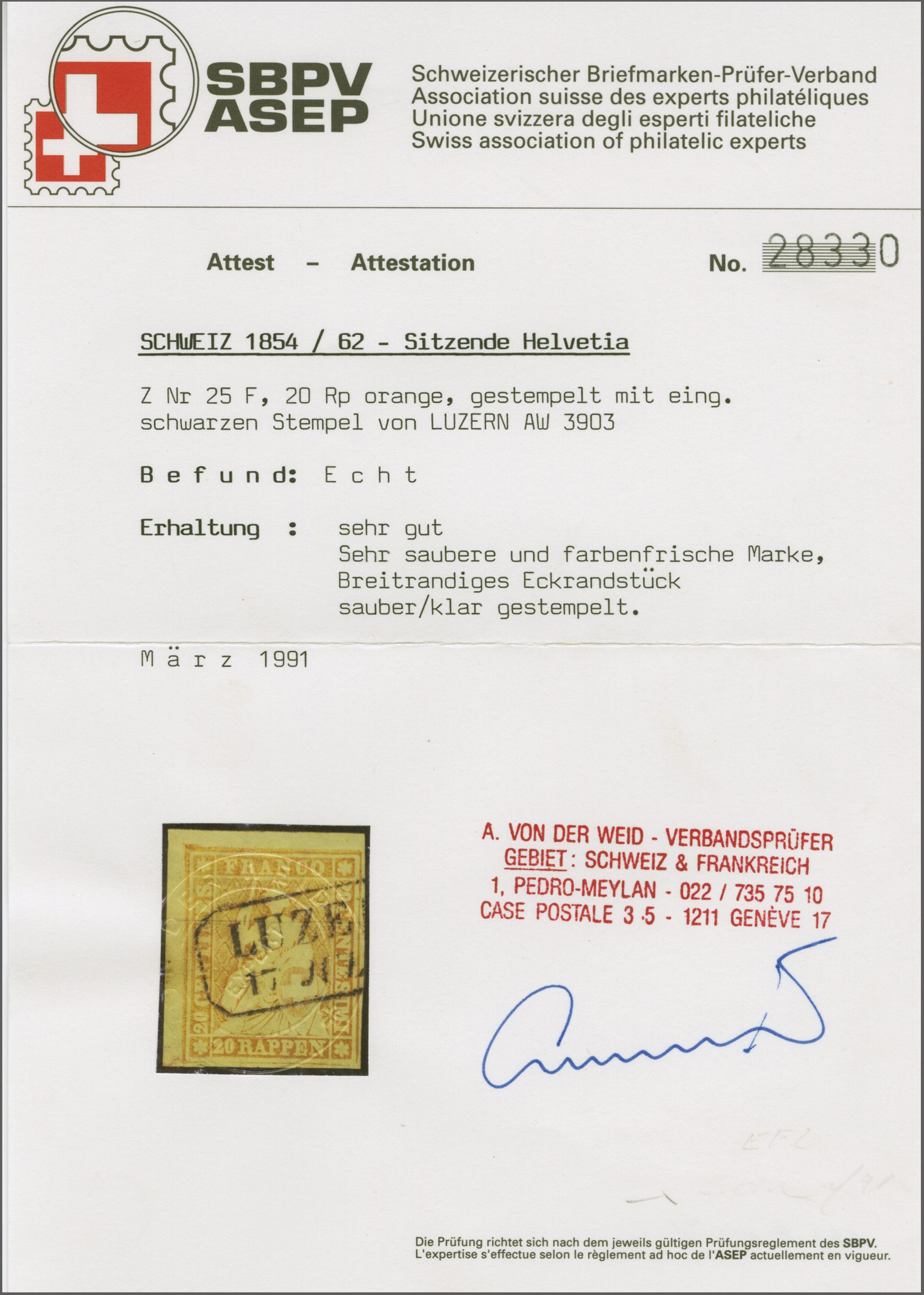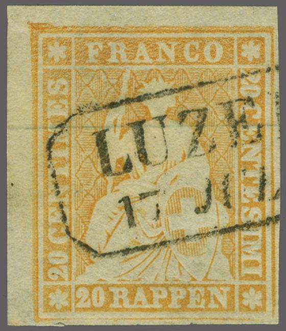 20 Rp. gelblichorange auf dünnem Münchner Papier, farbfr. und allseits weissrandiges Prachtstück mit Bogenecke oben links, klar entw. mit schwarzem Kastenstempel "LUZERN 17. JULI..." (AW 3903). Attest von der Weid (1991) (Image 1)