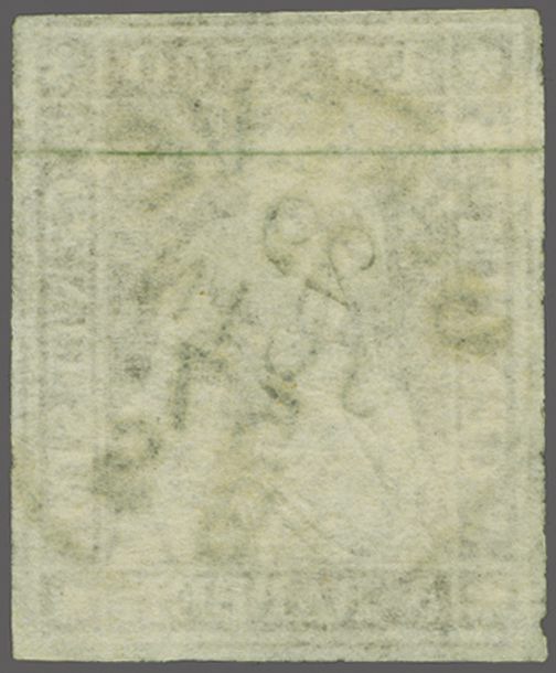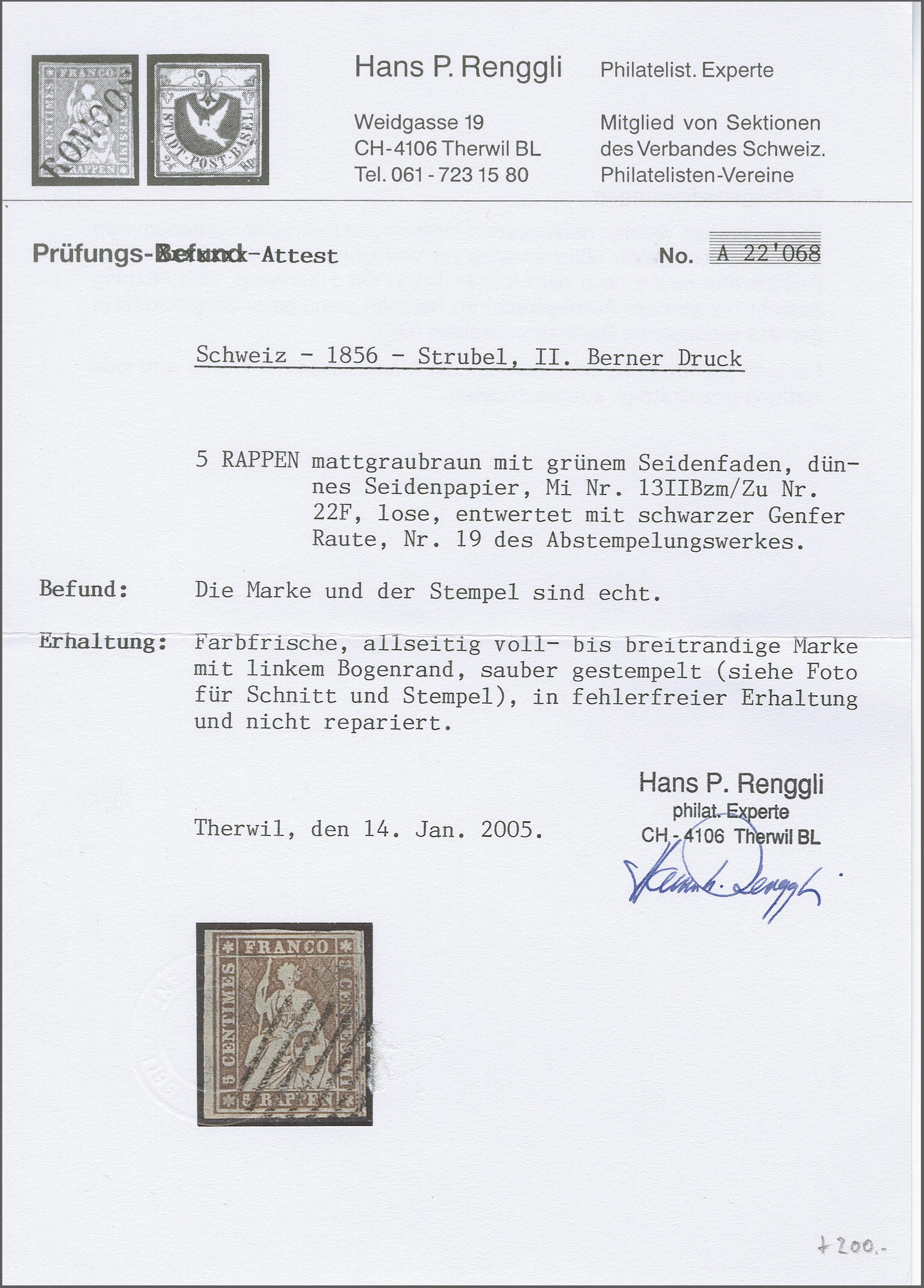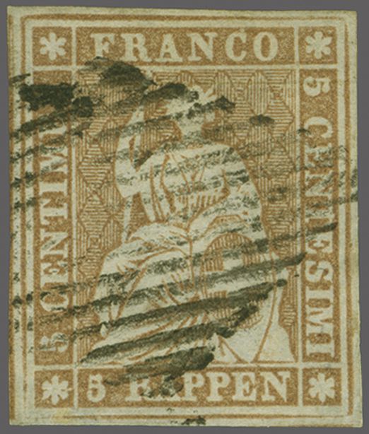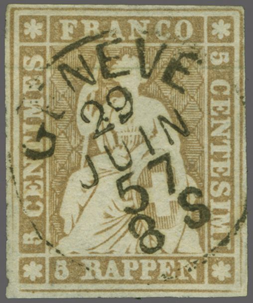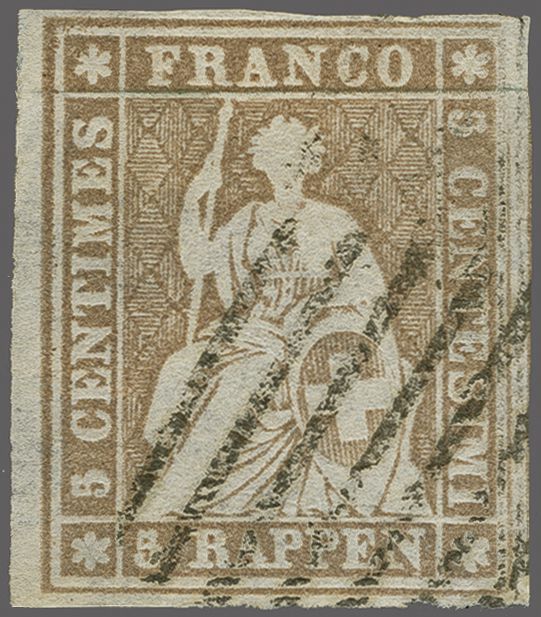 5 Rp. mattgraubraun auf dünnem Münchner Papier, farbfr. und allseits weissrandig, klar und kopffrei entw. mit Genfer Raute. Ansprechend, Attest Renggli (2005) SBK = CHF 1'400 (Image 1)