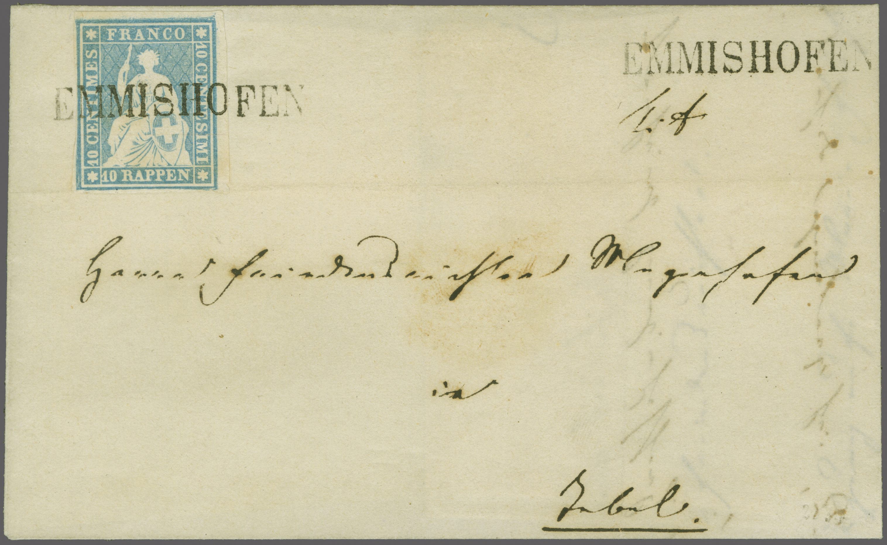 10 Rp. hellgrünlichblau mit Druckabart: "gespaltene Randlinie" links unten und unten rechts, farbfrisches und allseits weissrandiges Luxusstück mit Bogenrand links und oben, klar und übergehend entw. mit Stabstp. "EMMISHOFEN"