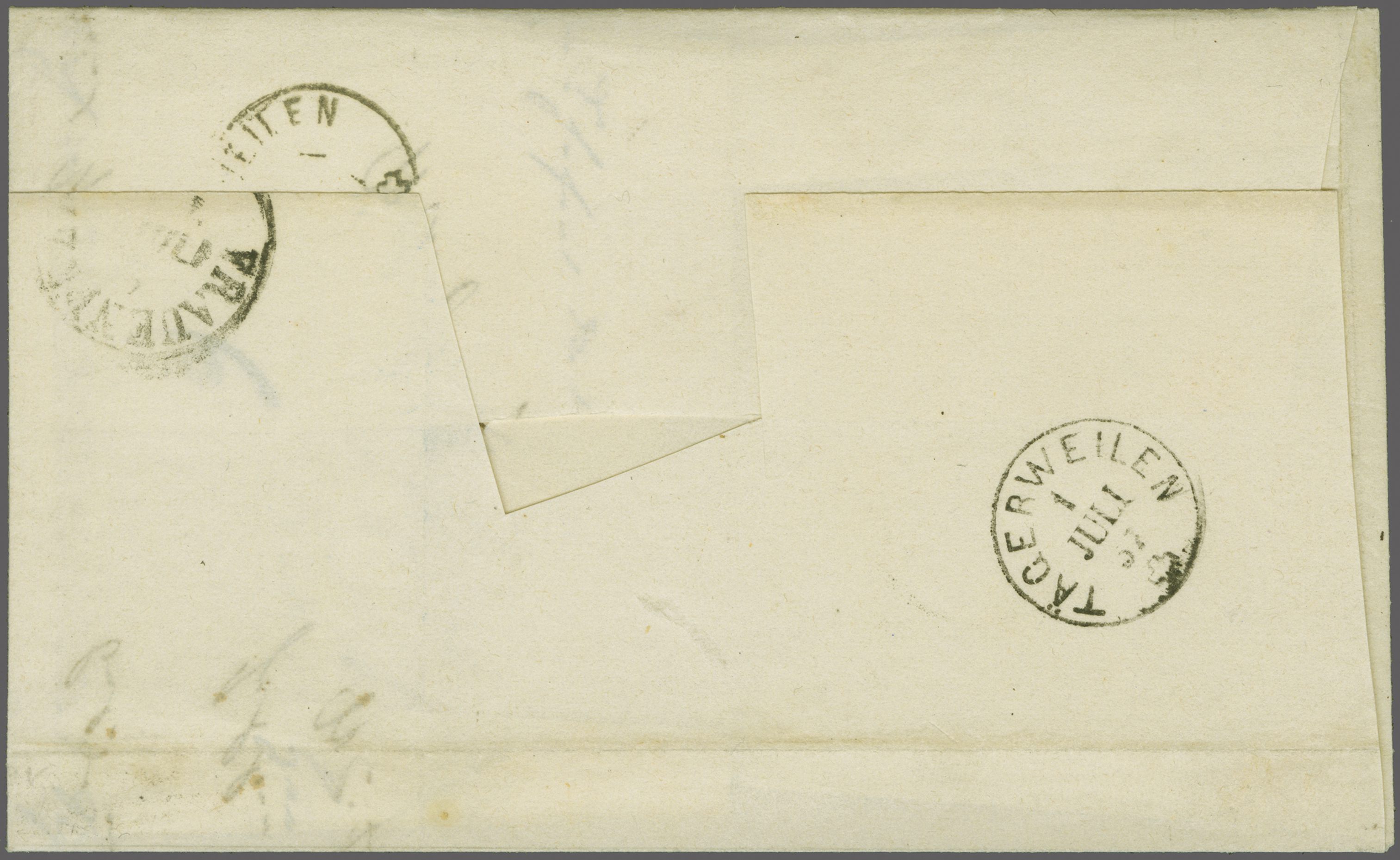 (AW 1195) in schwarz, nebenges. wiederholt, auf Faltbrief im 2. Briefkreis (unvollständig, Marke gelöst und etwas versetzt zurückgeklebt) nach Tobel (AR). Rücks. Transitstp. "TÄGERWEILEN" und "FRAUENFELD". Eine seltene Marke; Atteste Eichele (2007)