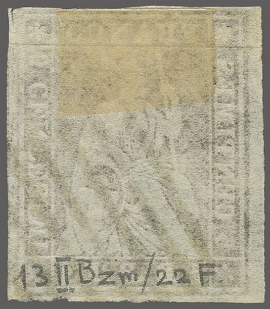 5 Rp. mattbraun auf dünnem Münchner Papier, farbfr. und weiss- bis überrandig von der Bogenecke rechts oben und mit Teilen der linken Nachbarmarke, klar und übergehend entw. mit schwarzer 11-liniger Raute mit nebenges.