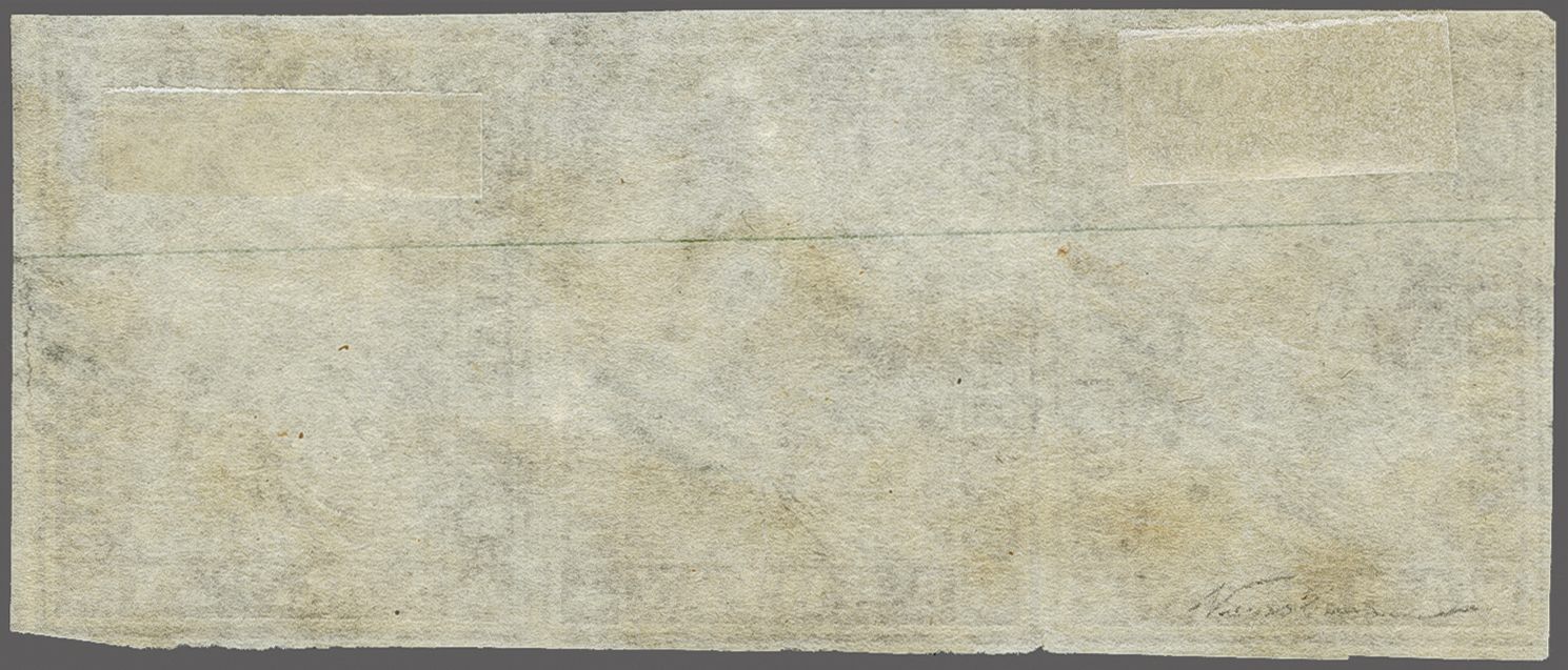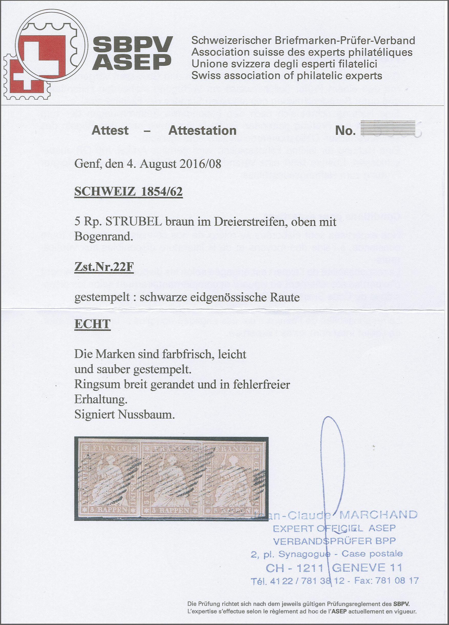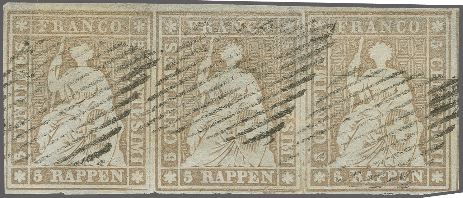 5 Rp. mattgraubraun auf dünnem Münchner Papier im waagr. Dreierstreifen vom oberen Bogenrand, farbfr. und allseits weissrandig, je zart entw. mit schwarzer eidg. Raute. Seltene und ansprechende Einheit. Signiert Nussbaum;