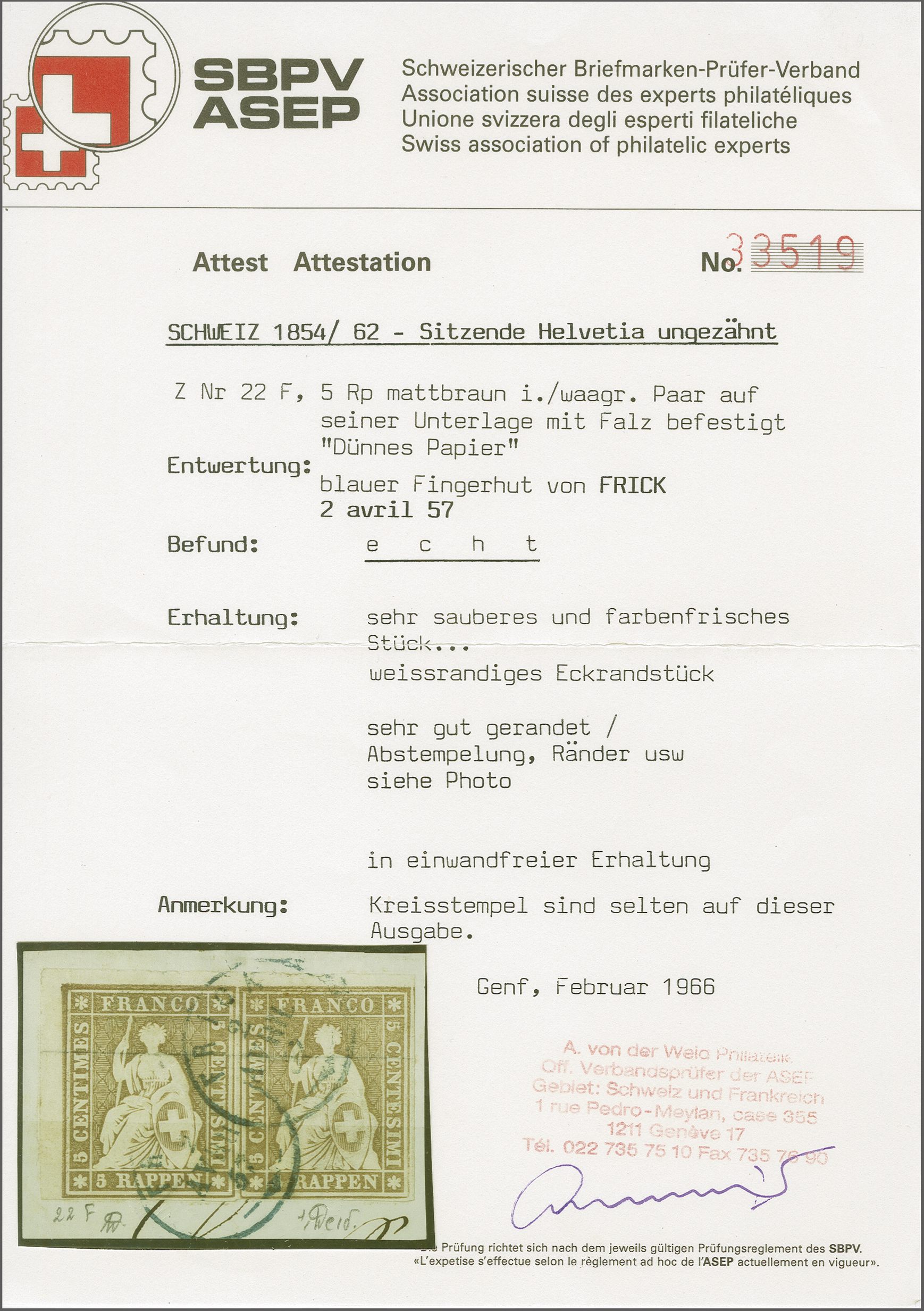 5 Rp. mattbraun auf dünnem Münchner Papier, waagrechtes Paar, farbfr. und voll- bis weissrandig von der Bogenecke links oben, zart und übergehend entw. mit zwei Abschlägen des blauen Fingerhutstp. "FRICK 2 AVRIL 57", auf
