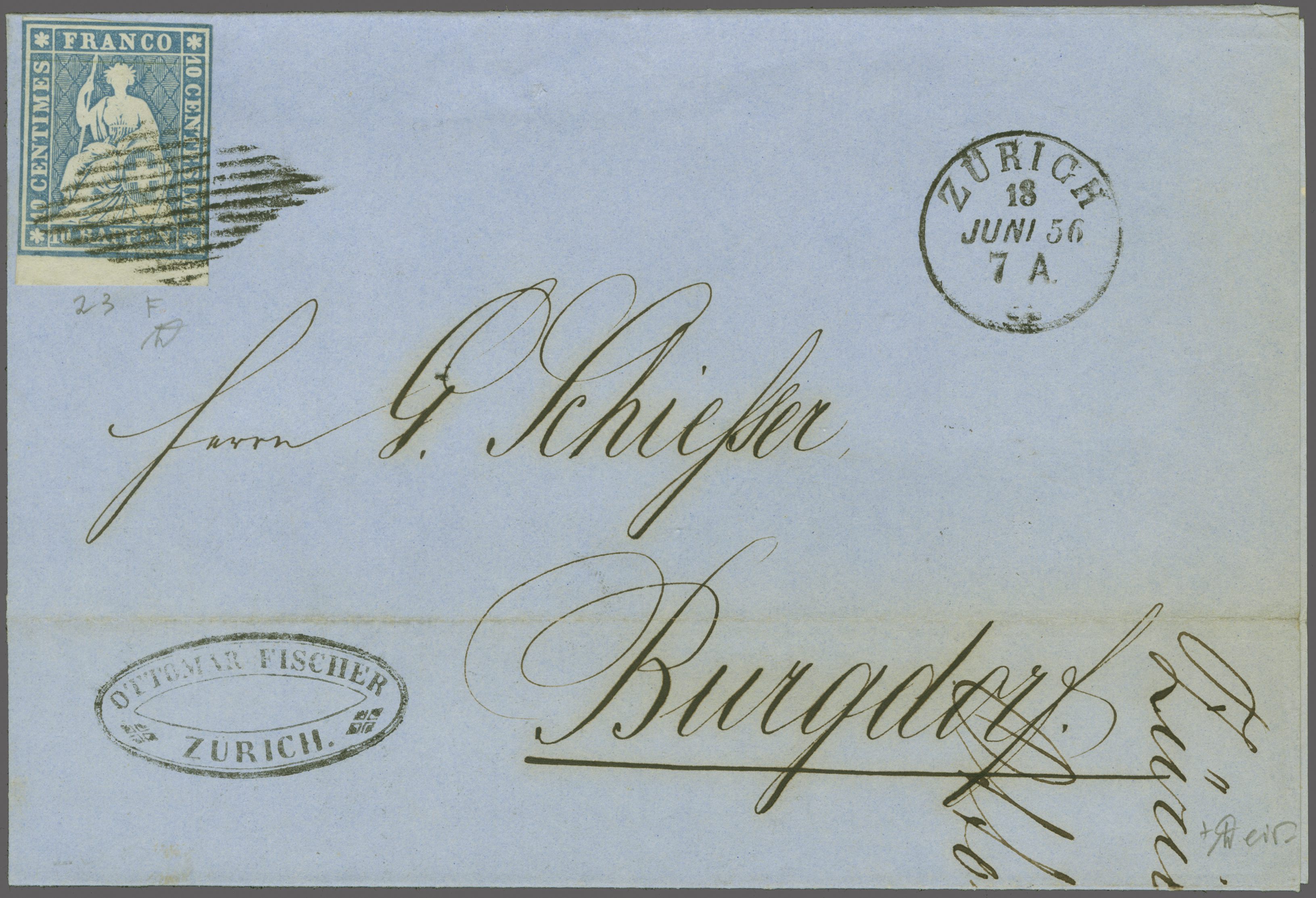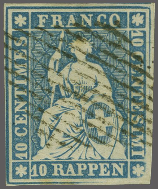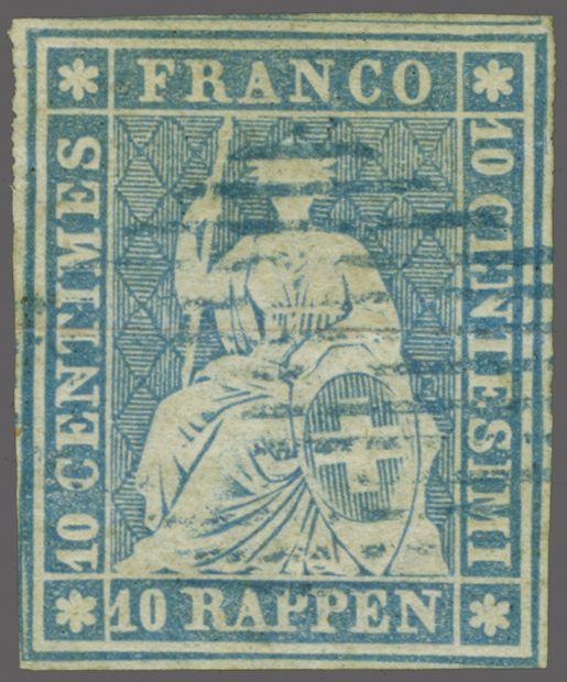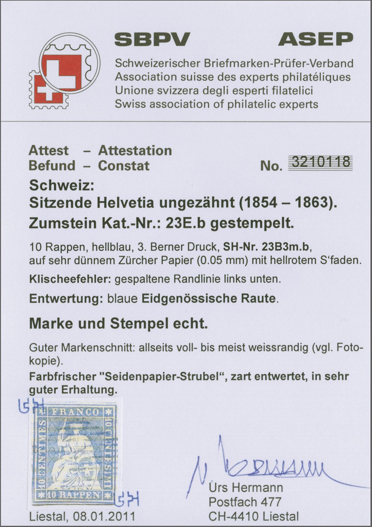 10 Rp. lebhaftpreussischblau auf dünnem Zürcher Papier mit Klischeefehler "gespaltene Randlinie" links unten, farbfr. und voll- bis meist weissrandig, zart entw. mit blauer eidg. Raute. Befund Hermann (2011). SH: 23B3m,