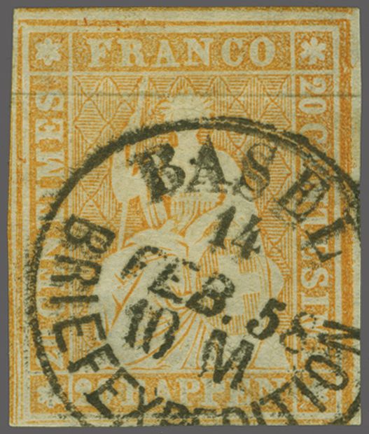 20 Rp. gelblichorange mit Schmitzdruck der rechten Randlinie, farbfr. und allseits weissrandig mit Ansatz zweier Nebenmarken, klar entw. mit Elzevir-Einkreisstp. "BASEL BRIEFEXPEDITION 14 FEB. 58 10 M" in schwarz. Befund