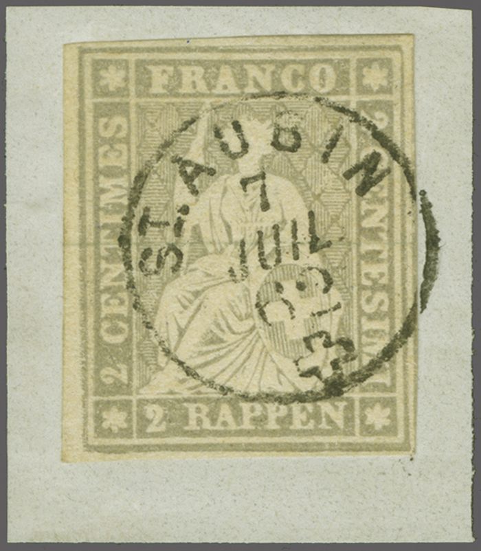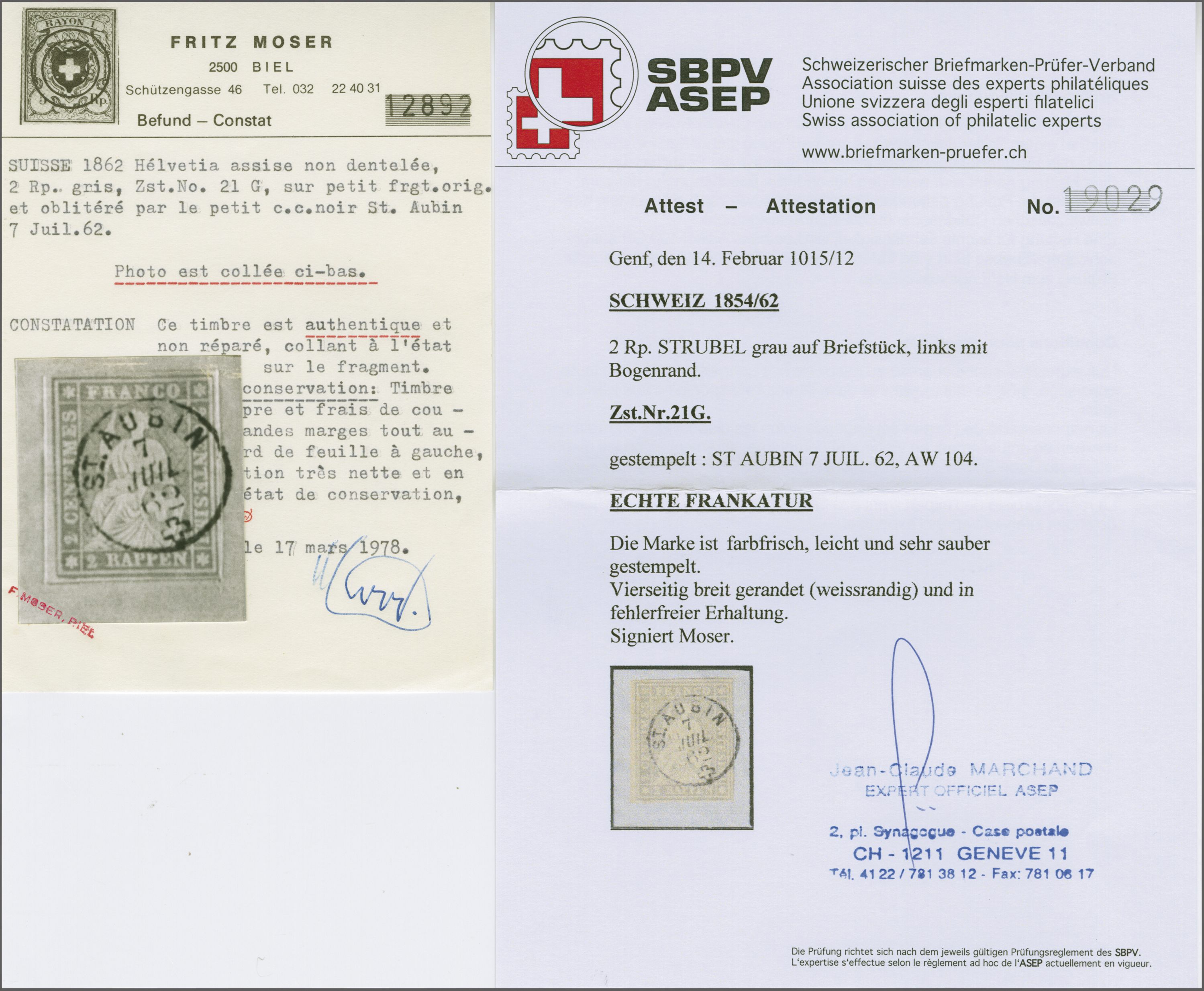 2 Rp. grau, farbfr. und weissrandiges Luxusstück mit Bogenrand links und Teilen zweier Nebenmarken, klar und übergehend entw. mit schwarzem Fingerhutstempel "ST. AUBIN 7 JUIL 62" auf kl. Briefstück. Befund Moser (1978); Attest