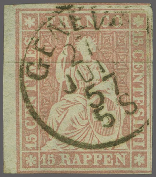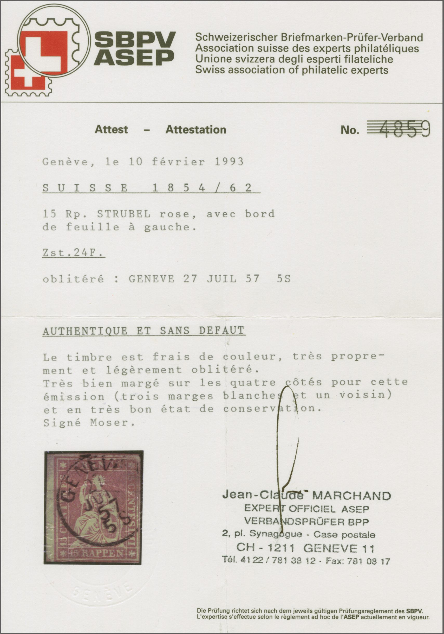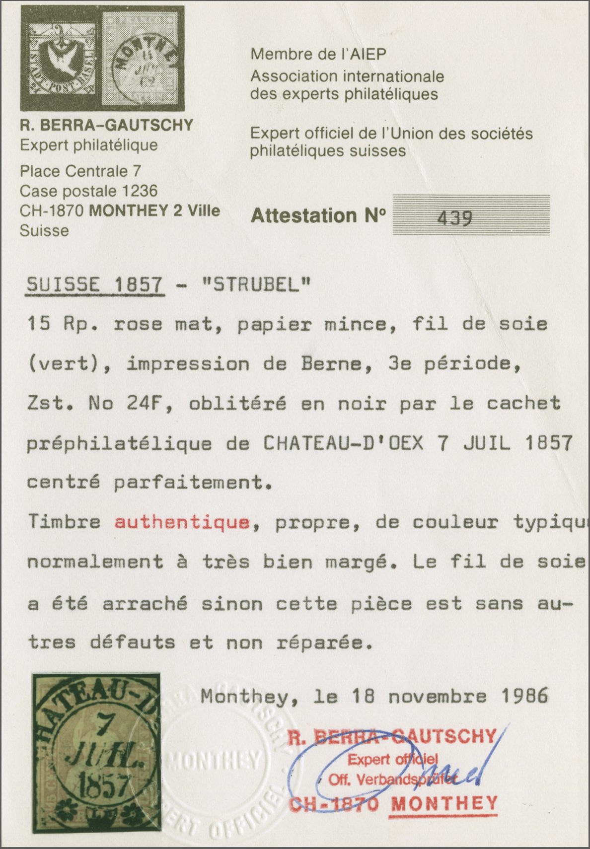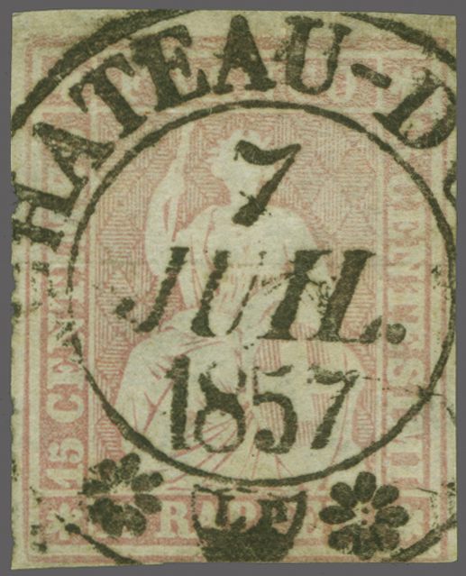 15 Rp. rötlichkarmin, farbfr. und allseits weissrandig mit Bogenrand oben (Seidenfaden ausgezogen), ideal klar und zentrisch entwertet mit grossem Zierkreisstempel "CHATEAU-D'OEX 7 JUIL 1857" (AW 5149) in schwarz. Eine