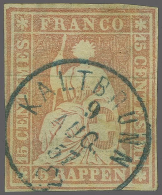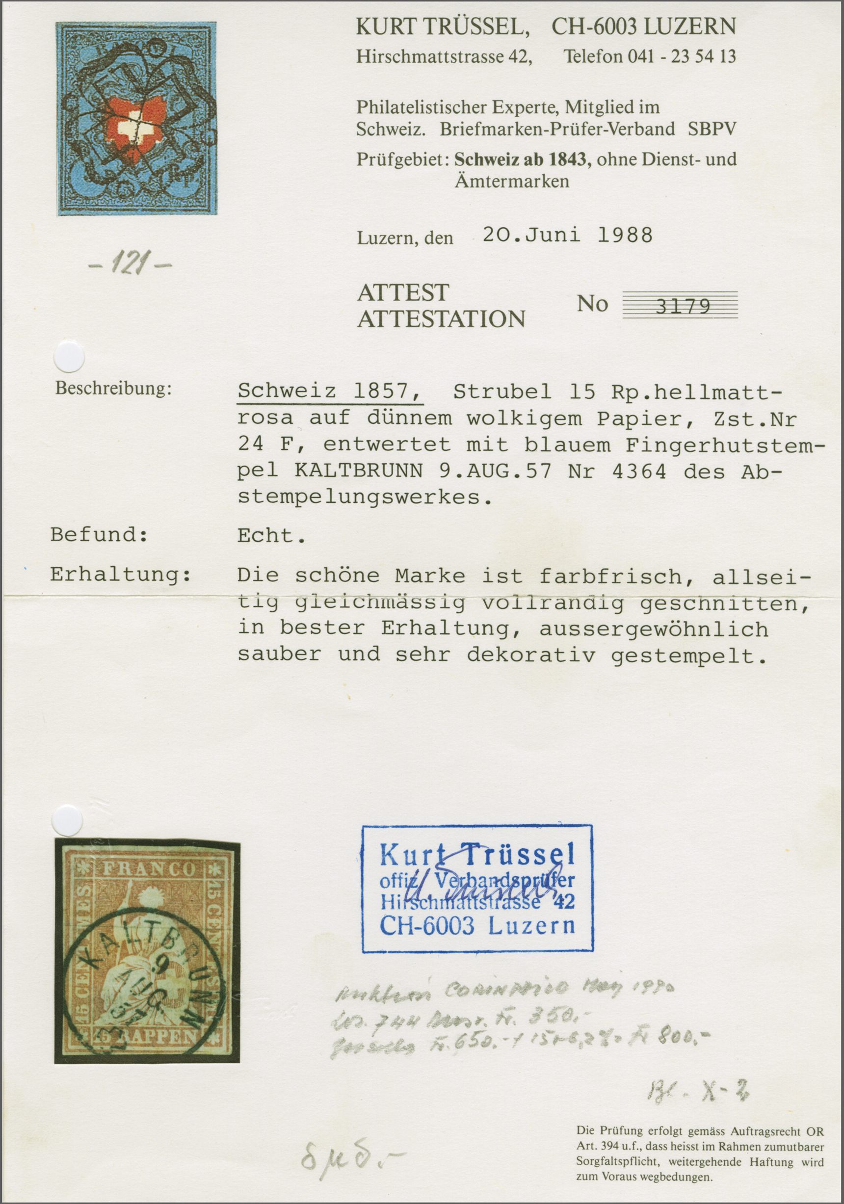 15 Rp. rötlichkarmin mit unvollständig ausgedruckter unterer Randlinie, farbfr. und allseits weissrandig, klar und dekorativ entw. mit Fingerhutstempel "KALTBRUNN 9 AUG 57" (AW 4364) in blau. Attest Trüssel (1988). Provenienz: