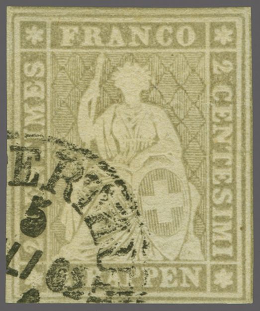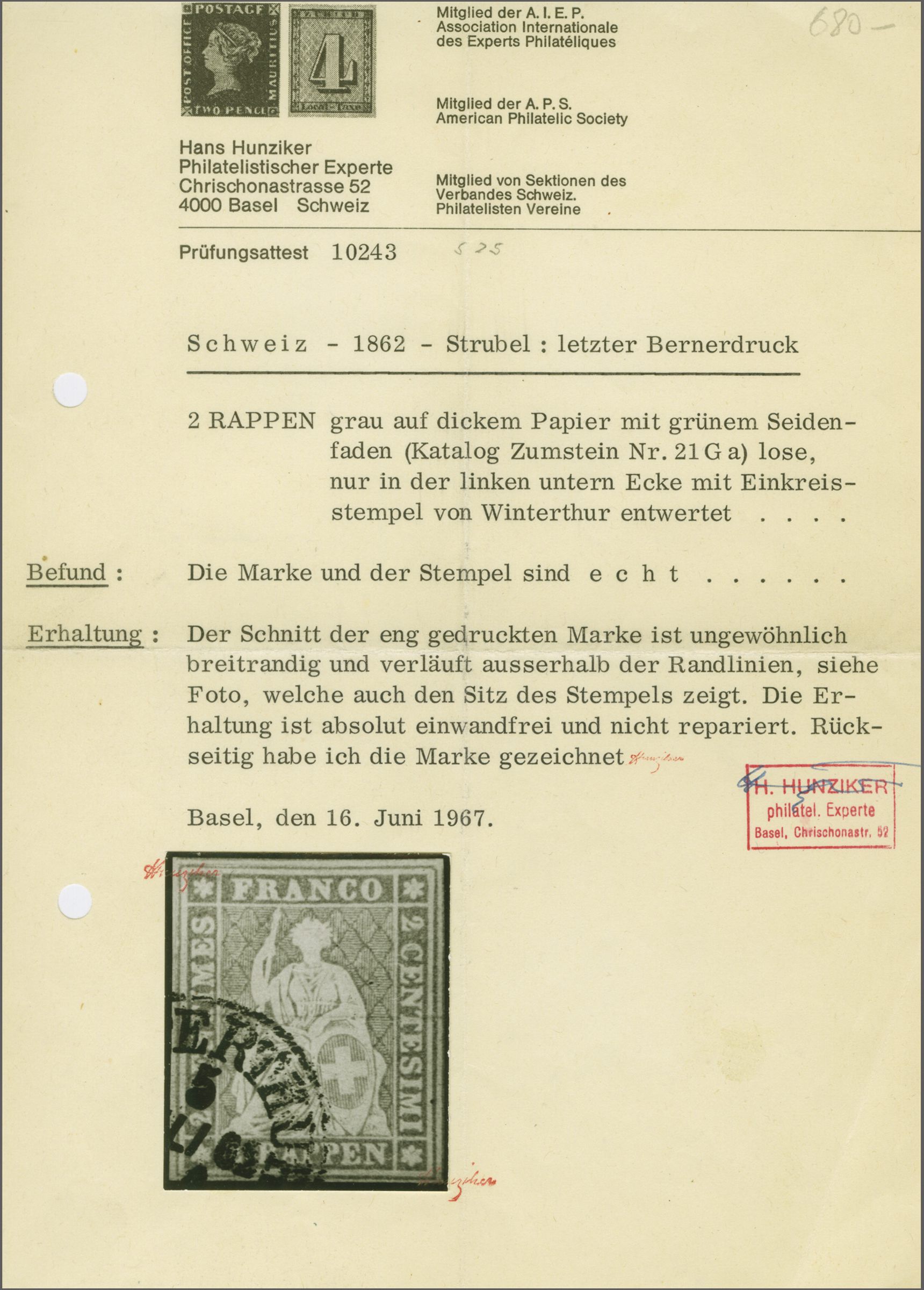 2 Rp. grau, für diese Druckperiode ein aussergewöhnlich breit geschnittenes allseits weissrandiges Stück mit Teilen einer Nachbarmarke, attraktiv und kopffrei entw. mit über dem Eck gesetzten Datumsstp. von Winterthur. Attest