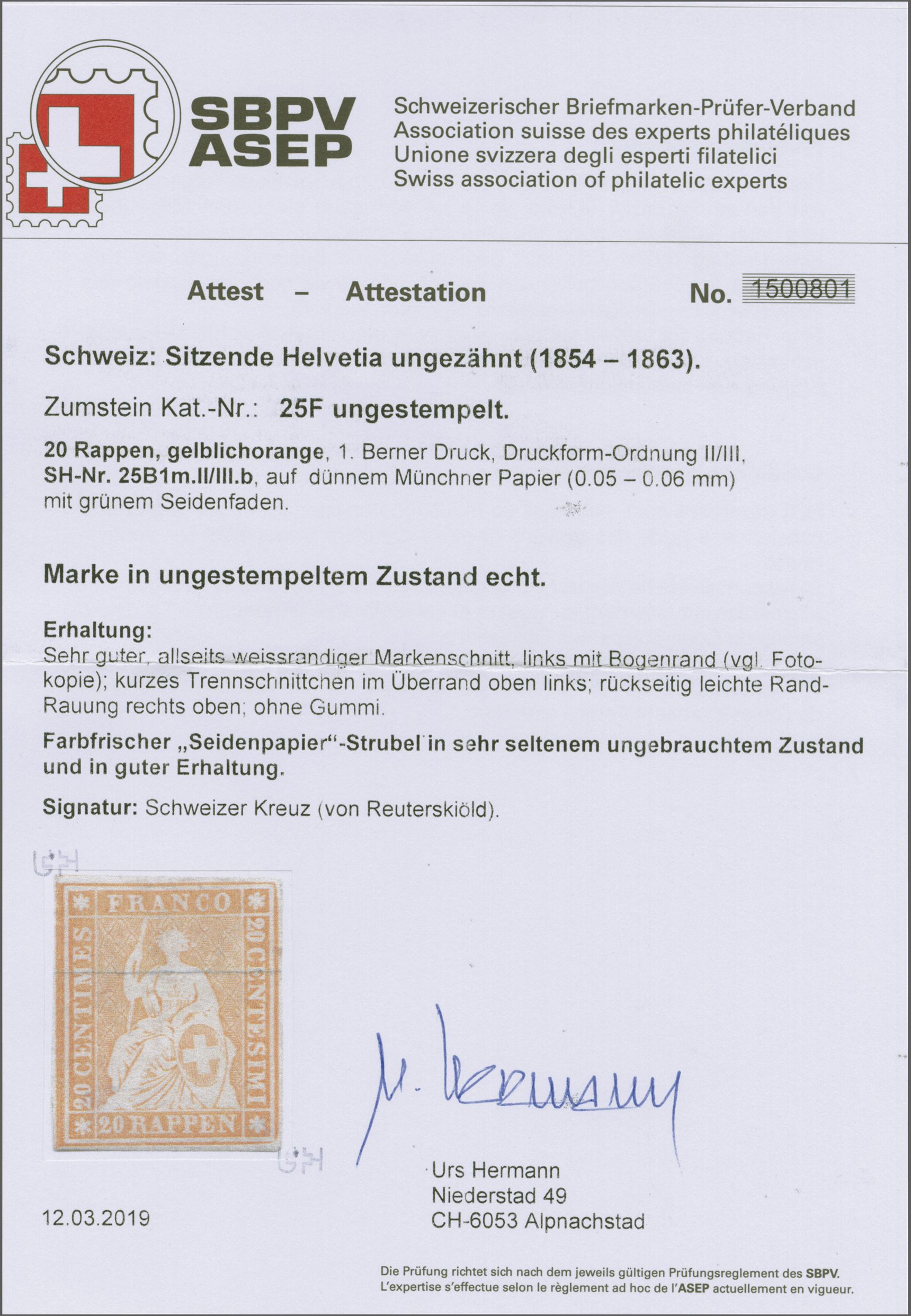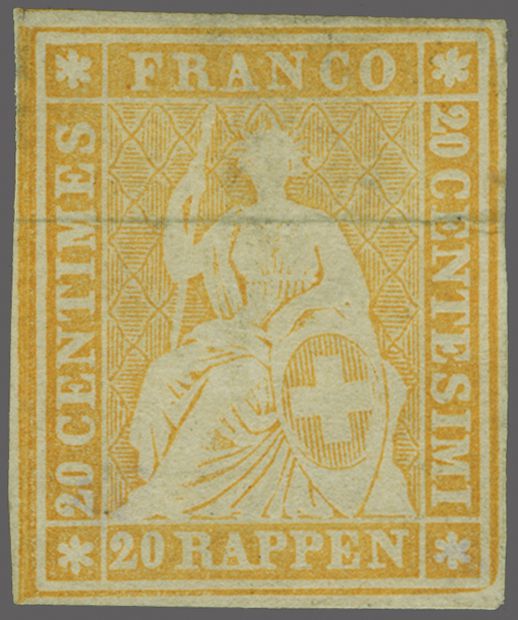 20 Rp. gelblichorange, farbfr. und voll- bis meist weissrandig (rücks. minimste Rauung, Vortrennschnittlein im Überrand rechts oben), ungebraucht ohne Gummierung. Eine seltene ungebrauchte Marke; signiert Reuterskiöld, Attest