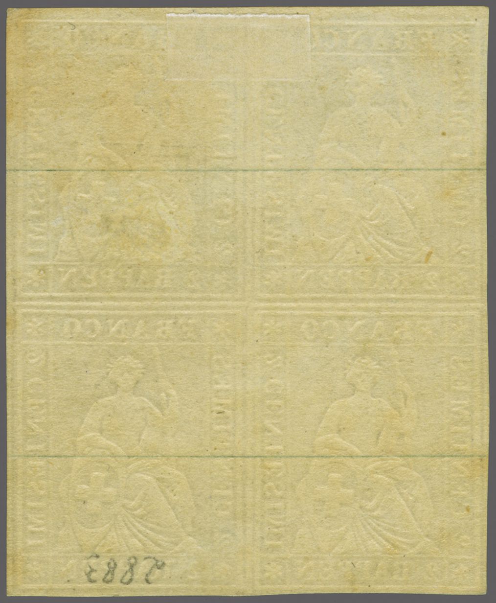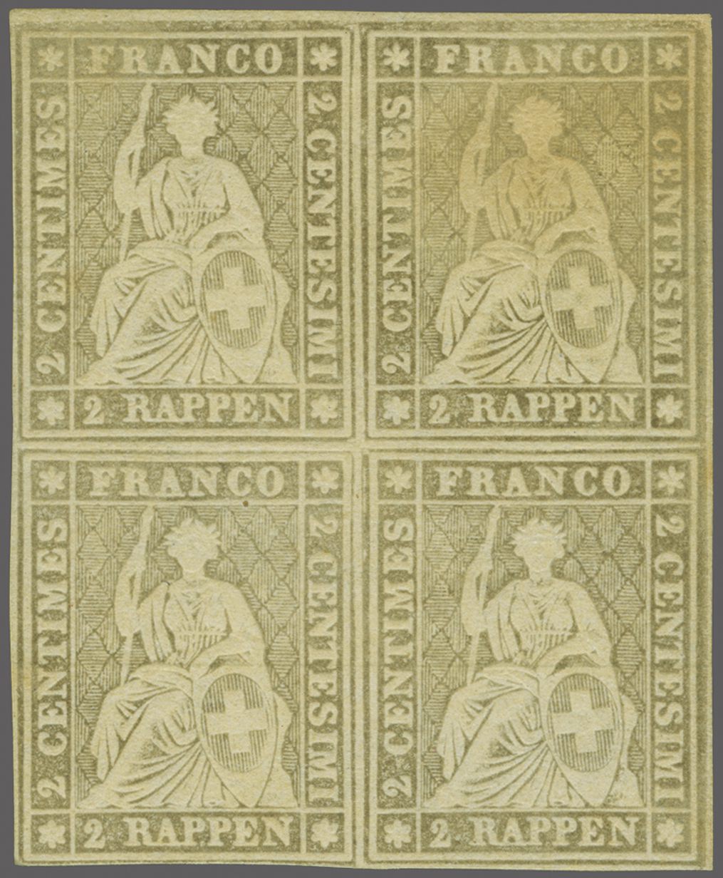 2 Rp. grau im Viererblock, farbfr. und voll- bis meist weissrandig mit Bogenrand oben, ungebraucht mit grossen Teilen der Originalgummierung. Rechte obere Marke mit minimer gummibedingter Bräunung, dennoch eine attraktive und