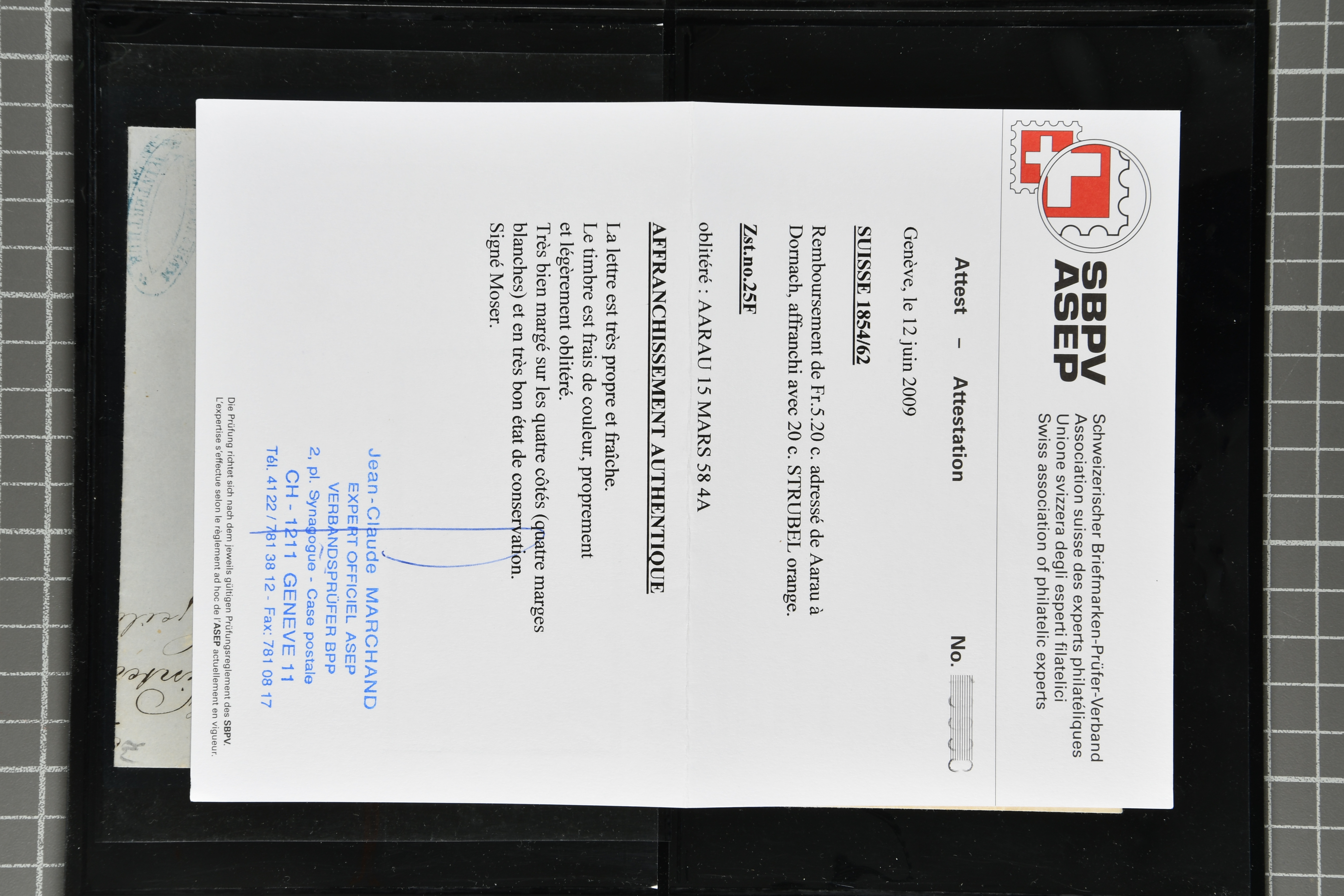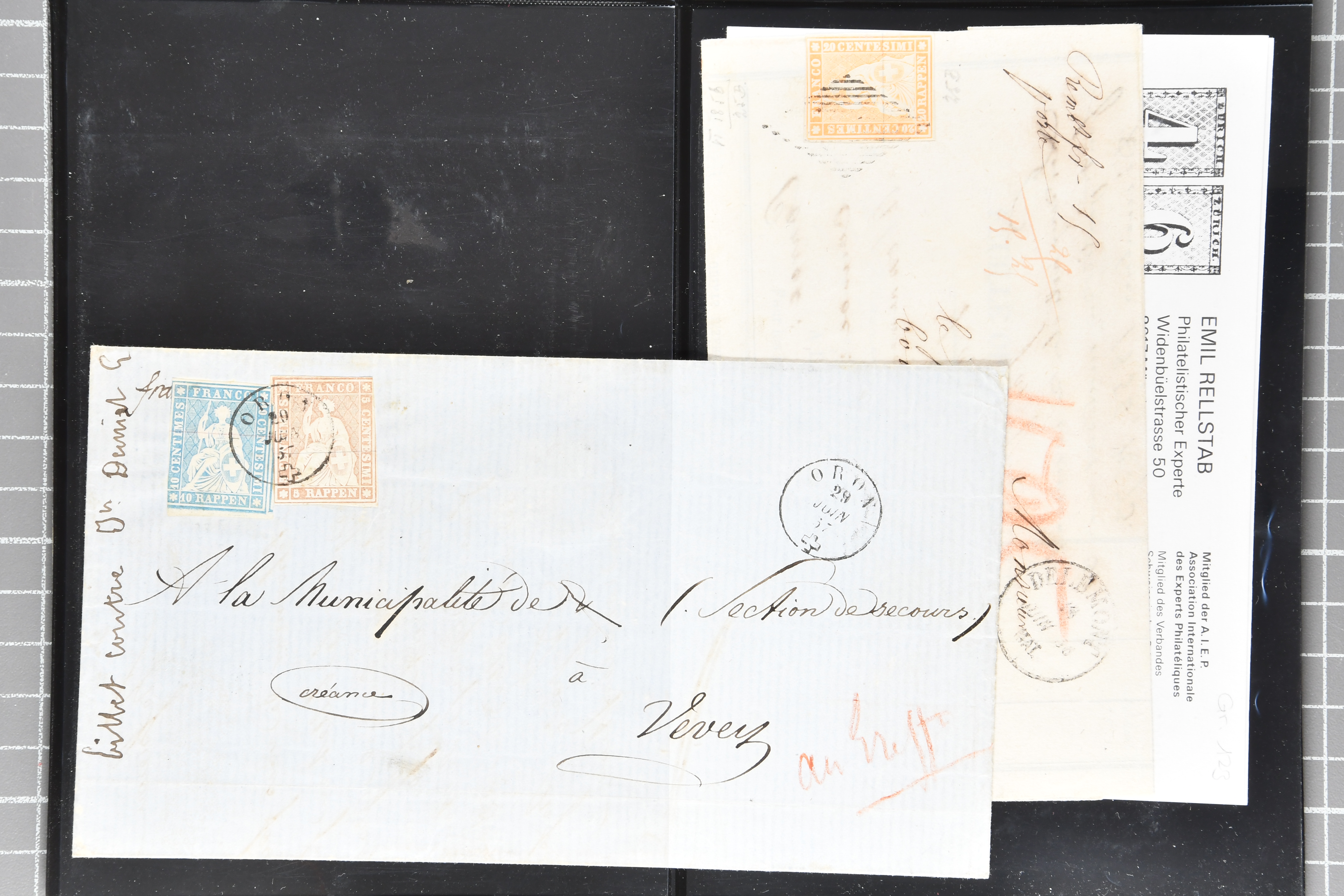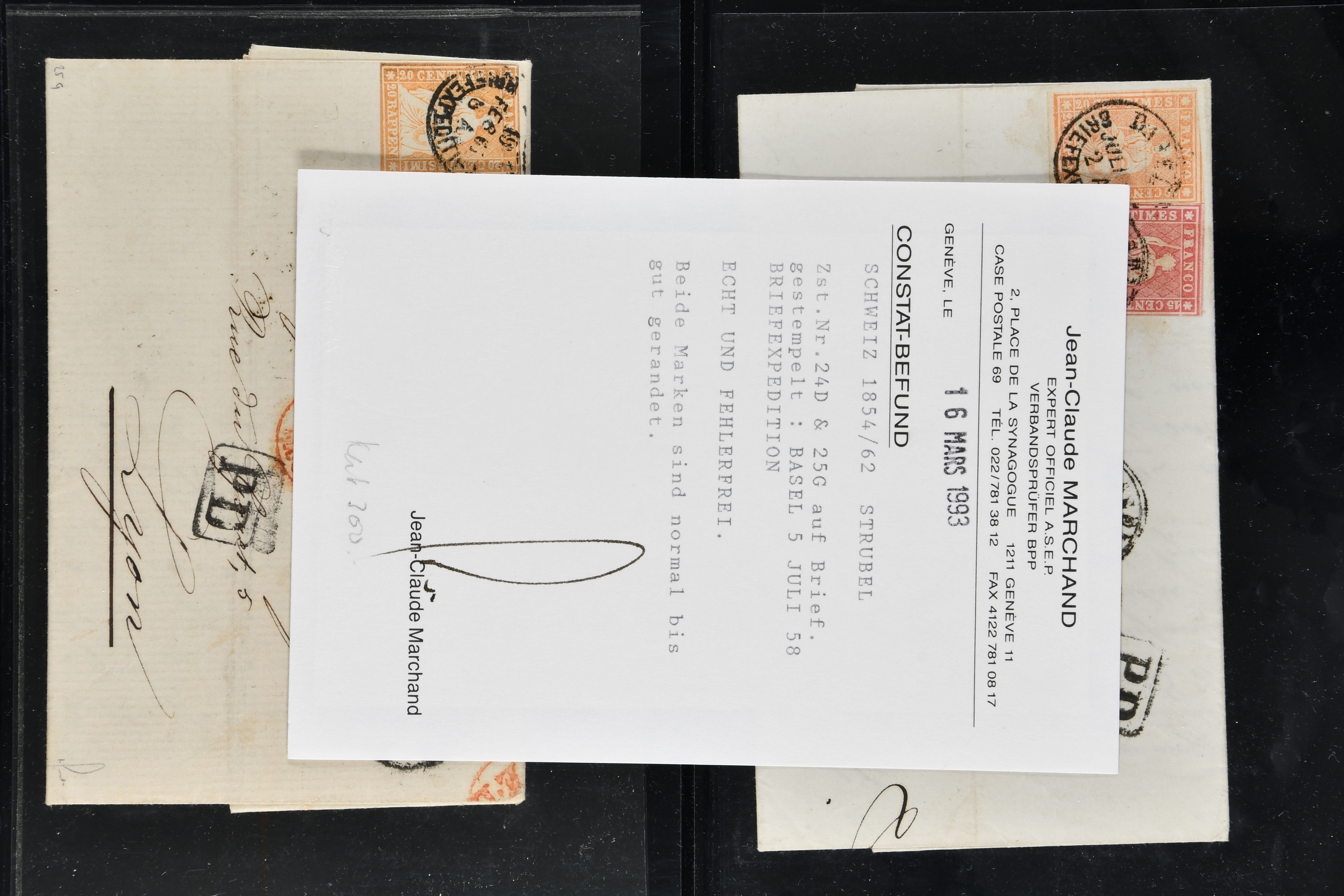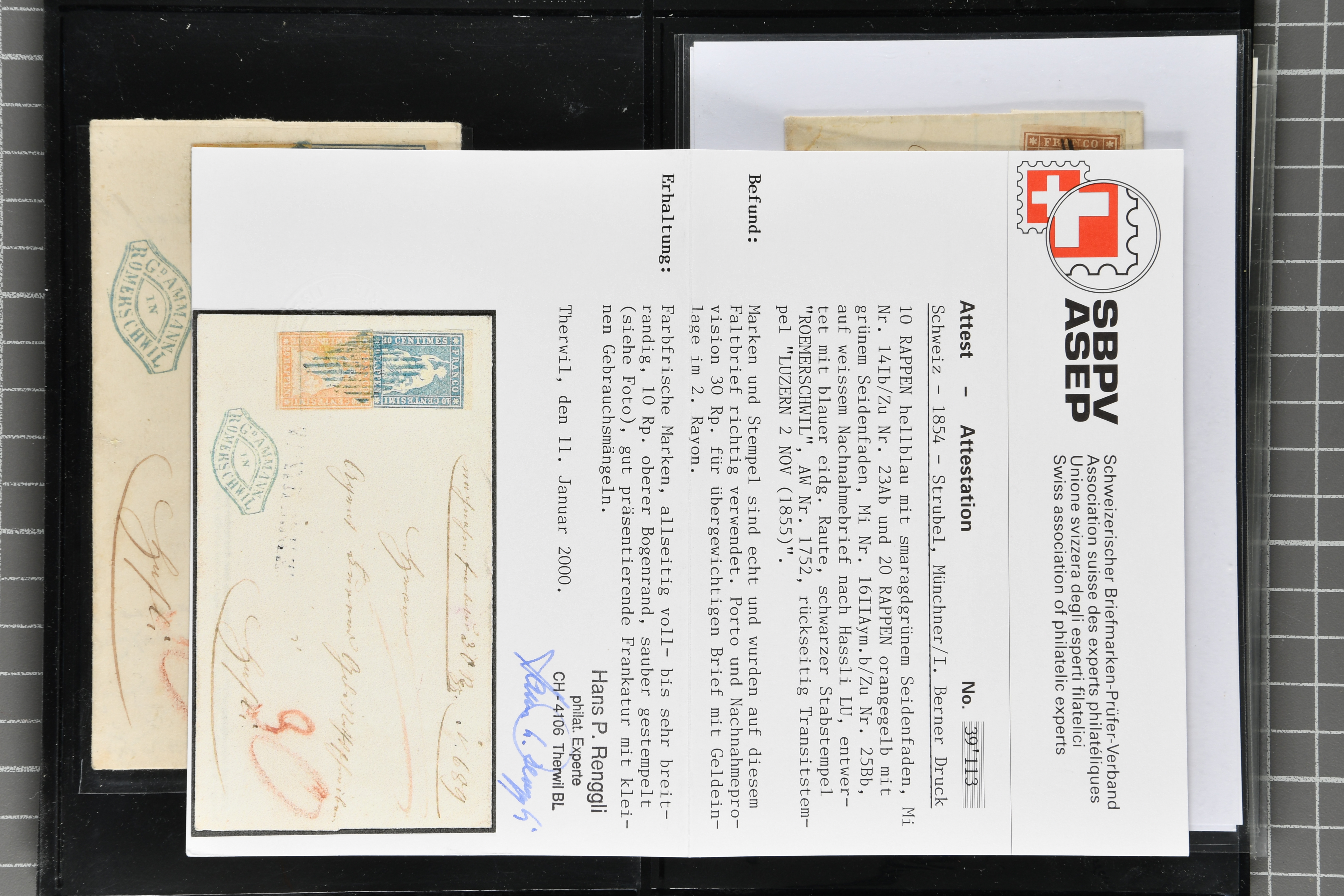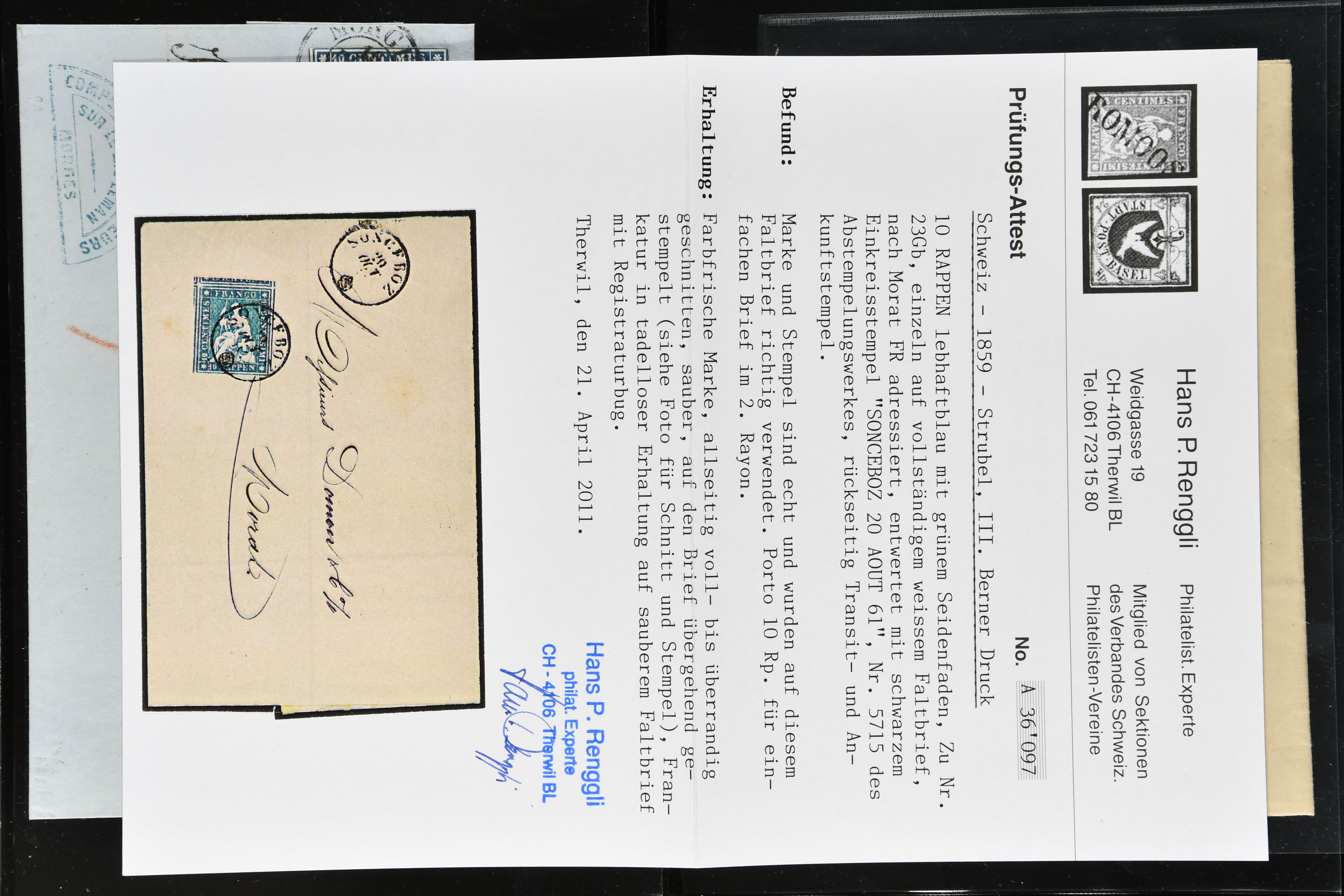 9784 cover image1854/62: Lot 26 Strubelfrankaturen. Dabei interessante Kombinationen wie 20 Rp. orange (SBK 25D) in seltener Mischfrankatur mit Sitzender Helvetia 10 Rp. blau (SBK 31) auf Faltbrief von Châtel-St-Denis nach Turin, Italien oder Dreifarbenfrankatur 5 Rp. braun, 10 Rp. blau und 15 Rp. karmin (SBK 22D+23Cc+24D) als 30 Rp. Porto für einen eingeschriebenen Brief im 3. Briefkreis von Lausanne nach Wikon, seltene Auflagen wie 10 Rp. lebhaftpreussischblau auf dünnem Zürcher Papier (SBK 23E/SH 23B3m) mit breitem Bogenrand rechts auf Faltbrief im 2. Briefkreis von Fleurier nach Neuchâtel, Einzelfrankaturen früher Druckperioden, Marken mit breiten Bogenrändern oder eine Handvoll Auslandsfrankaturen nach Deutschland, Frankreich oder Italien. Unterschiedliche Erhaltung; zwei Befunde, drei Atteste. SBK=CHF 7'000+ (Image 1) (Image 2) (Image 3) (Image 4) (Image 5) (Image 6) (Image 7) (Image 8) (Image 9) (Image 10) (Image 11) (Image 12) (Image 13) (Image 14) (Image 15) (Image 16)