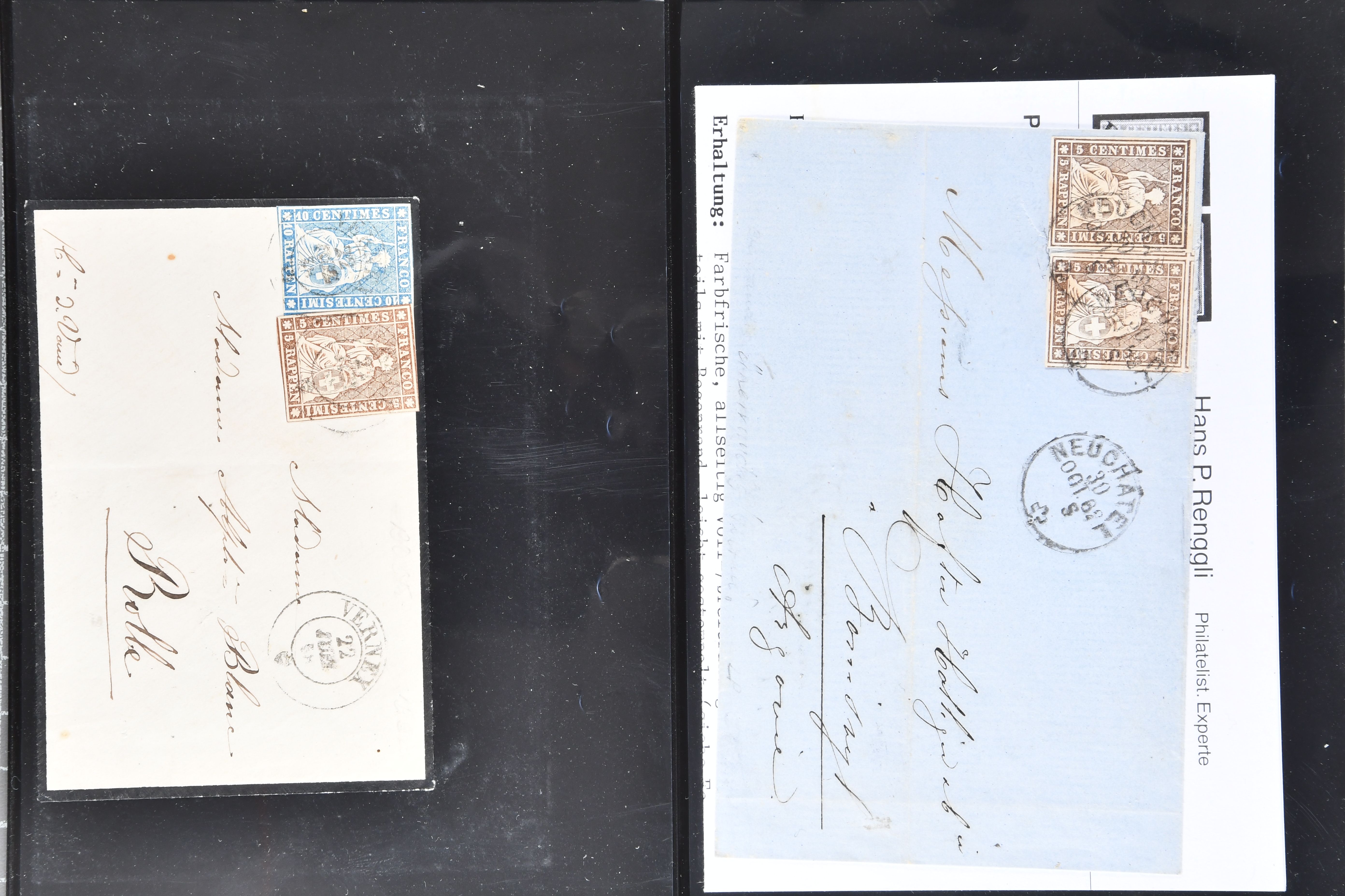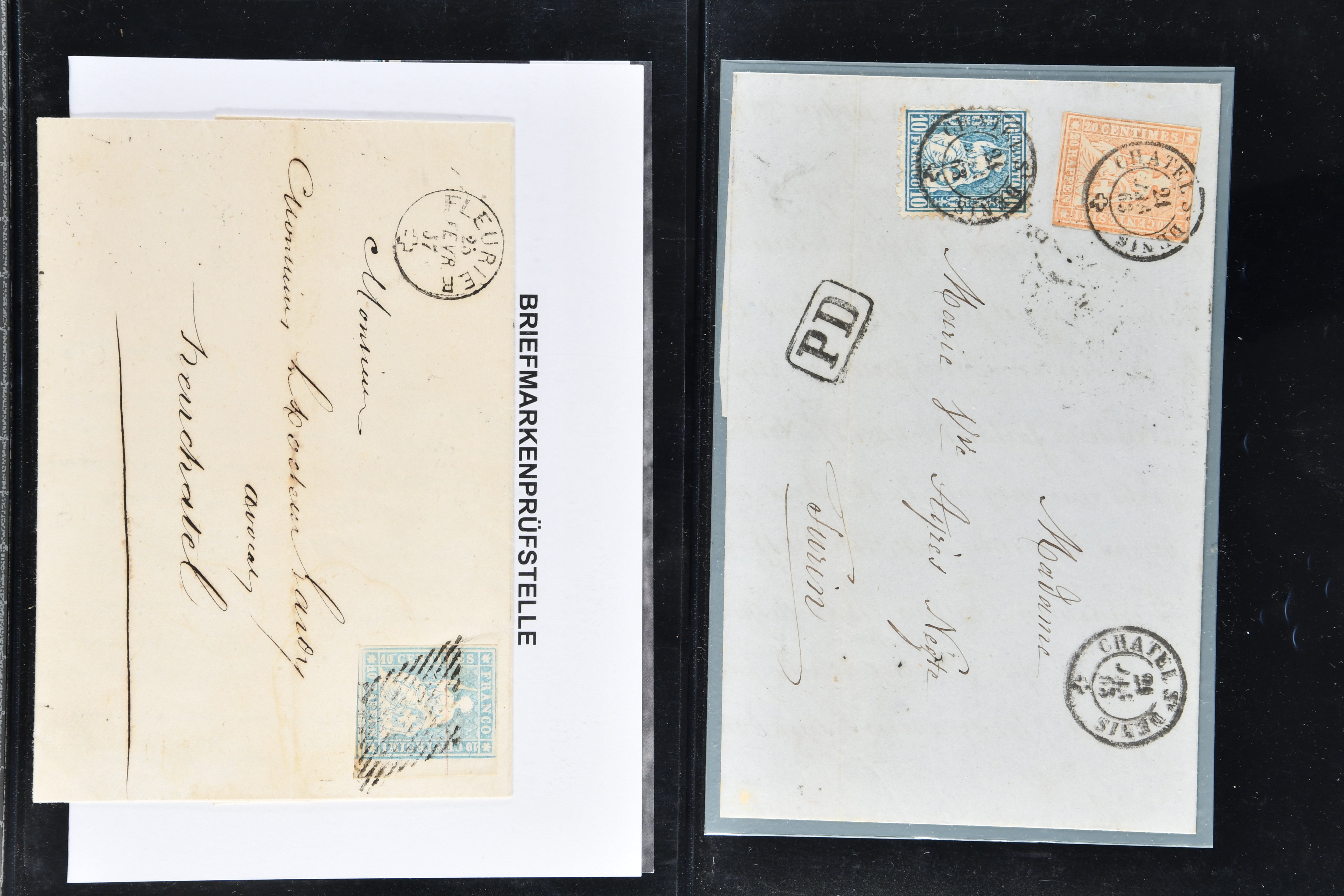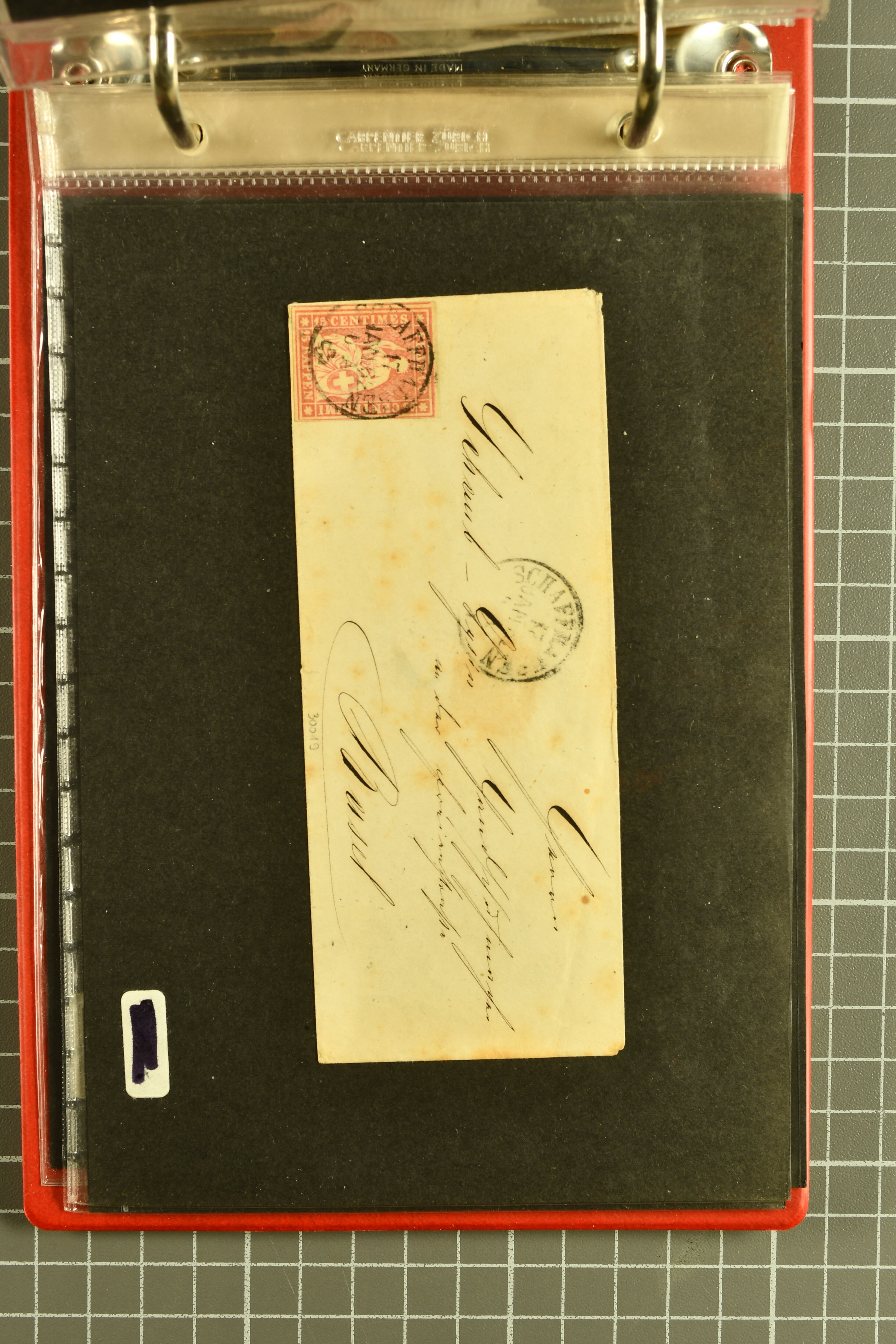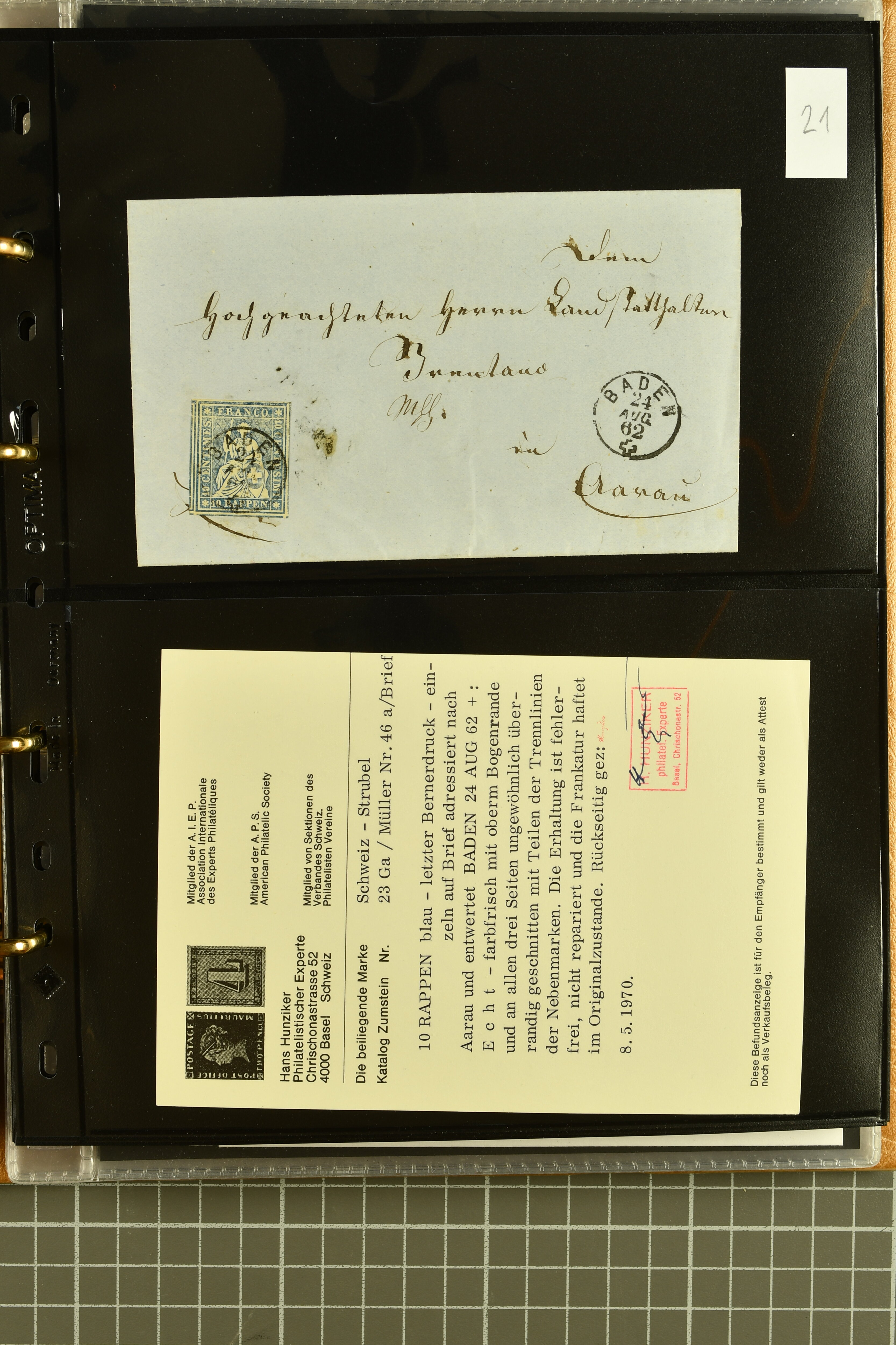 9784 cover image1854/62: Lot 26 Strubelfrankaturen. Dabei interessante Kombinationen wie 20 Rp. orange (SBK 25D) in seltener Mischfrankatur mit Sitzender Helvetia 10 Rp. blau (SBK 31) auf Faltbrief von Châtel-St-Denis nach Turin, Italien oder Dreifarbenfrankatur 5 Rp. braun, 10 Rp. blau und 15 Rp. karmin (SBK 22D+23Cc+24D) als 30 Rp. Porto für einen eingeschriebenen Brief im 3. Briefkreis von Lausanne nach Wikon, seltene Auflagen wie 10 Rp. lebhaftpreussischblau auf dünnem Zürcher Papier (SBK 23E/SH 23B3m) mit breitem Bogenrand rechts auf Faltbrief im 2. Briefkreis von Fleurier nach Neuchâtel, Einzelfrankaturen früher Druckperioden, Marken mit breiten Bogenrändern oder eine Handvoll Auslandsfrankaturen nach Deutschland, Frankreich oder Italien. Unterschiedliche Erhaltung; zwei Befunde, drei Atteste. SBK=CHF 7'000+ (Image 1) (Image 2) (Image 3) (Image 4) (Image 5) (Image 6) (Image 7) (Image 8) (Image 9) (Image 10) (Image 11) (Image 12) (Image 13) (Image 14) (Image 15) (Image 16)