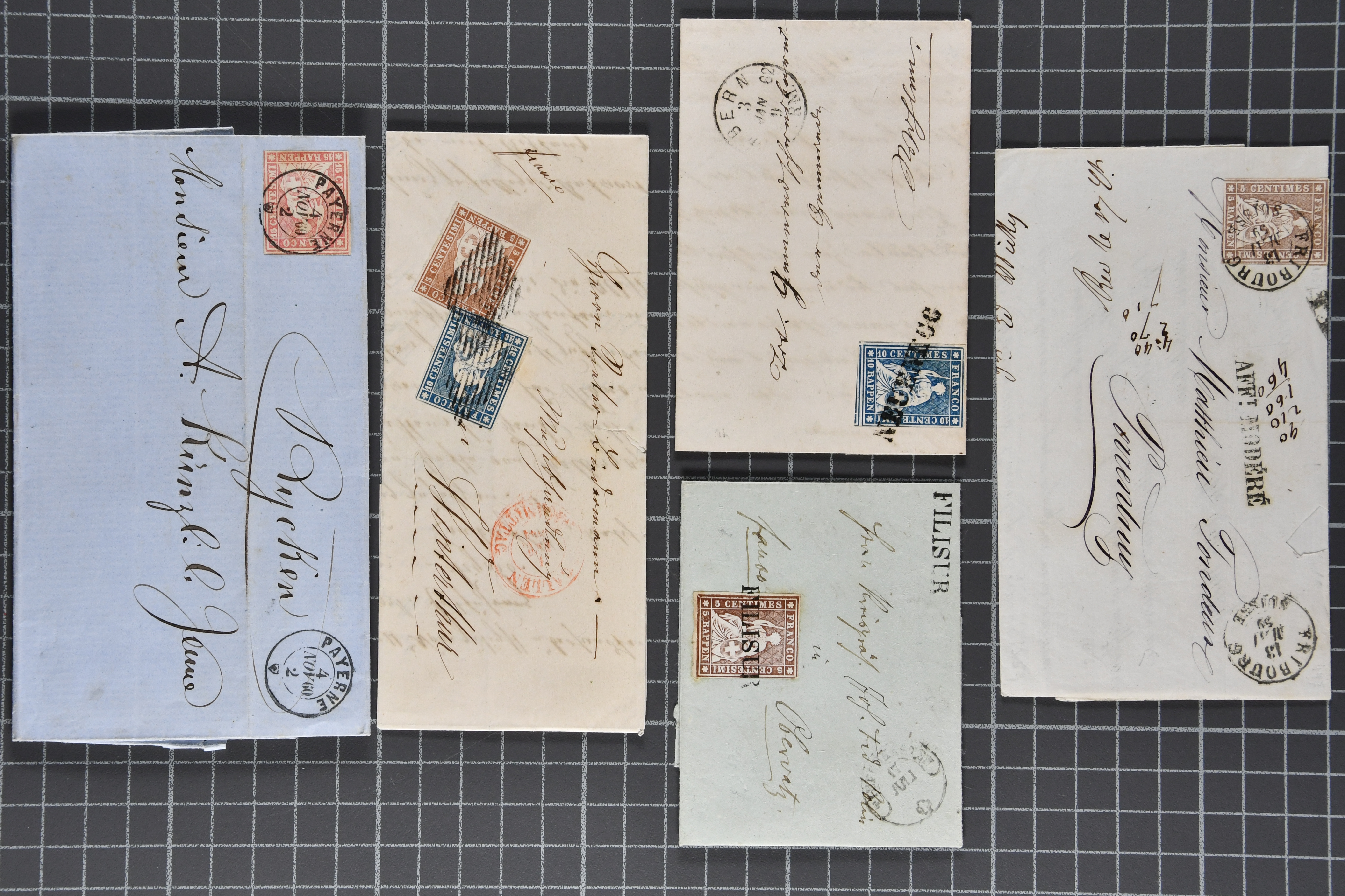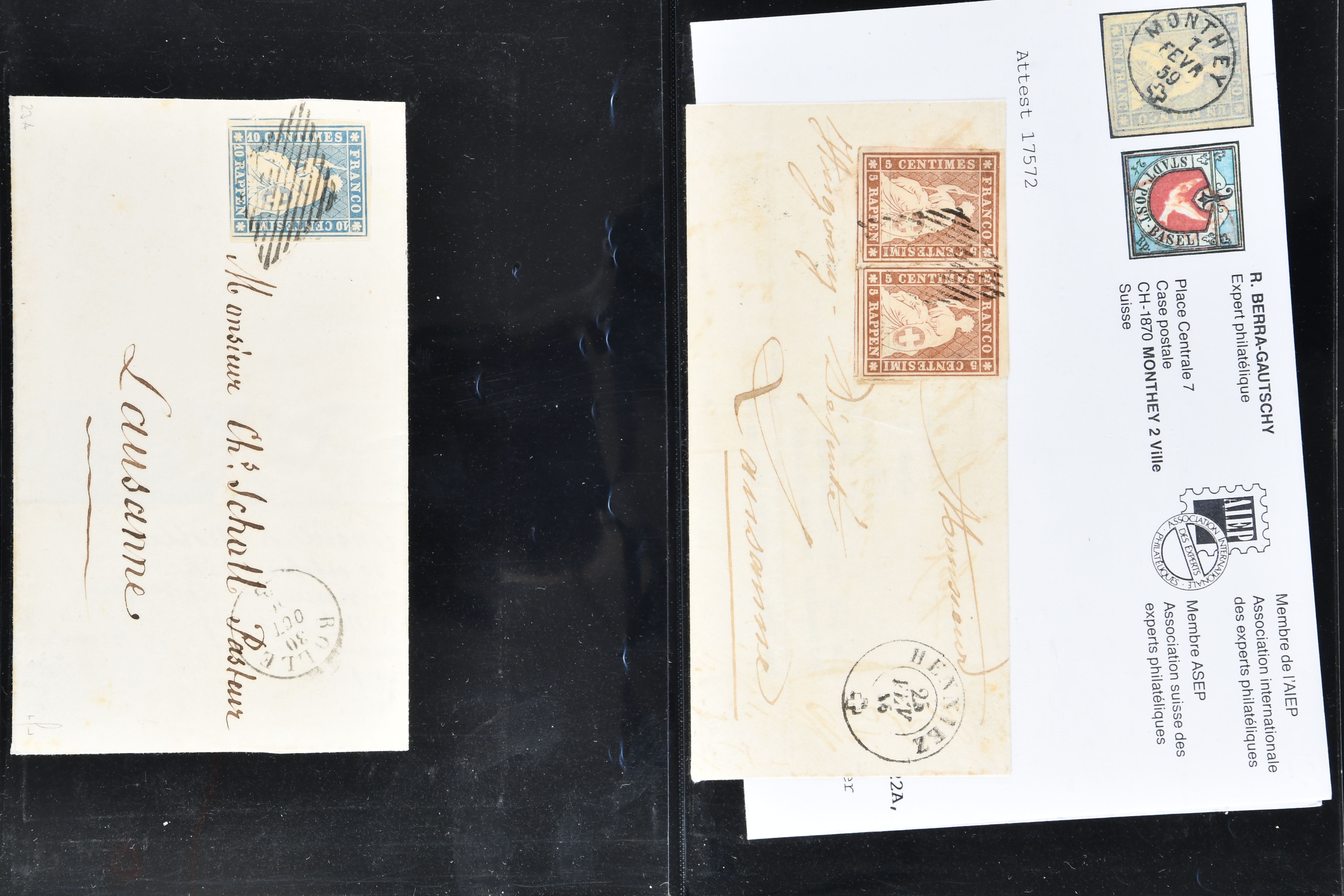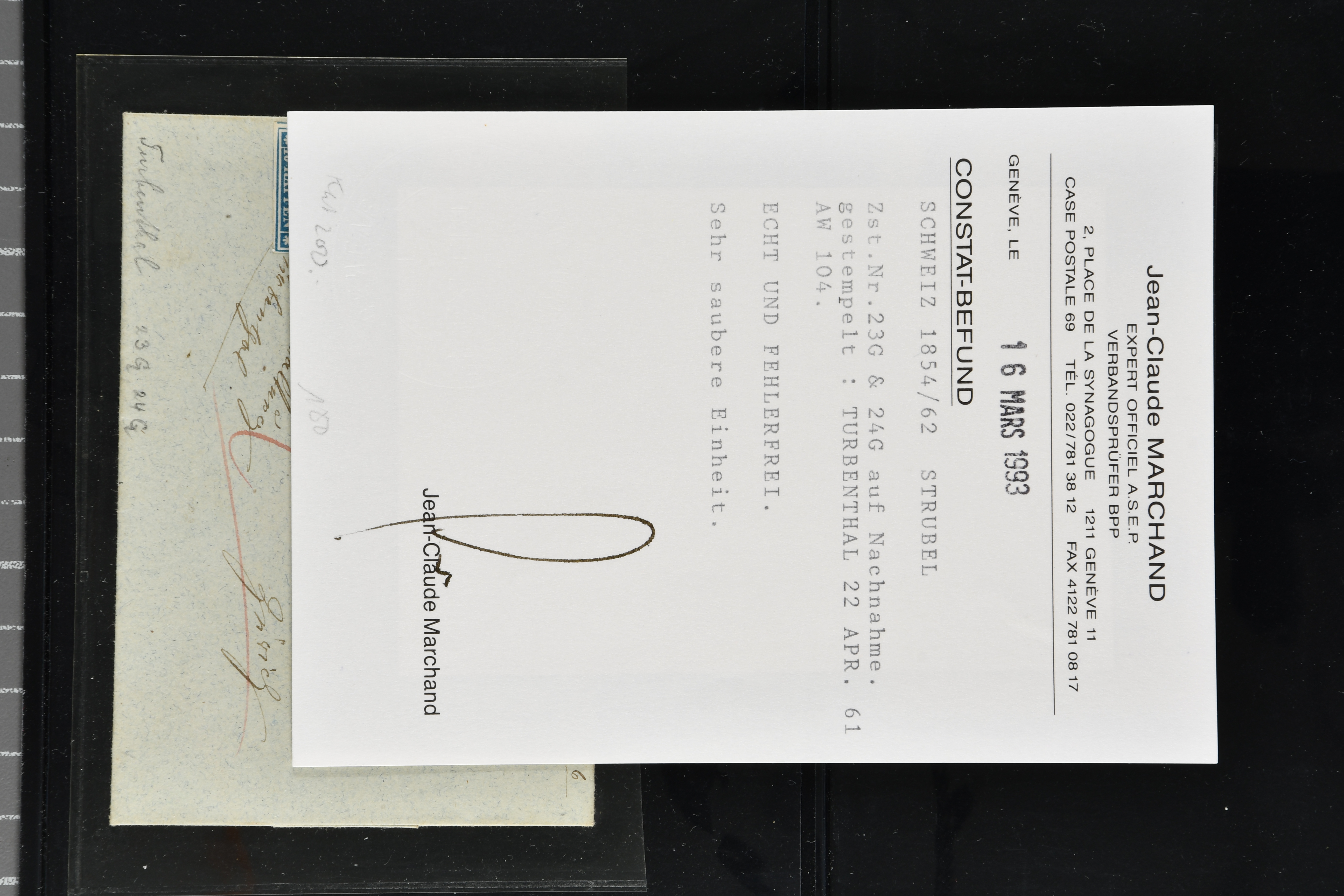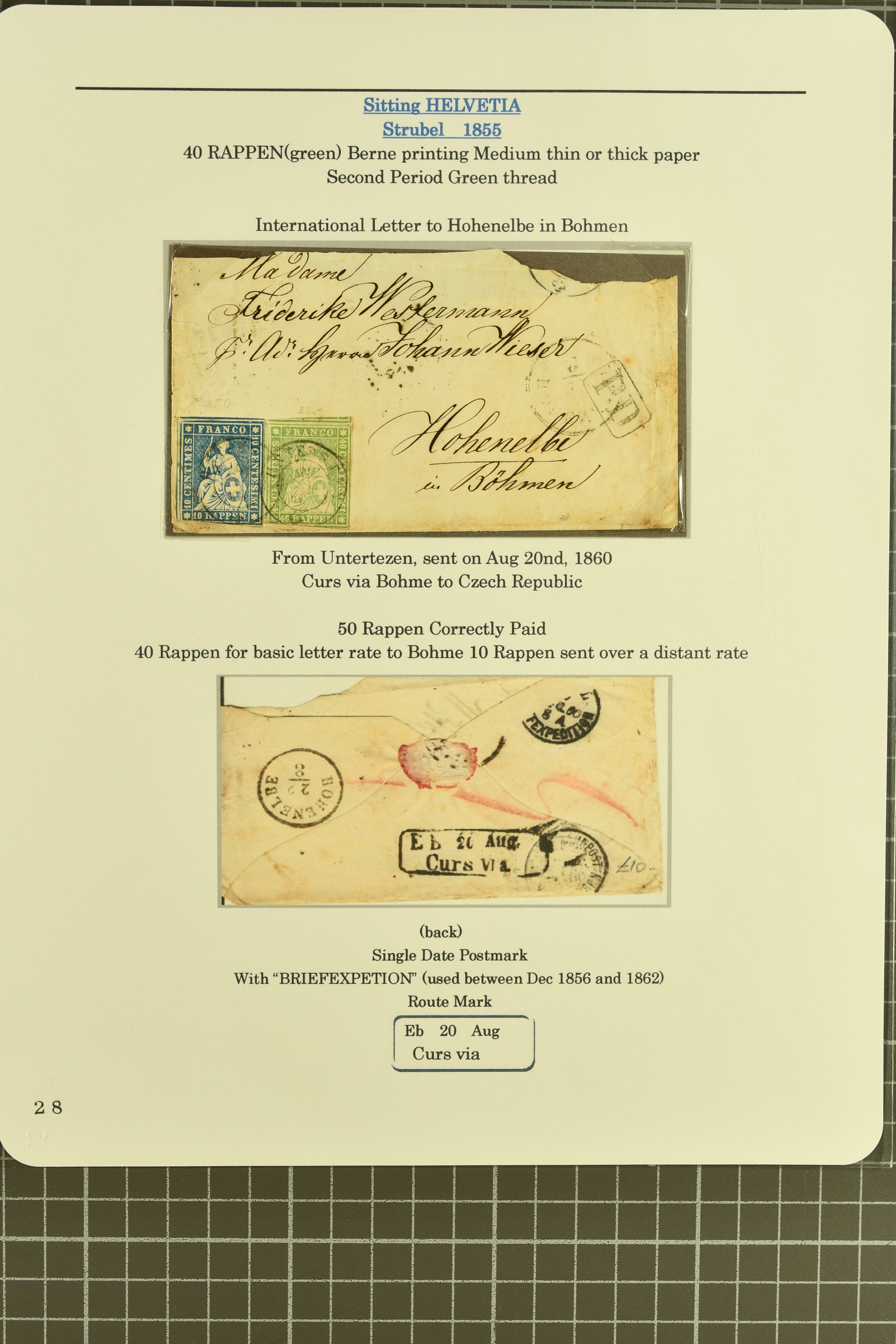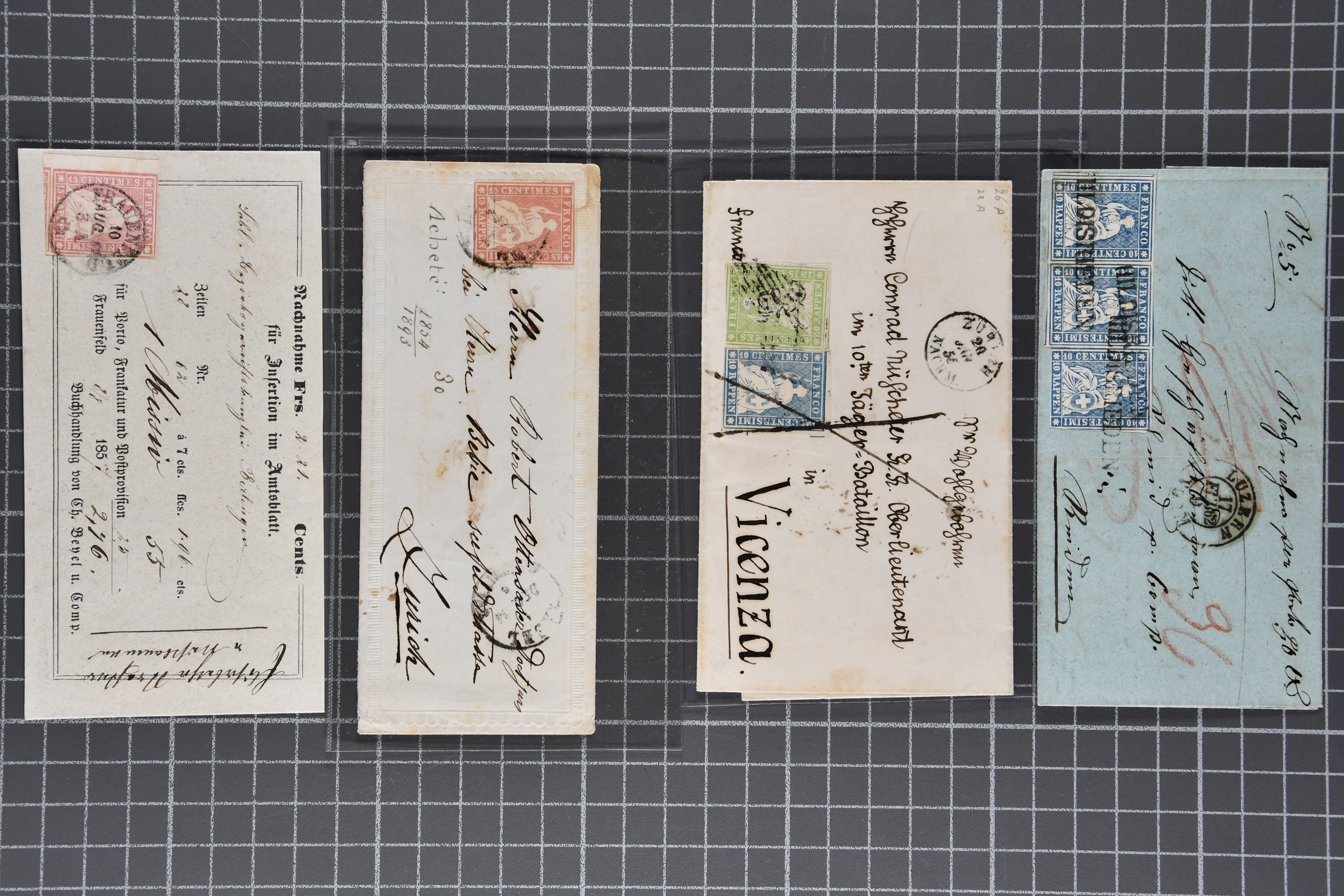 9784 cover image1854/62: Lot 26 Strubelfrankaturen. Dabei interessante Kombinationen wie 20 Rp. orange (SBK 25D) in seltener Mischfrankatur mit Sitzender Helvetia 10 Rp. blau (SBK 31) auf Faltbrief von Châtel-St-Denis nach Turin, Italien oder Dreifarbenfrankatur 5 Rp. braun, 10 Rp. blau und 15 Rp. karmin (SBK 22D+23Cc+24D) als 30 Rp. Porto für einen eingeschriebenen Brief im 3. Briefkreis von Lausanne nach Wikon, seltene Auflagen wie 10 Rp. lebhaftpreussischblau auf dünnem Zürcher Papier (SBK 23E/SH 23B3m) mit breitem Bogenrand rechts auf Faltbrief im 2. Briefkreis von Fleurier nach Neuchâtel, Einzelfrankaturen früher Druckperioden, Marken mit breiten Bogenrändern oder eine Handvoll Auslandsfrankaturen nach Deutschland, Frankreich oder Italien. Unterschiedliche Erhaltung; zwei Befunde, drei Atteste. SBK=CHF 7'000+ (Image 1) (Image 2) (Image 3) (Image 4) (Image 5) (Image 6) (Image 7) (Image 8) (Image 9) (Image 10) (Image 11) (Image 12) (Image 13) (Image 14) (Image 15) (Image 16)