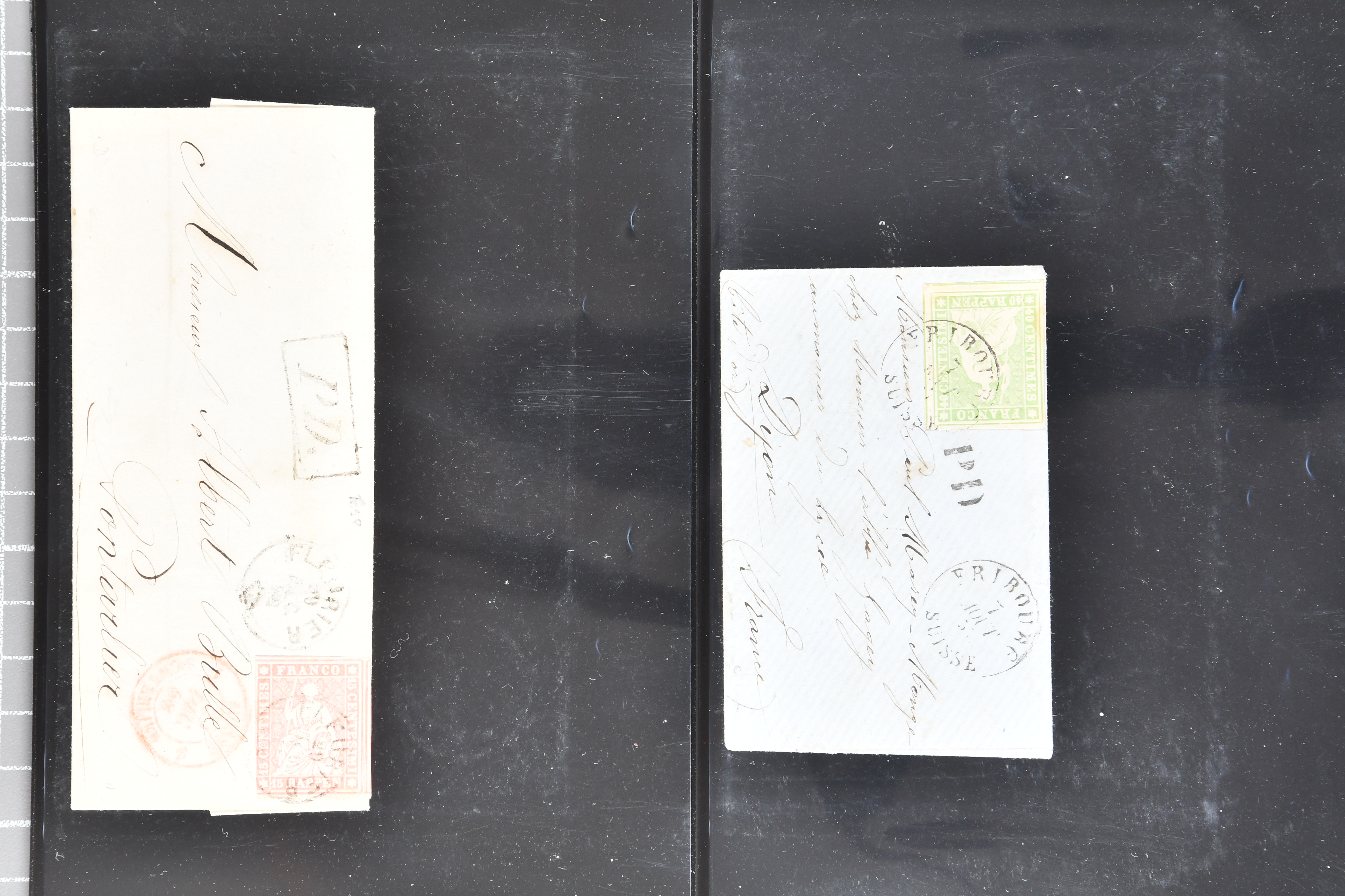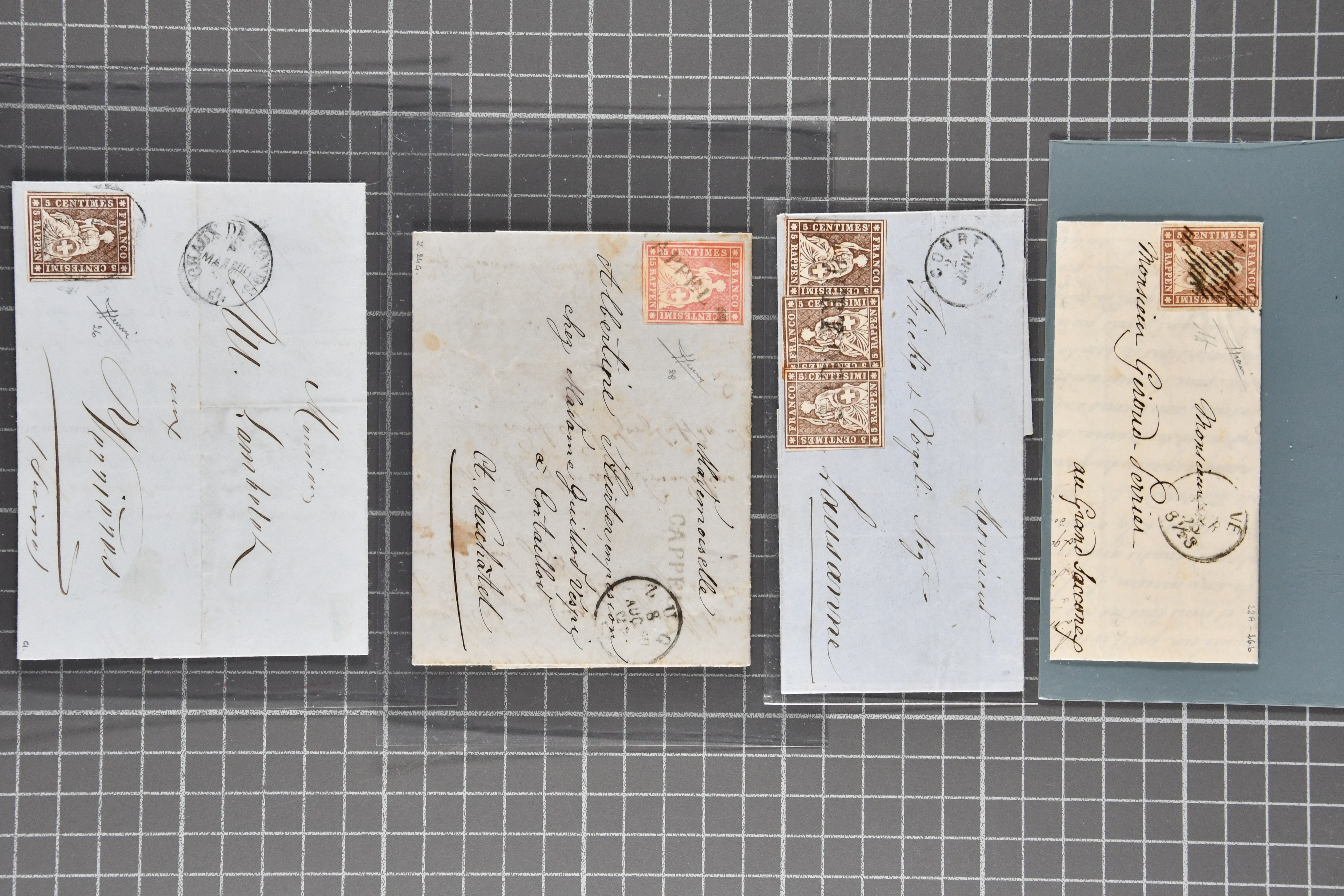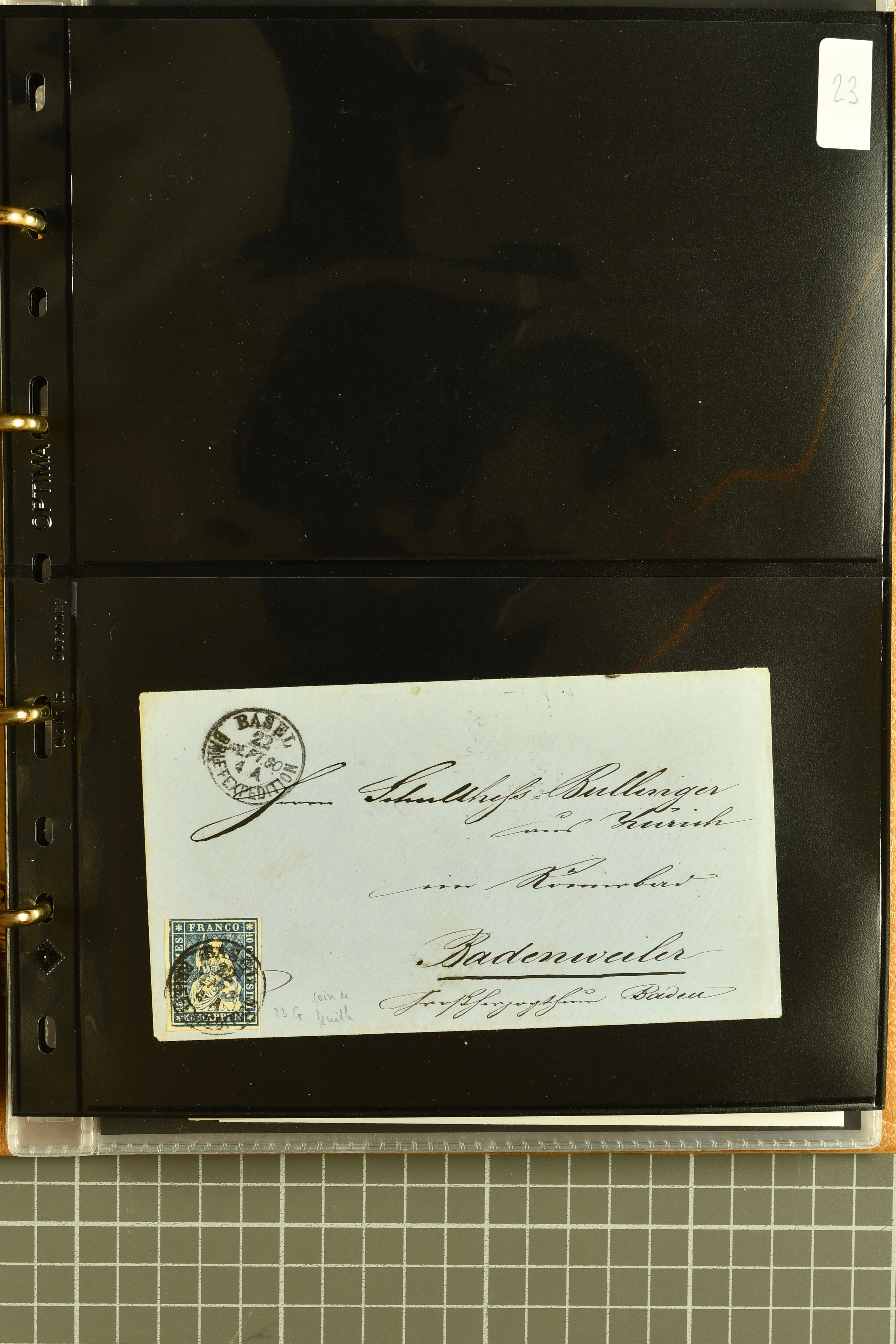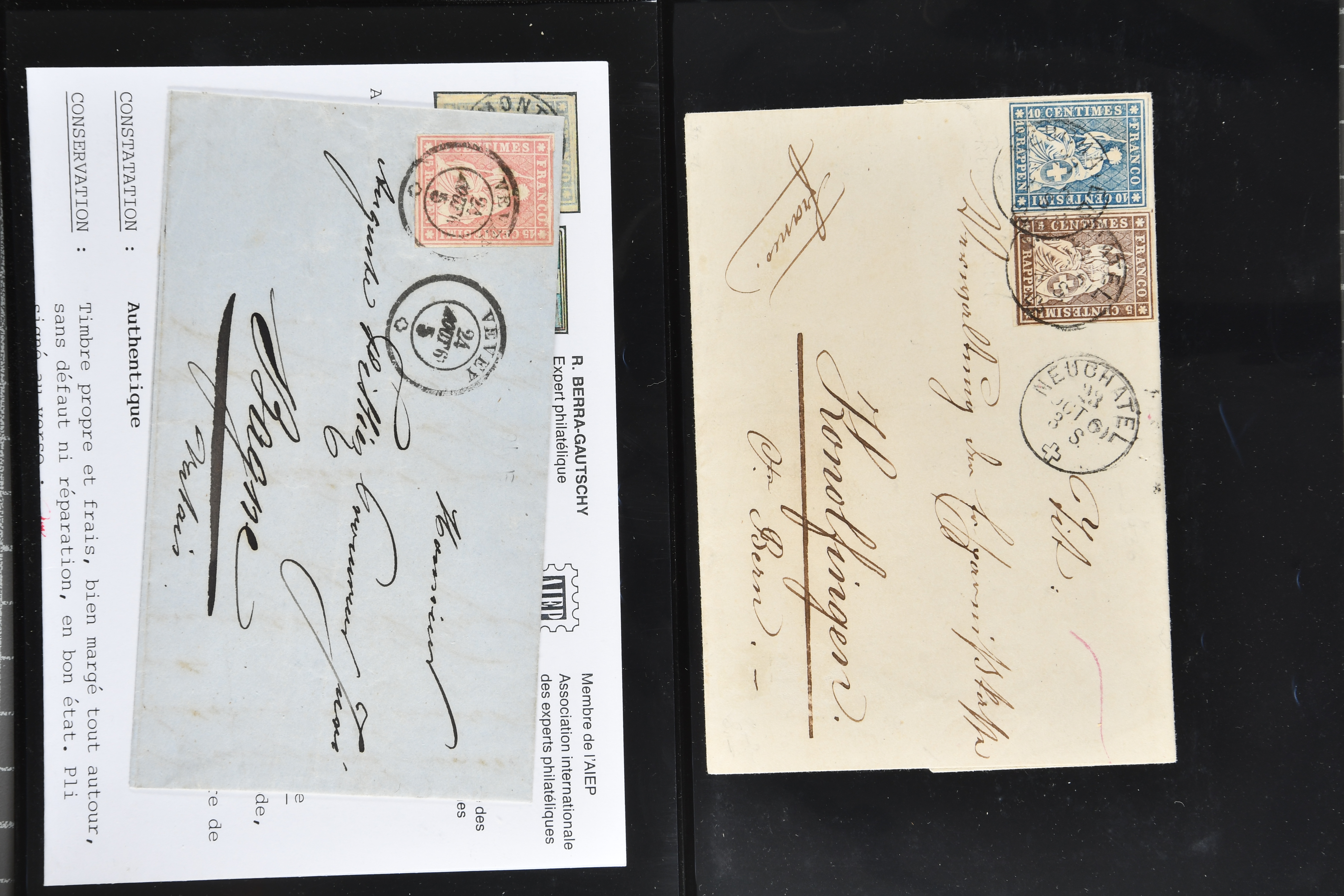 9784 cover image1854/62: Lot 26 Strubelfrankaturen. Dabei interessante Kombinationen wie 20 Rp. orange (SBK 25D) in seltener Mischfrankatur mit Sitzender Helvetia 10 Rp. blau (SBK 31) auf Faltbrief von Châtel-St-Denis nach Turin, Italien oder Dreifarbenfrankatur 5 Rp. braun, 10 Rp. blau und 15 Rp. karmin (SBK 22D+23Cc+24D) als 30 Rp. Porto für einen eingeschriebenen Brief im 3. Briefkreis von Lausanne nach Wikon, seltene Auflagen wie 10 Rp. lebhaftpreussischblau auf dünnem Zürcher Papier (SBK 23E/SH 23B3m) mit breitem Bogenrand rechts auf Faltbrief im 2. Briefkreis von Fleurier nach Neuchâtel, Einzelfrankaturen früher Druckperioden, Marken mit breiten Bogenrändern oder eine Handvoll Auslandsfrankaturen nach Deutschland, Frankreich oder Italien. Unterschiedliche Erhaltung; zwei Befunde, drei Atteste. SBK=CHF 7'000+ (Image 1) (Image 2) (Image 3) (Image 4) (Image 5) (Image 6) (Image 7) (Image 8) (Image 9) (Image 10) (Image 11) (Image 12) (Image 13) (Image 14) (Image 15) (Image 16)