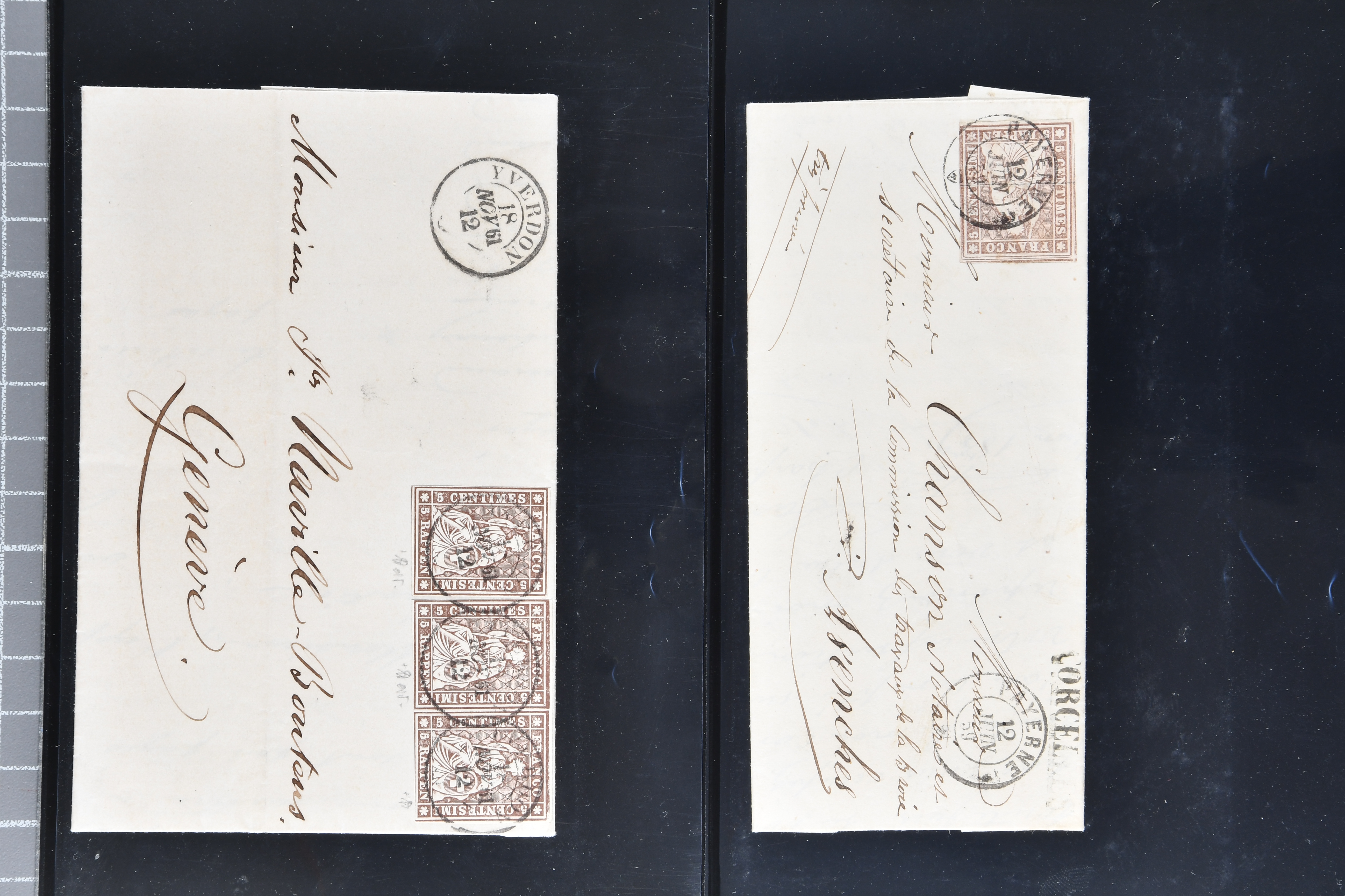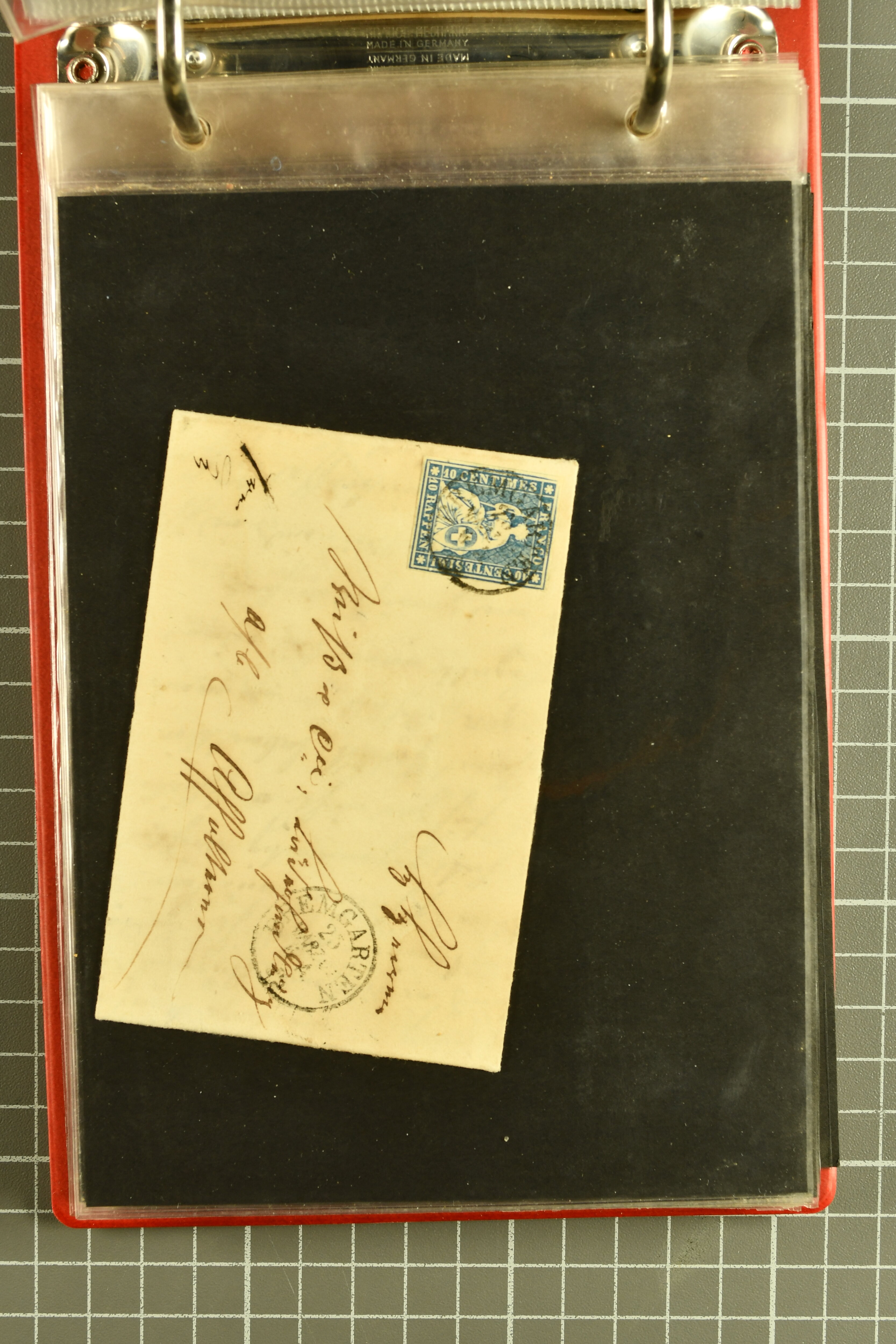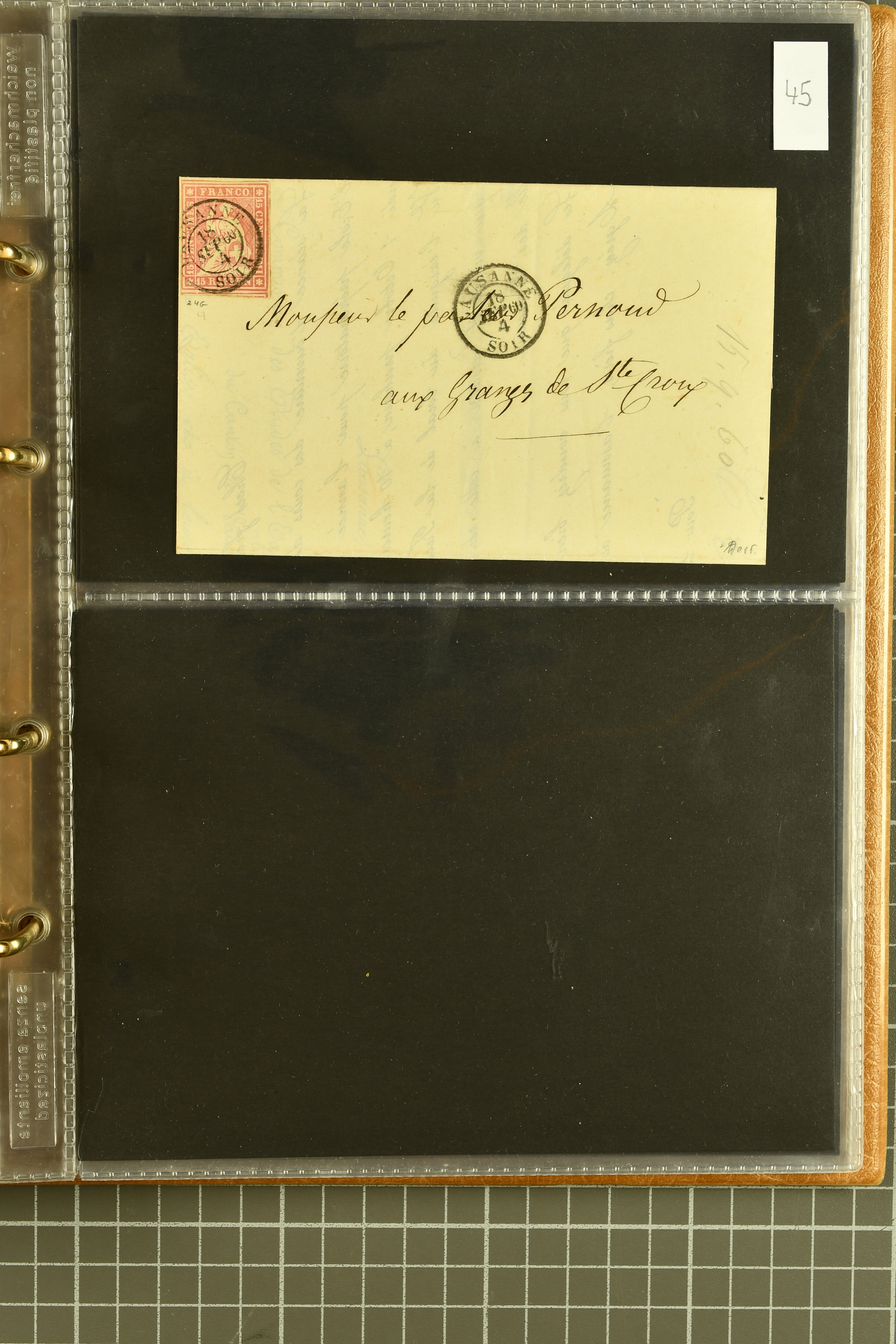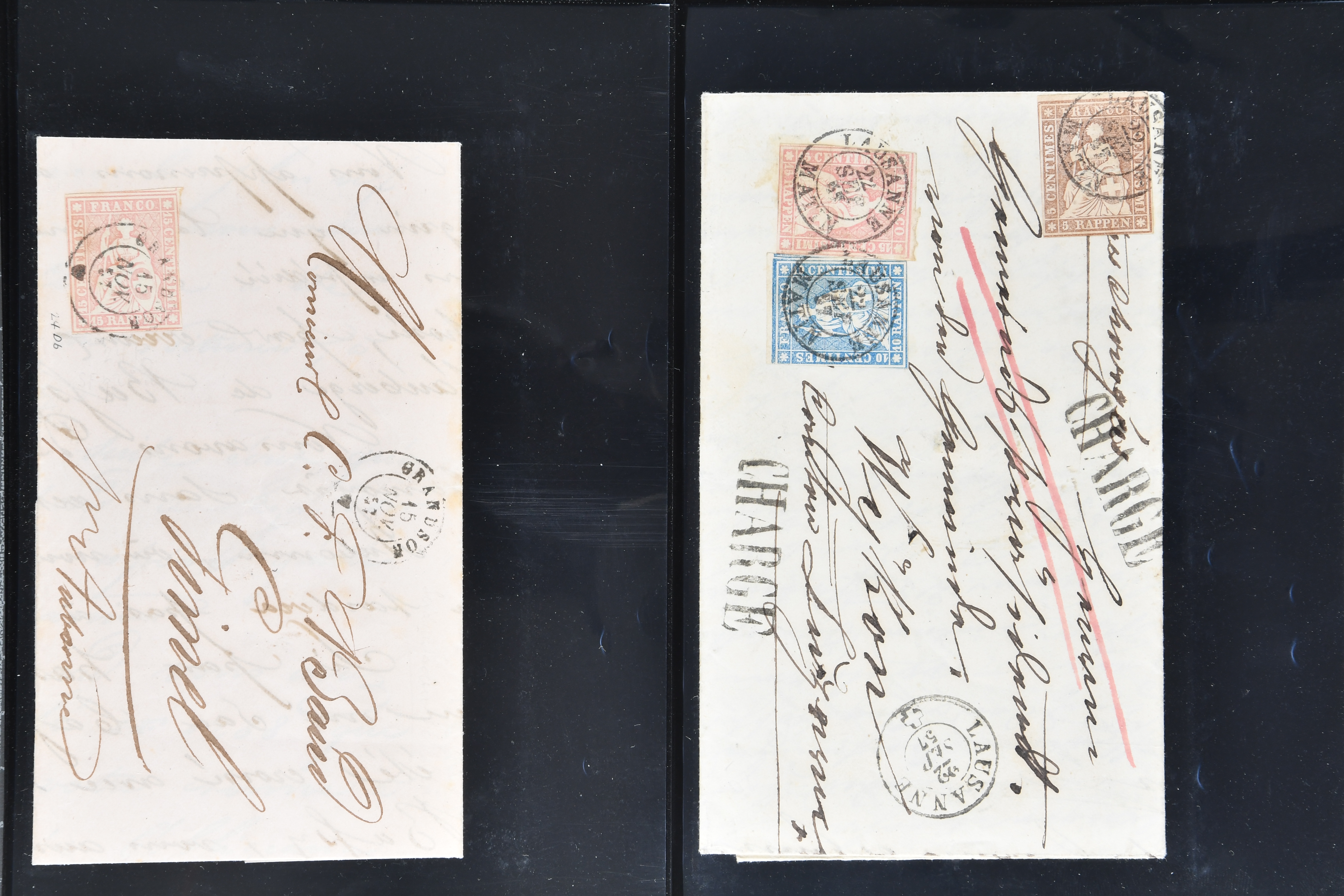 9784 cover image1854/62: Lot 26 Strubelfrankaturen. Dabei interessante Kombinationen wie 20 Rp. orange (SBK 25D) in seltener Mischfrankatur mit Sitzender Helvetia 10 Rp. blau (SBK 31) auf Faltbrief von Châtel-St-Denis nach Turin, Italien oder Dreifarbenfrankatur 5 Rp. braun, 10 Rp. blau und 15 Rp. karmin (SBK 22D+23Cc+24D) als 30 Rp. Porto für einen eingeschriebenen Brief im 3. Briefkreis von Lausanne nach Wikon, seltene Auflagen wie 10 Rp. lebhaftpreussischblau auf dünnem Zürcher Papier (SBK 23E/SH 23B3m) mit breitem Bogenrand rechts auf Faltbrief im 2. Briefkreis von Fleurier nach Neuchâtel, Einzelfrankaturen früher Druckperioden, Marken mit breiten Bogenrändern oder eine Handvoll Auslandsfrankaturen nach Deutschland, Frankreich oder Italien. Unterschiedliche Erhaltung; zwei Befunde, drei Atteste. SBK=CHF 7'000+ (Image 1) (Image 2) (Image 3) (Image 4) (Image 5) (Image 6) (Image 7) (Image 8) (Image 9) (Image 10) (Image 11) (Image 12) (Image 13) (Image 14) (Image 15) (Image 16)