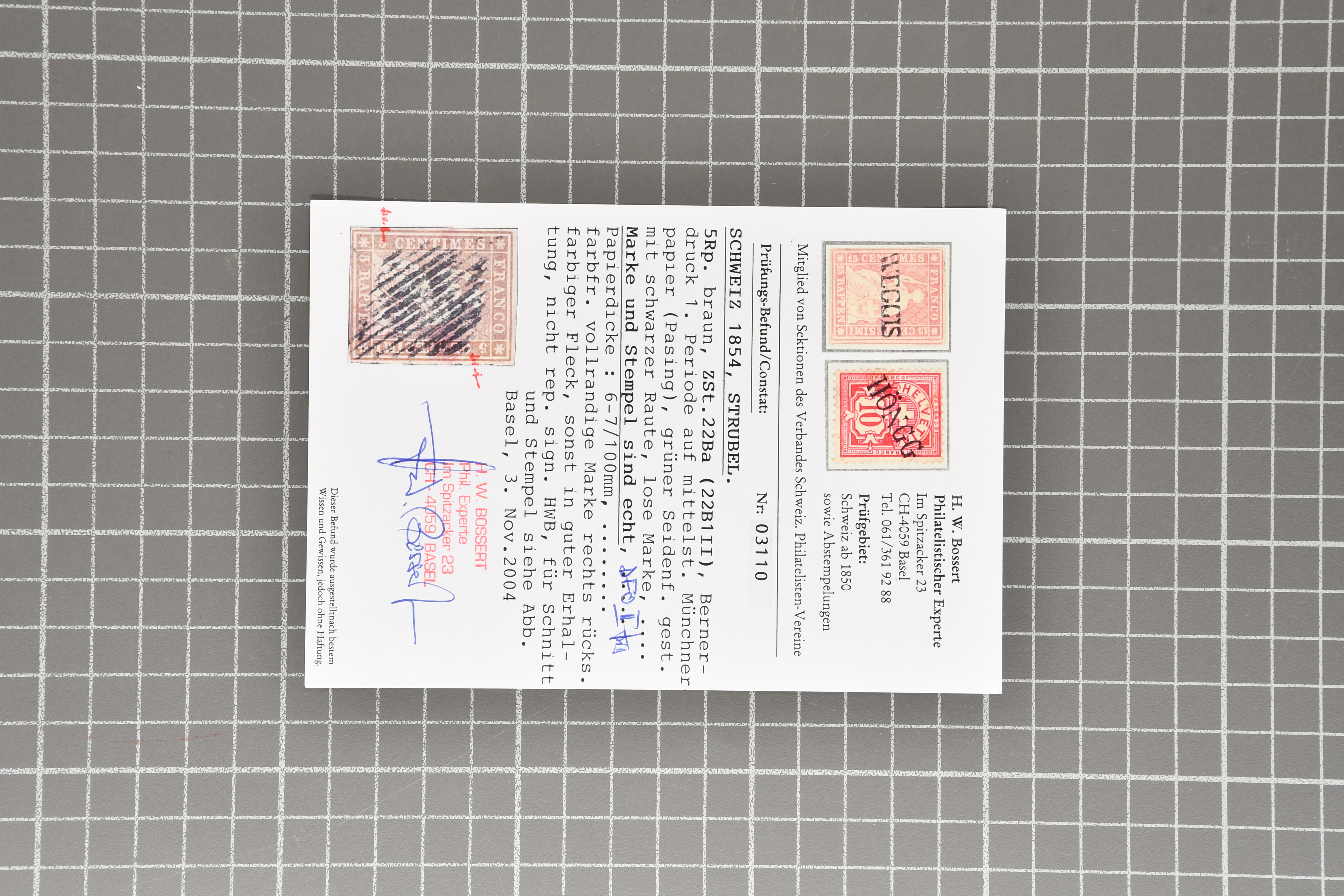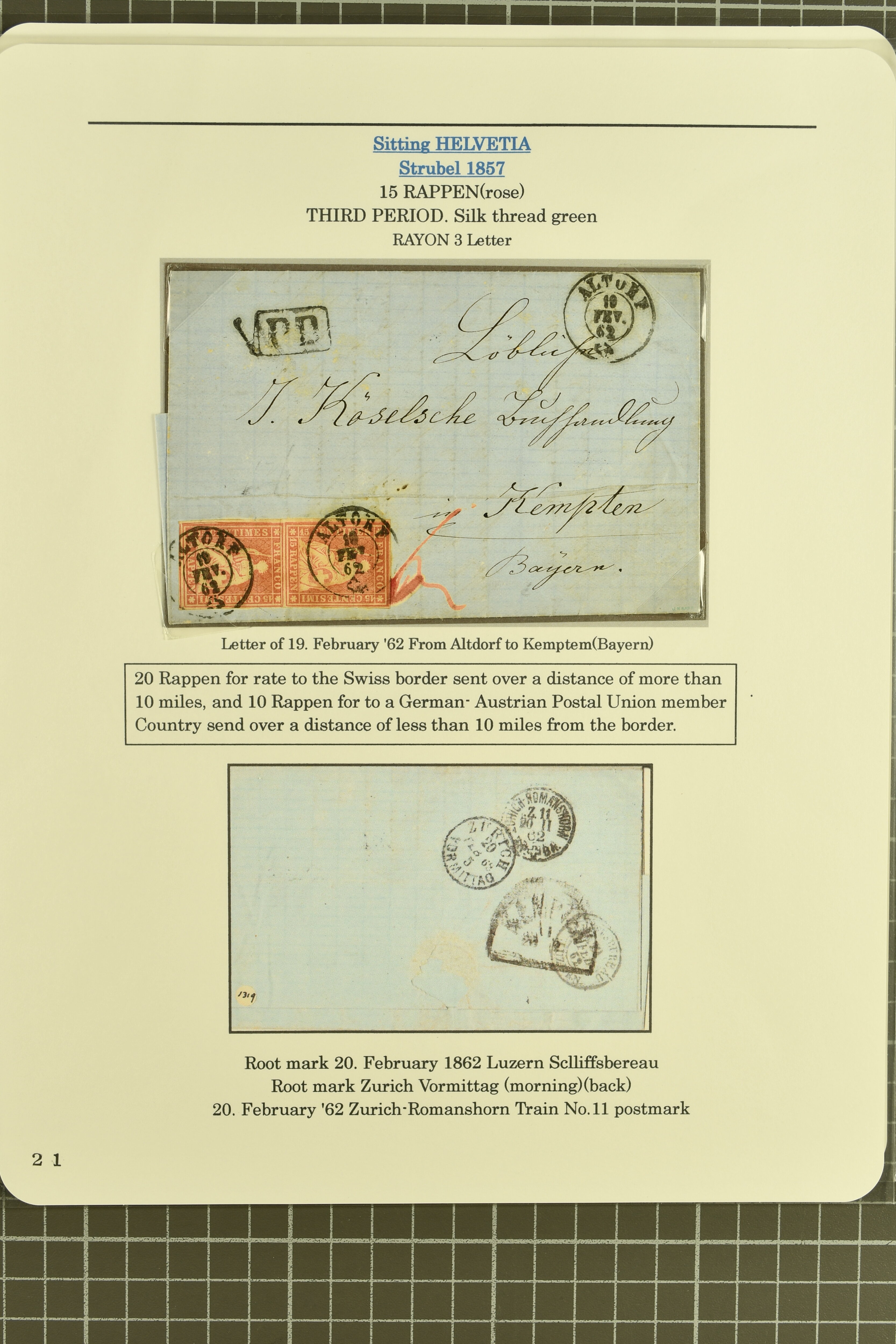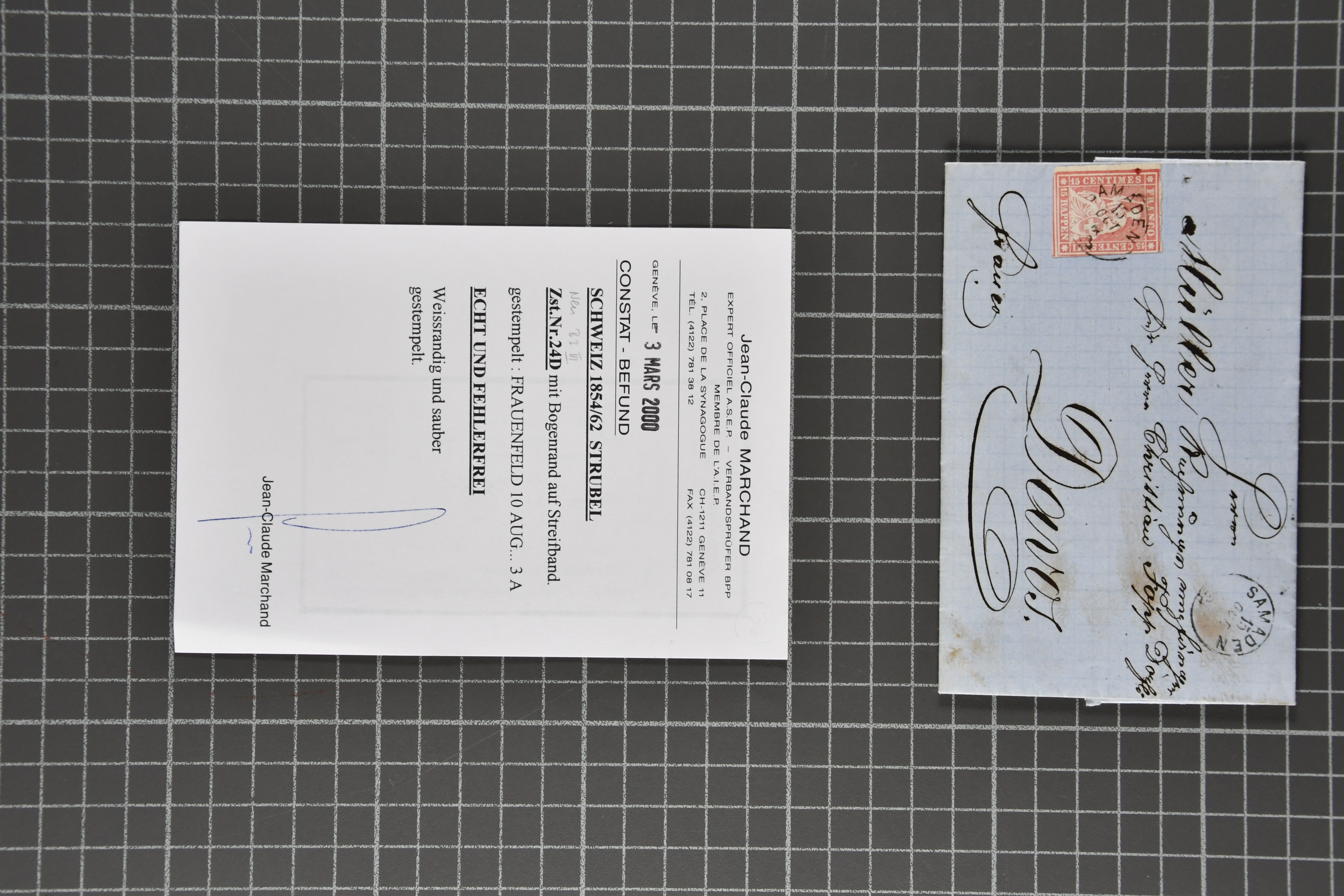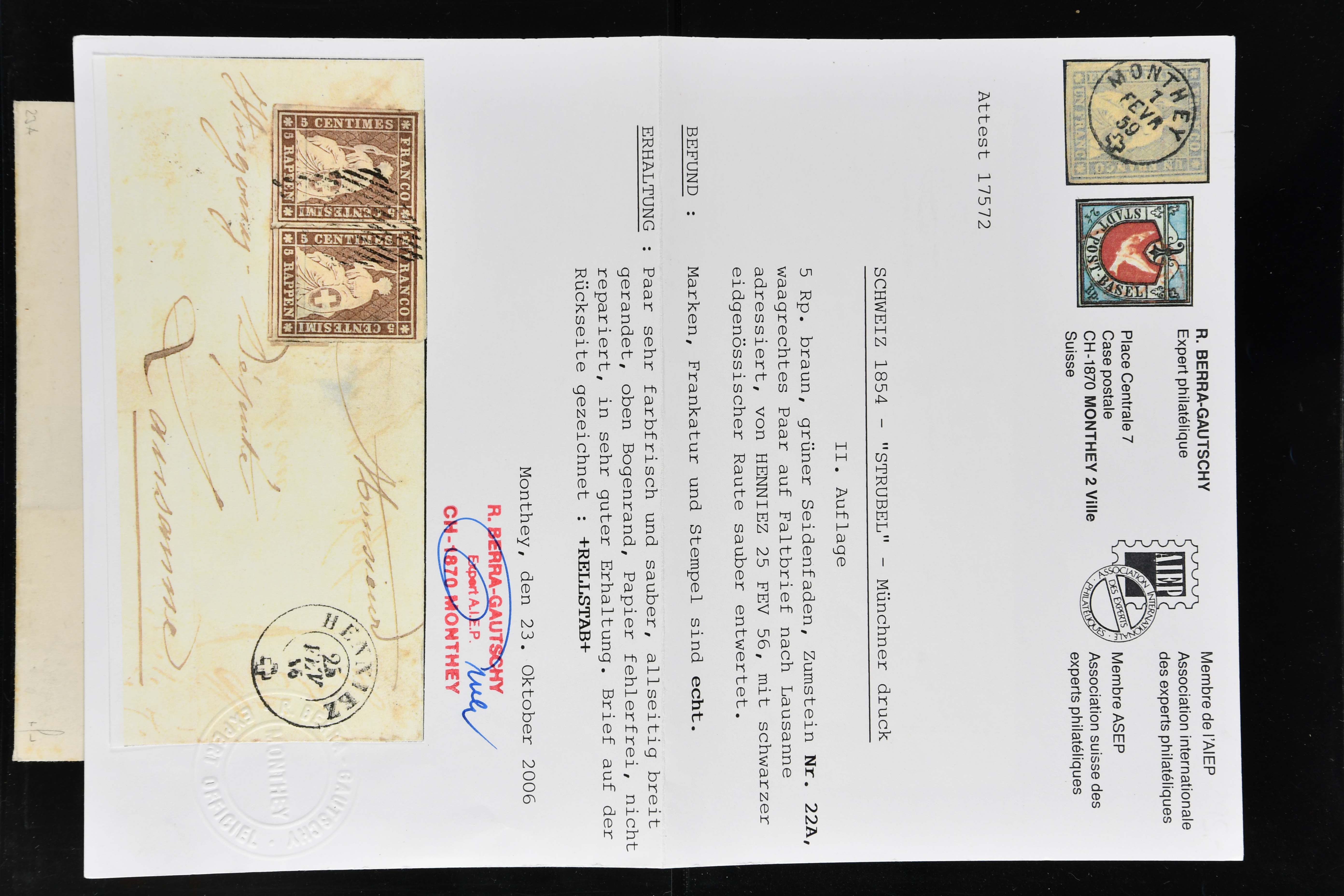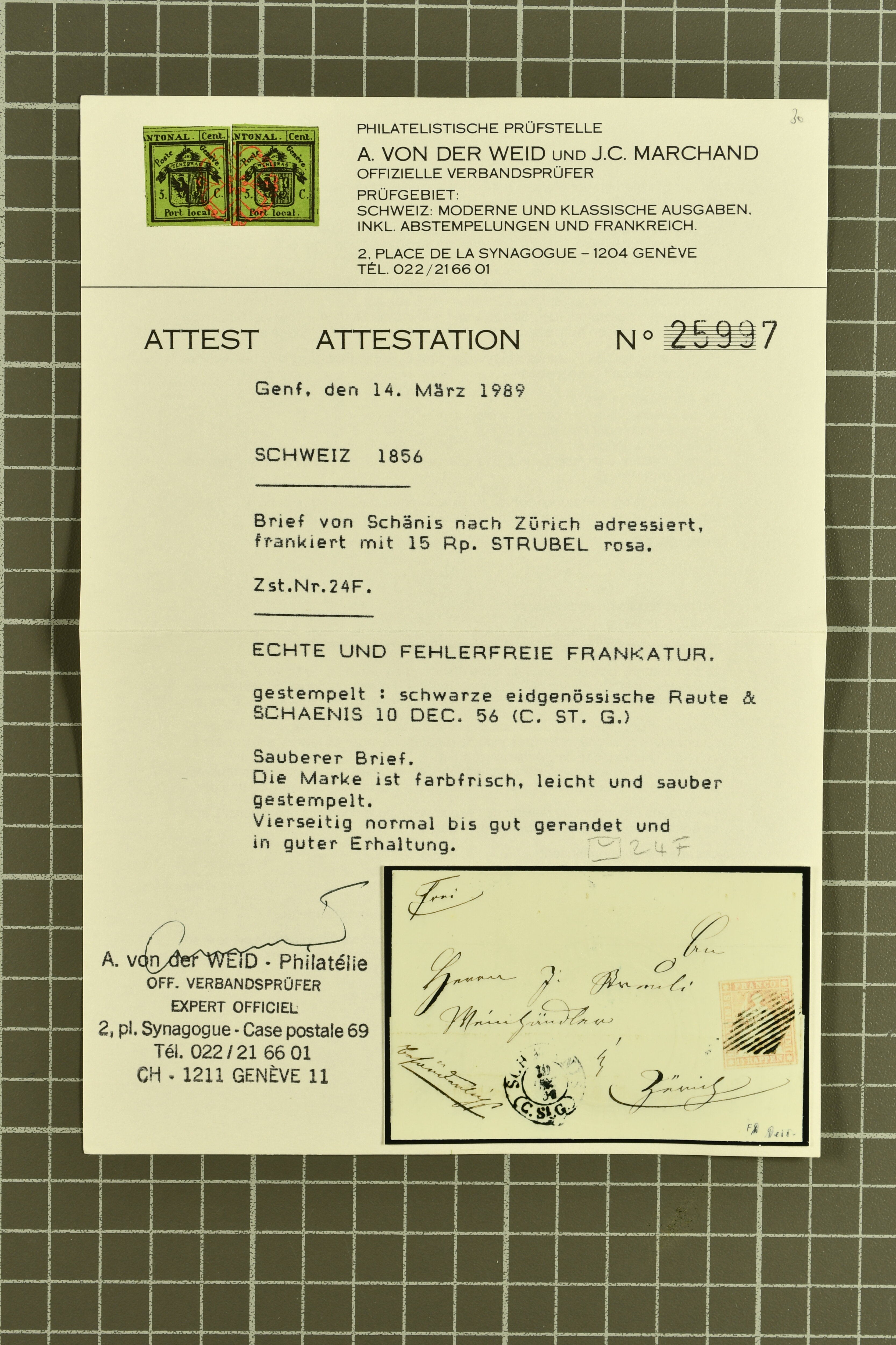 9792 cover image1854/62: Lot 20 Strubelfrankaturen. Dabei, 10 Rp. blau (2) und 15 Rp. rötlichkarmin (SBK 24B), meist weissrandig und mit deutlich ausgeprägtem Relief, je klar entw. mit schwarzer Genfer Raute auf Damenbriefumschlag nach Paris (F), 10 Rp. lebhaftpreussischblau auf dünnem Zürcher Papier (SBK 23E) mit Bogenrand rechts, entw. mit seltener 7-liniger Raute von Biel (AW 52), 10 Rp. grauultramarin auf dünnem Münchner Papier (SBK 23F) auf frischem Faltbrief von Bern nach Thun, 15 Rp. rötlichkarmin (SBK 24F), farbfr. und weissrandig auf kleinformatigem Faltbrief mit Vermerk "sehr bressant" von St. Gallen nach Ossingen (ZH), sehr farbfr. 20 Rp. gelblichorange (SBK 25F) auf Nachnahmebrief im 2. Briefkreis von Aarau nach Dornach (SO) oder 2 Rp. grau (SBK 21G) auf Drucksache von Winterthur nach Basel. Vorab gute Erhaltung; drei Befunde, sechs Atteste. SBK=CHF 10'000 (Image 1) (Image 2) (Image 3) (Image 4) (Image 5) (Image 6) (Image 7) (Image 8) (Image 9) (Image 10) (Image 11) (Image 12) (Image 13) (Image 14) (Image 15) (Image 16) (Image 17) (Image 18) (Image 19) (Image 20) (Image 21)