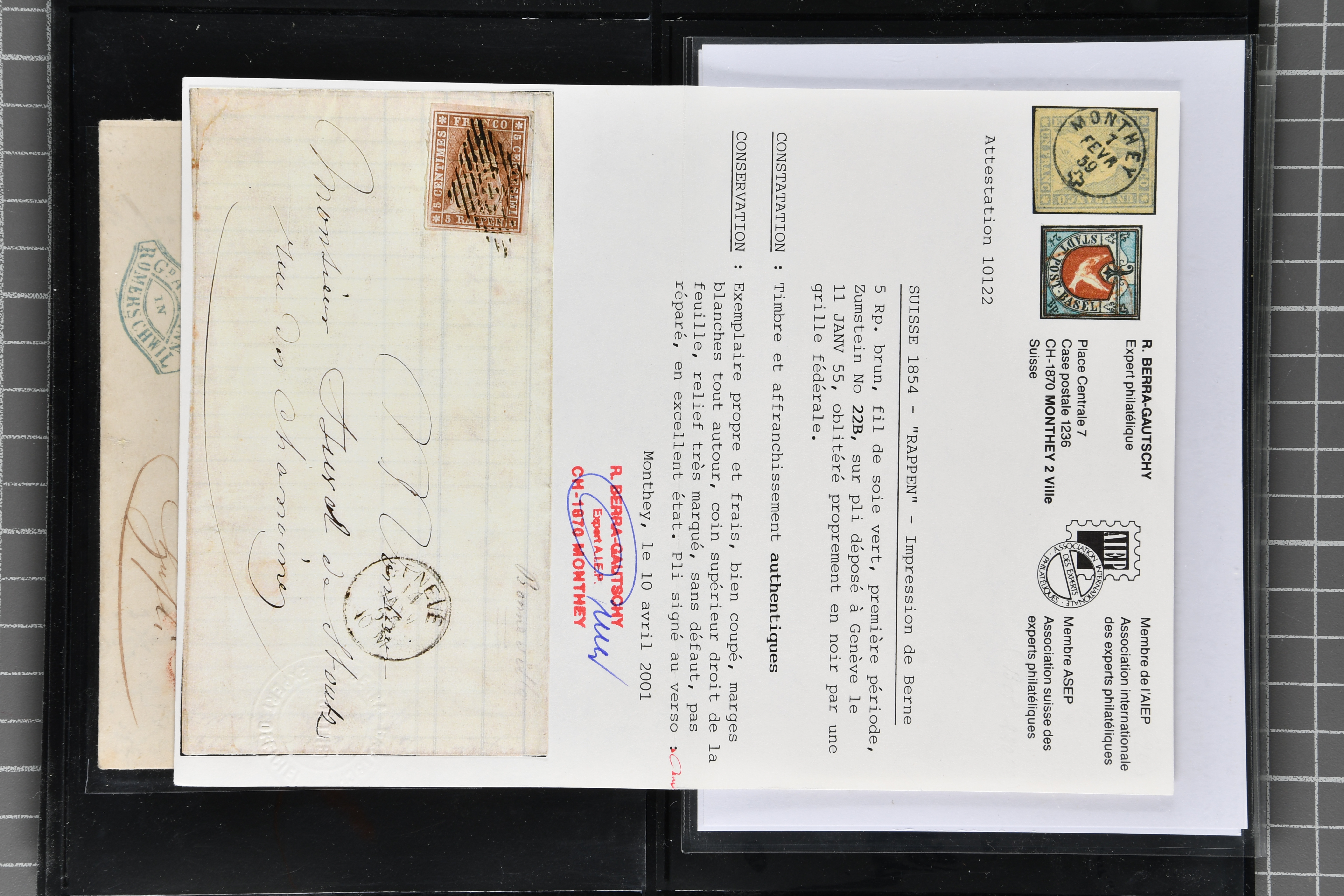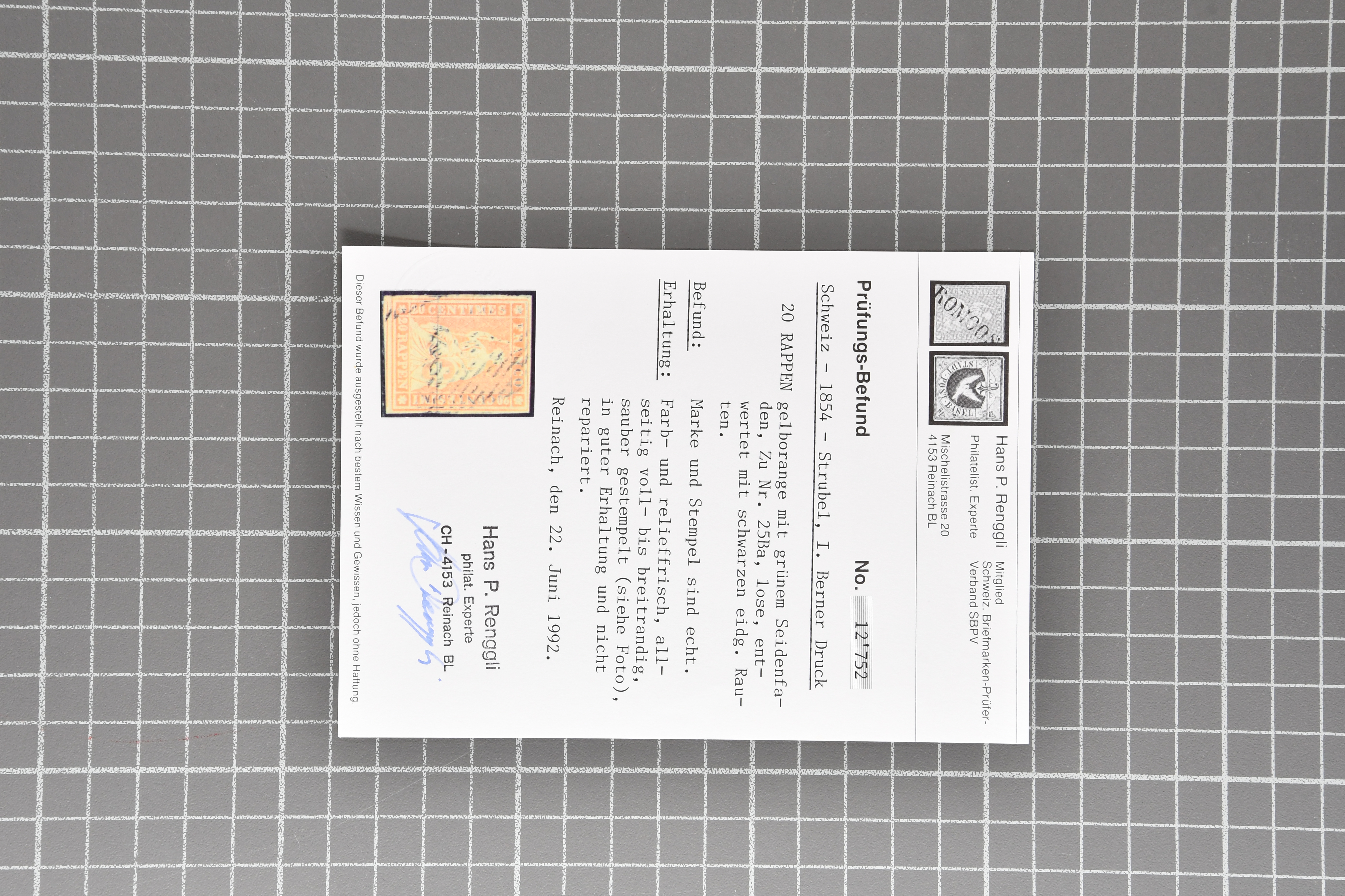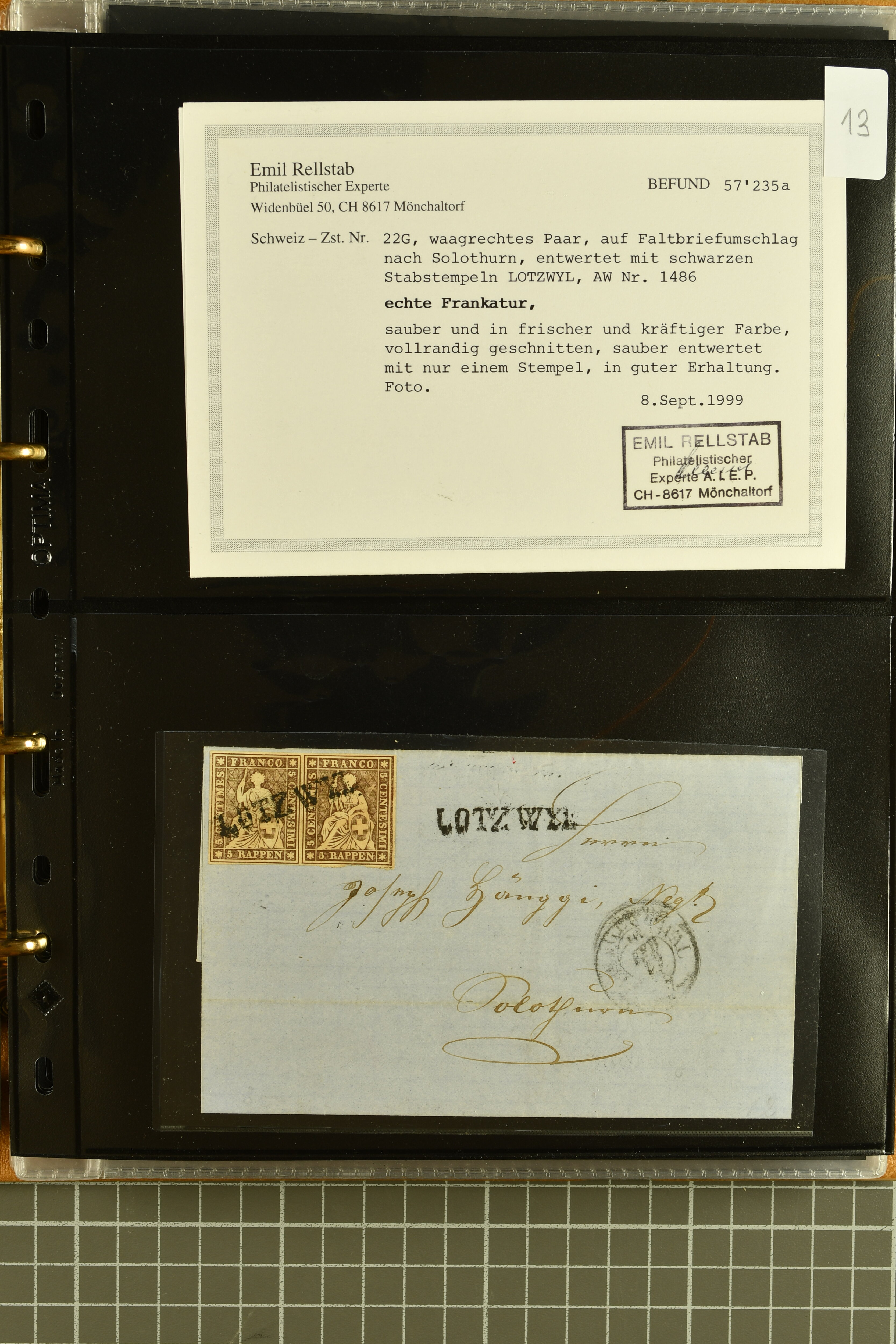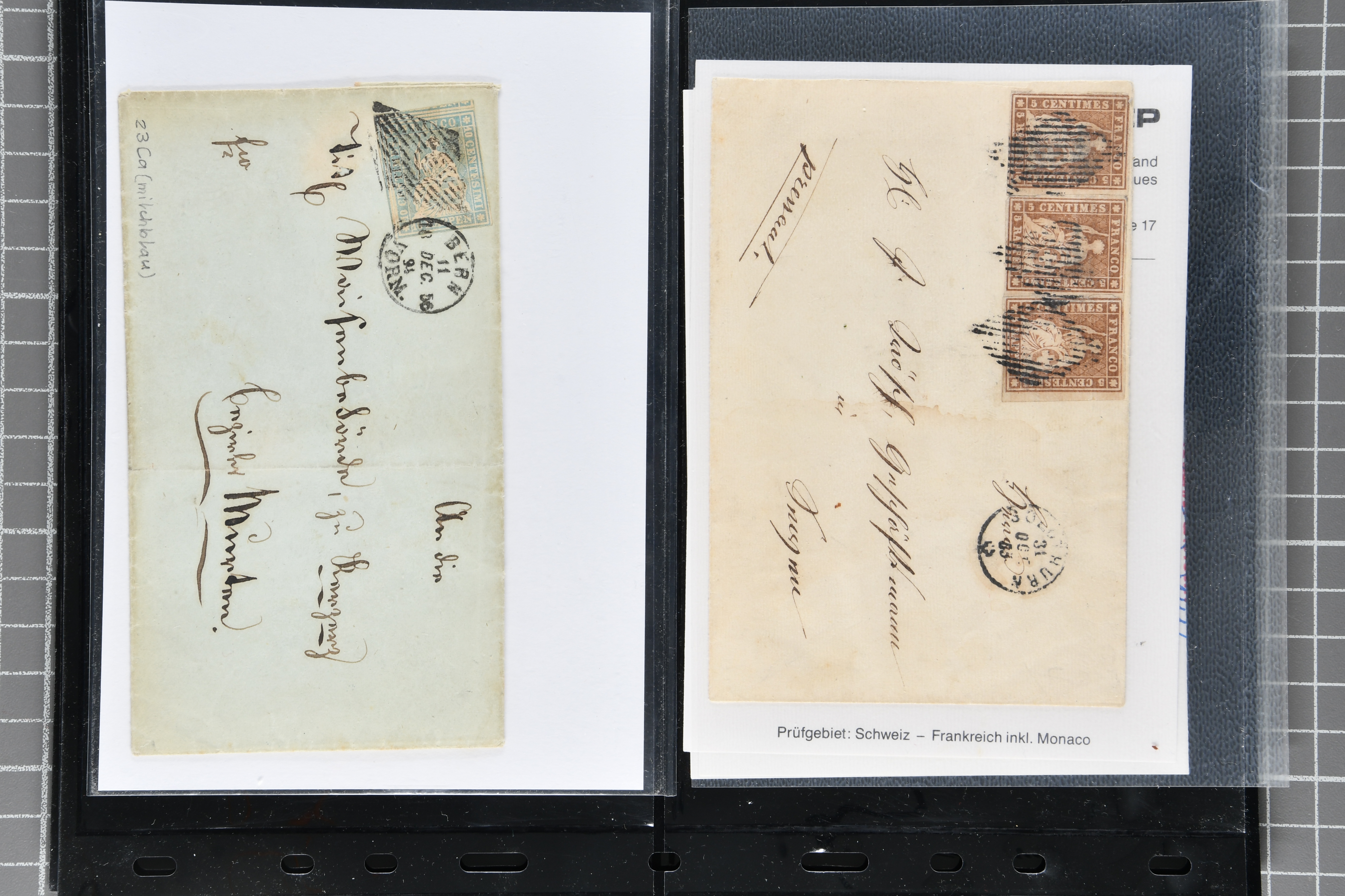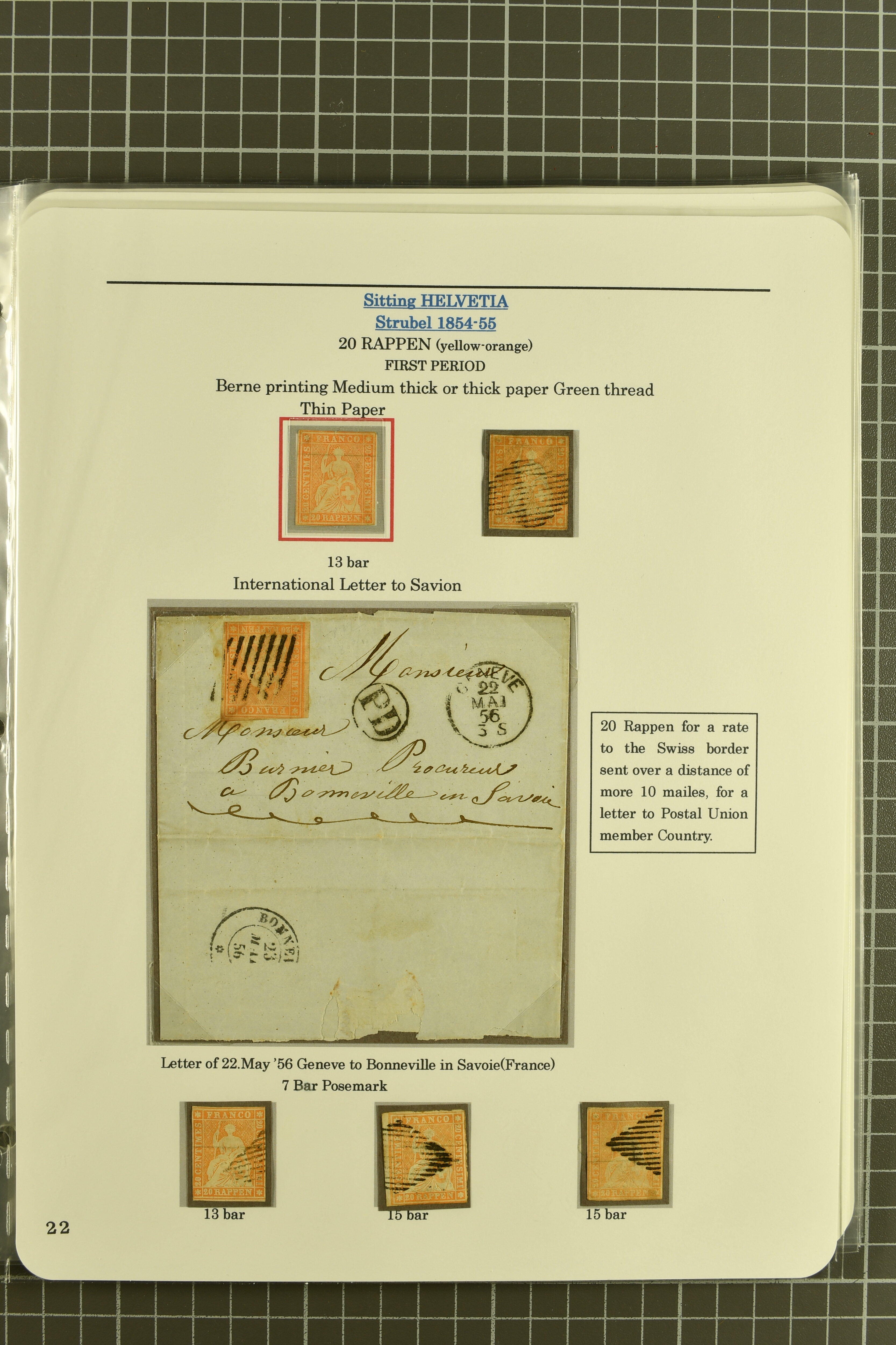 9792 cover image1854/62: Lot 20 Strubelfrankaturen. Dabei, 10 Rp. blau (2) und 15 Rp. rötlichkarmin (SBK 24B), meist weissrandig und mit deutlich ausgeprägtem Relief, je klar entw. mit schwarzer Genfer Raute auf Damenbriefumschlag nach Paris (F), 10 Rp. lebhaftpreussischblau auf dünnem Zürcher Papier (SBK 23E) mit Bogenrand rechts, entw. mit seltener 7-liniger Raute von Biel (AW 52), 10 Rp. grauultramarin auf dünnem Münchner Papier (SBK 23F) auf frischem Faltbrief von Bern nach Thun, 15 Rp. rötlichkarmin (SBK 24F), farbfr. und weissrandig auf kleinformatigem Faltbrief mit Vermerk "sehr bressant" von St. Gallen nach Ossingen (ZH), sehr farbfr. 20 Rp. gelblichorange (SBK 25F) auf Nachnahmebrief im 2. Briefkreis von Aarau nach Dornach (SO) oder 2 Rp. grau (SBK 21G) auf Drucksache von Winterthur nach Basel. Vorab gute Erhaltung; drei Befunde, sechs Atteste. SBK=CHF 10'000 (Image 1) (Image 2) (Image 3) (Image 4) (Image 5) (Image 6) (Image 7) (Image 8) (Image 9) (Image 10) (Image 11) (Image 12) (Image 13) (Image 14) (Image 15) (Image 16) (Image 17) (Image 18) (Image 19) (Image 20) (Image 21)
