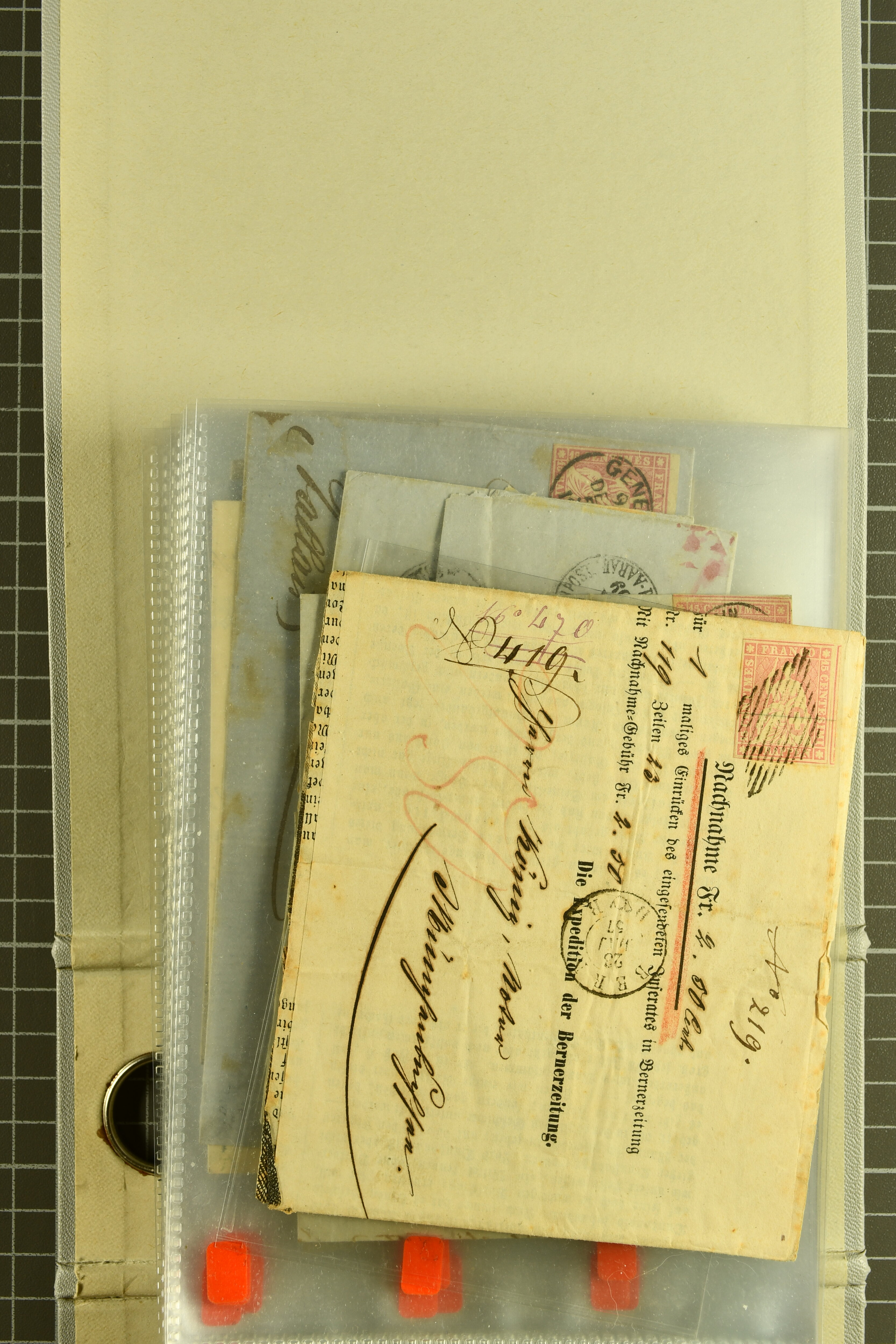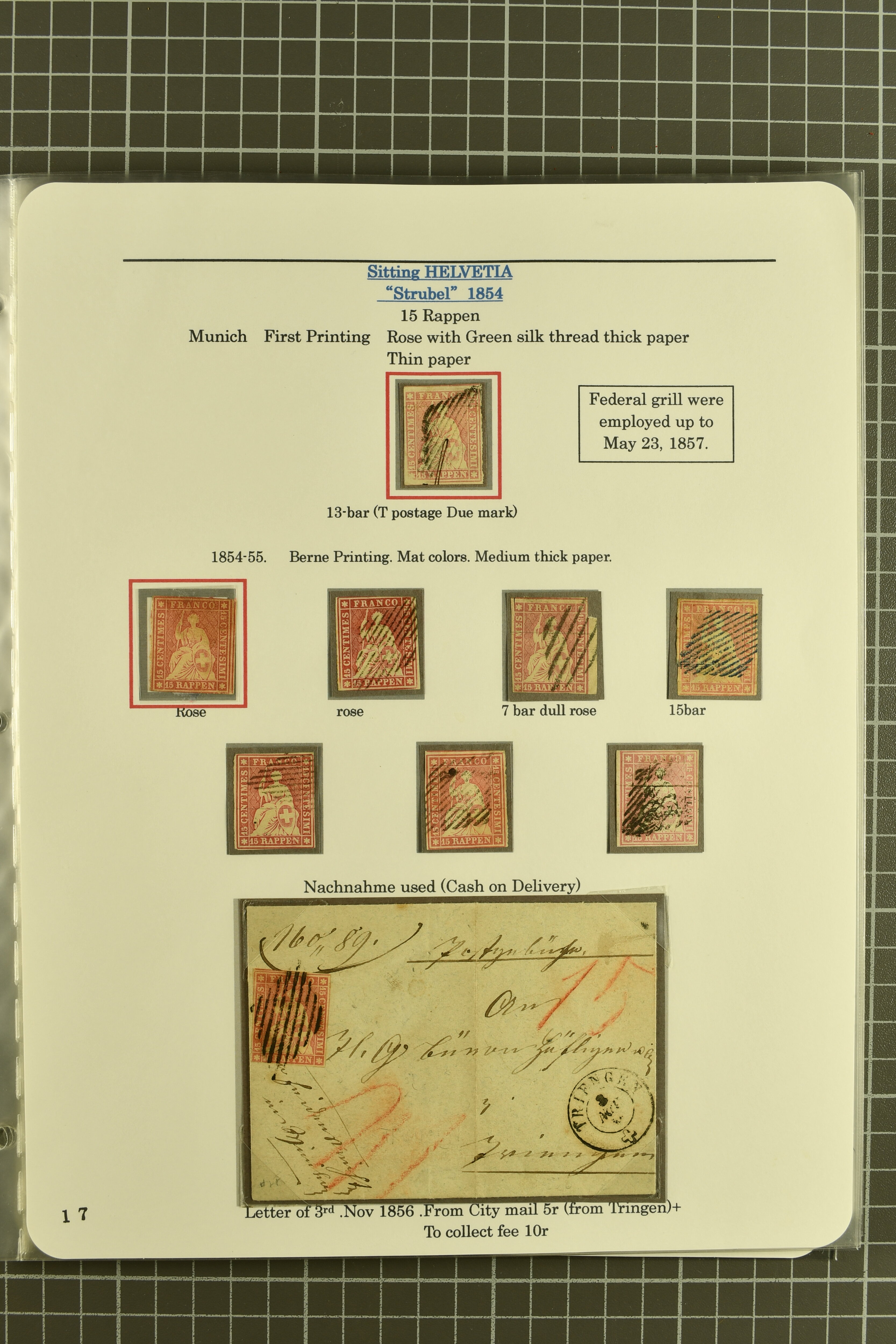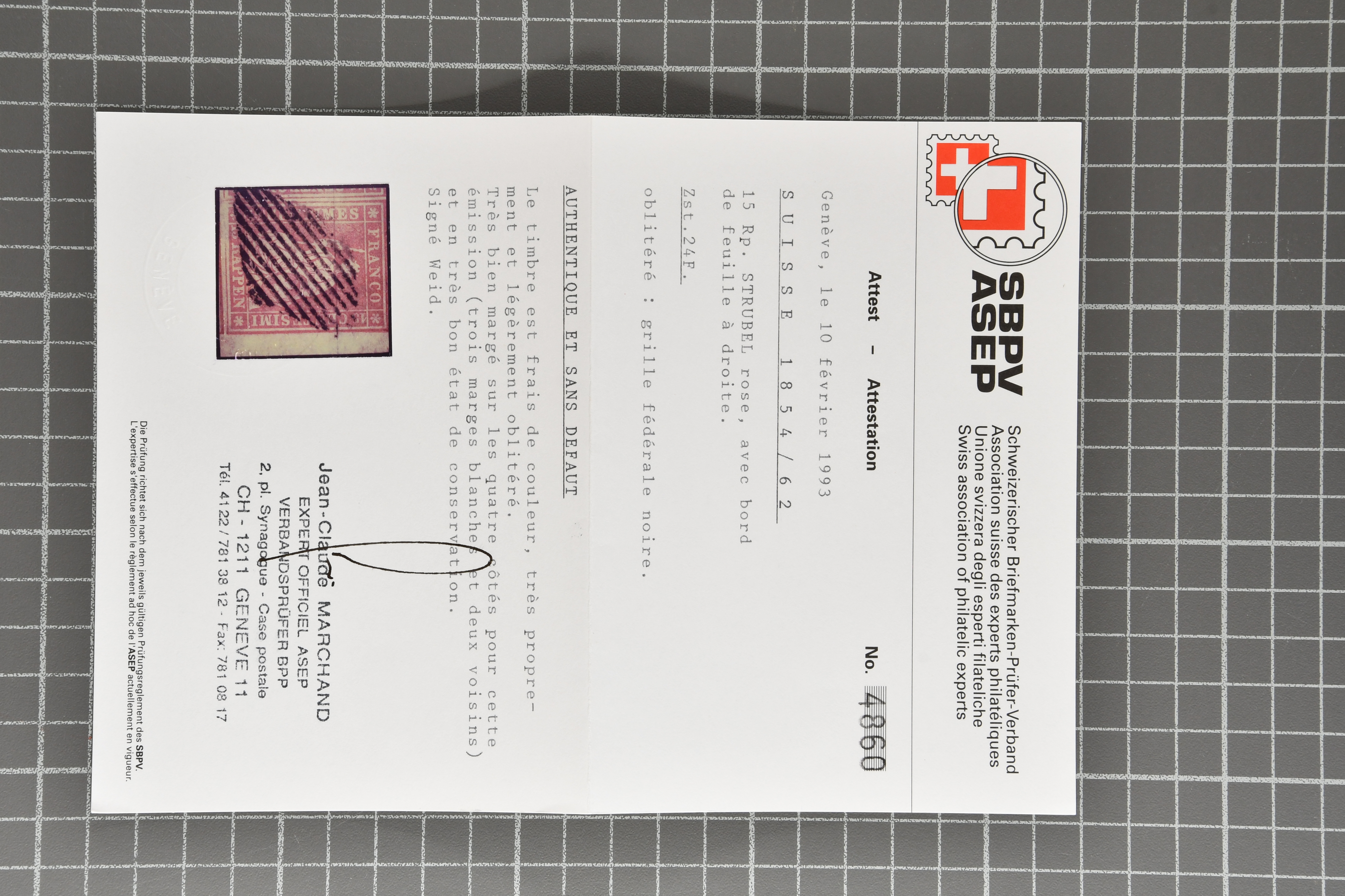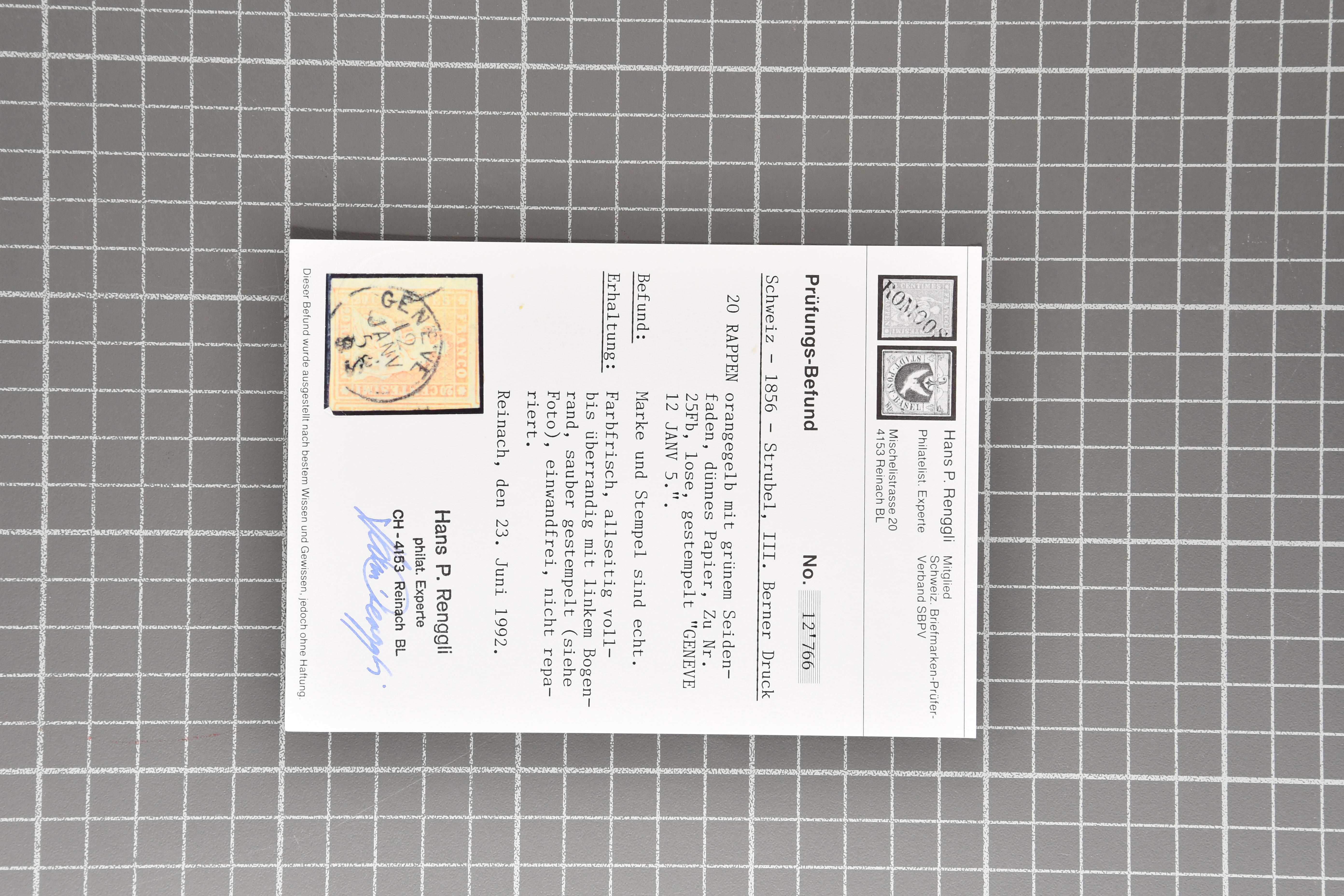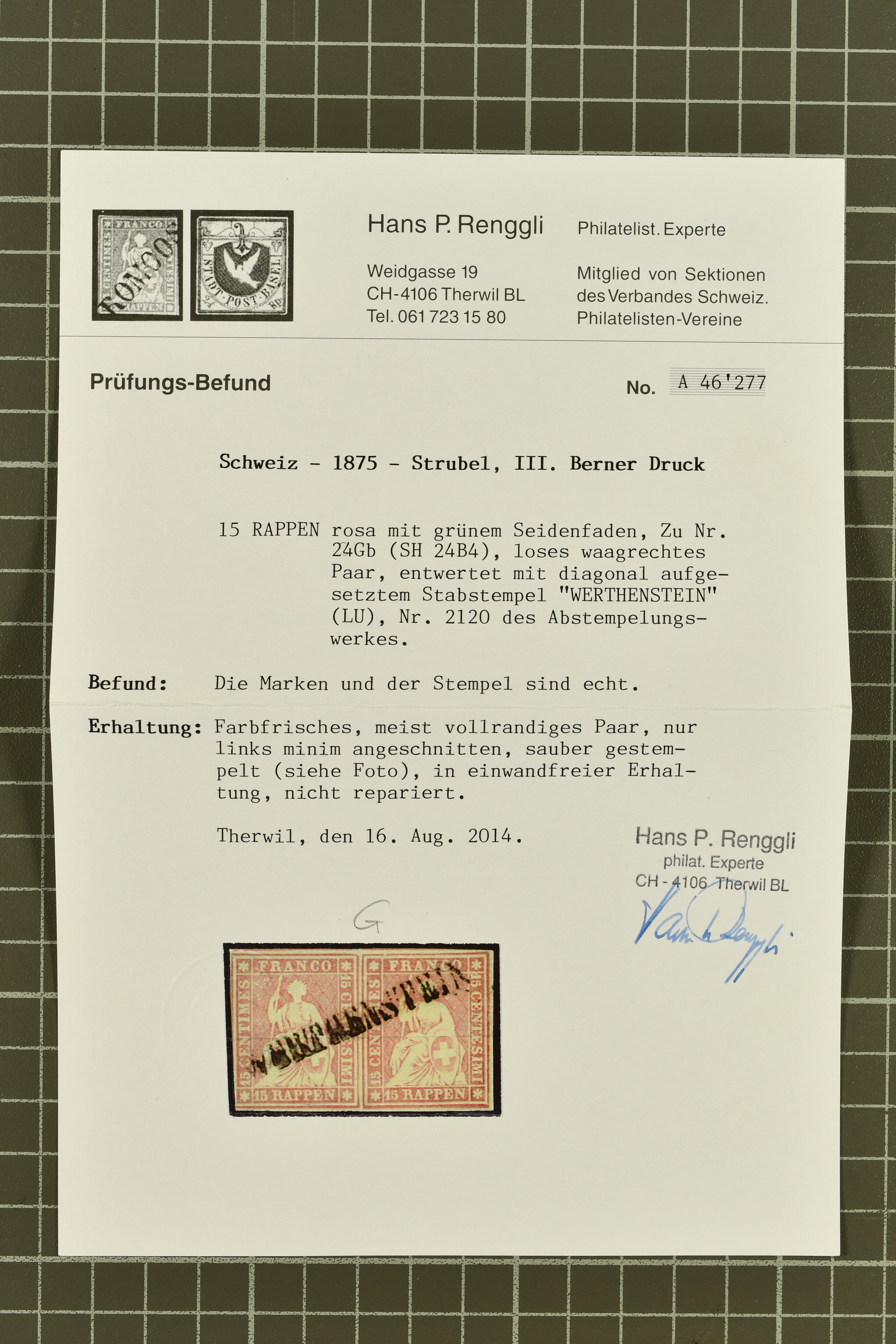 9792 cover image1854/62: Lot 20 Strubelfrankaturen. Dabei, 10 Rp. blau (2) und 15 Rp. rötlichkarmin (SBK 24B), meist weissrandig und mit deutlich ausgeprägtem Relief, je klar entw. mit schwarzer Genfer Raute auf Damenbriefumschlag nach Paris (F), 10 Rp. lebhaftpreussischblau auf dünnem Zürcher Papier (SBK 23E) mit Bogenrand rechts, entw. mit seltener 7-liniger Raute von Biel (AW 52), 10 Rp. grauultramarin auf dünnem Münchner Papier (SBK 23F) auf frischem Faltbrief von Bern nach Thun, 15 Rp. rötlichkarmin (SBK 24F), farbfr. und weissrandig auf kleinformatigem Faltbrief mit Vermerk "sehr bressant" von St. Gallen nach Ossingen (ZH), sehr farbfr. 20 Rp. gelblichorange (SBK 25F) auf Nachnahmebrief im 2. Briefkreis von Aarau nach Dornach (SO) oder 2 Rp. grau (SBK 21G) auf Drucksache von Winterthur nach Basel. Vorab gute Erhaltung; drei Befunde, sechs Atteste. SBK=CHF 10'000 (Image 1) (Image 2) (Image 3) (Image 4) (Image 5) (Image 6) (Image 7) (Image 8) (Image 9) (Image 10) (Image 11) (Image 12) (Image 13) (Image 14) (Image 15) (Image 16) (Image 17) (Image 18) (Image 19) (Image 20) (Image 21)