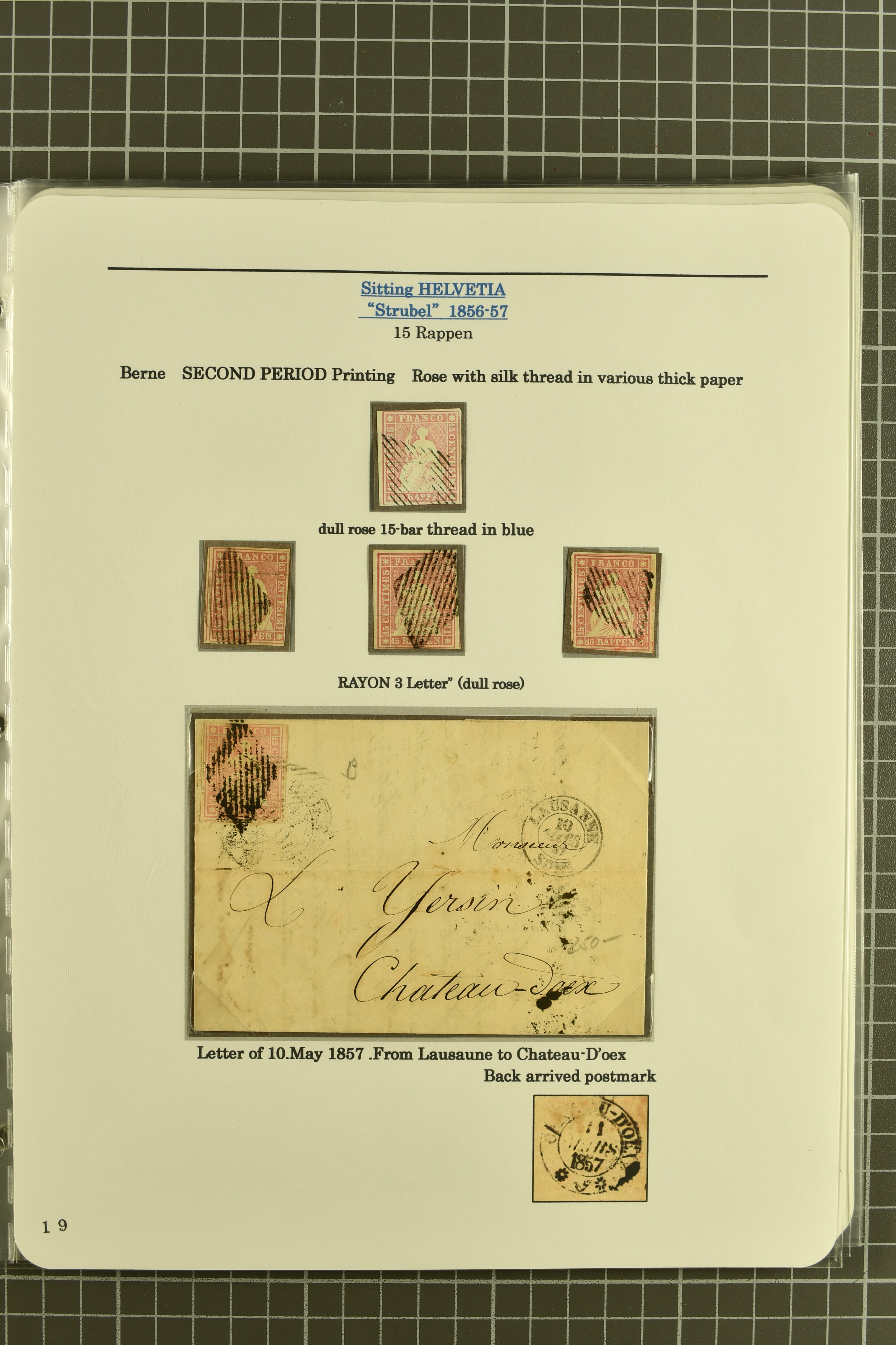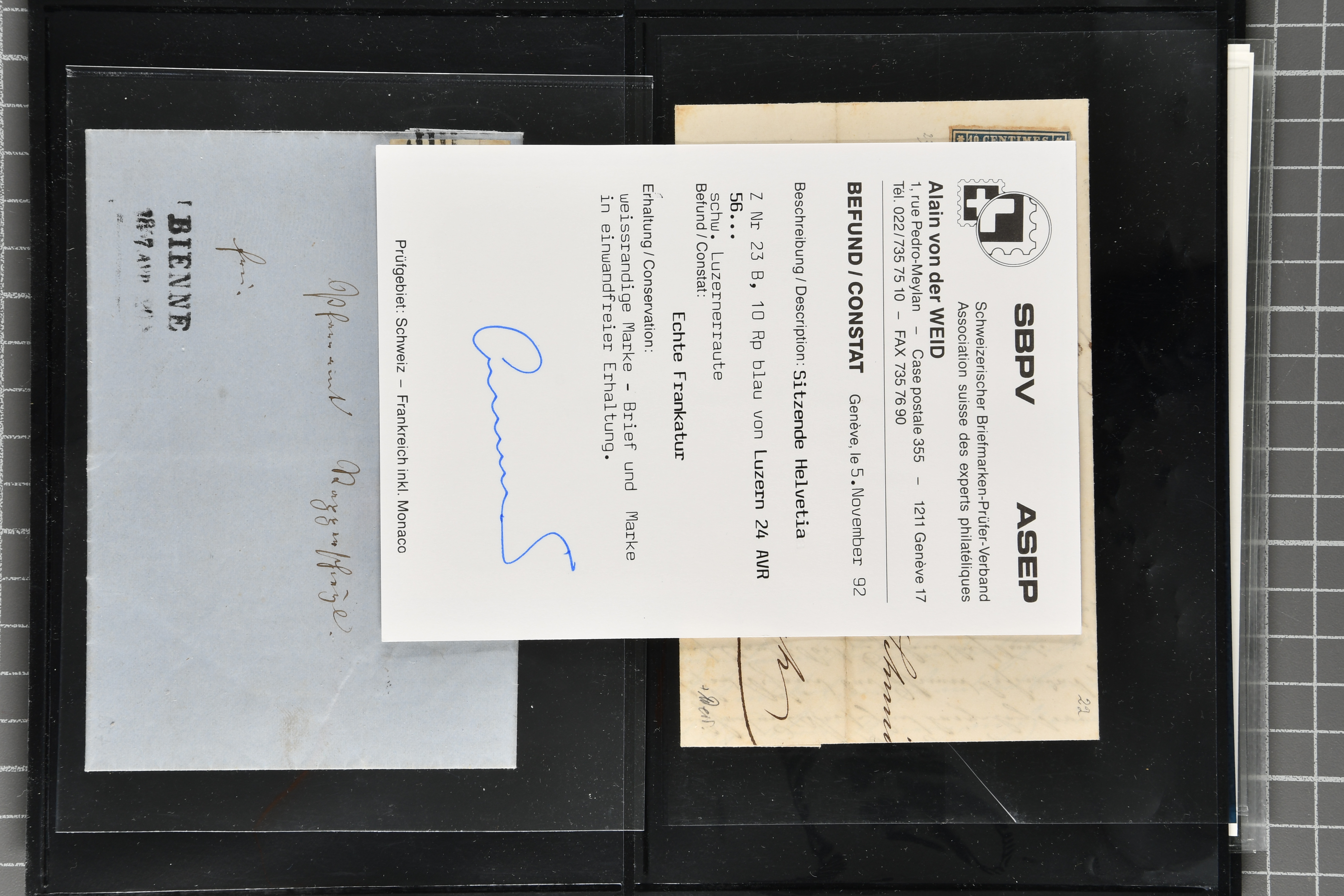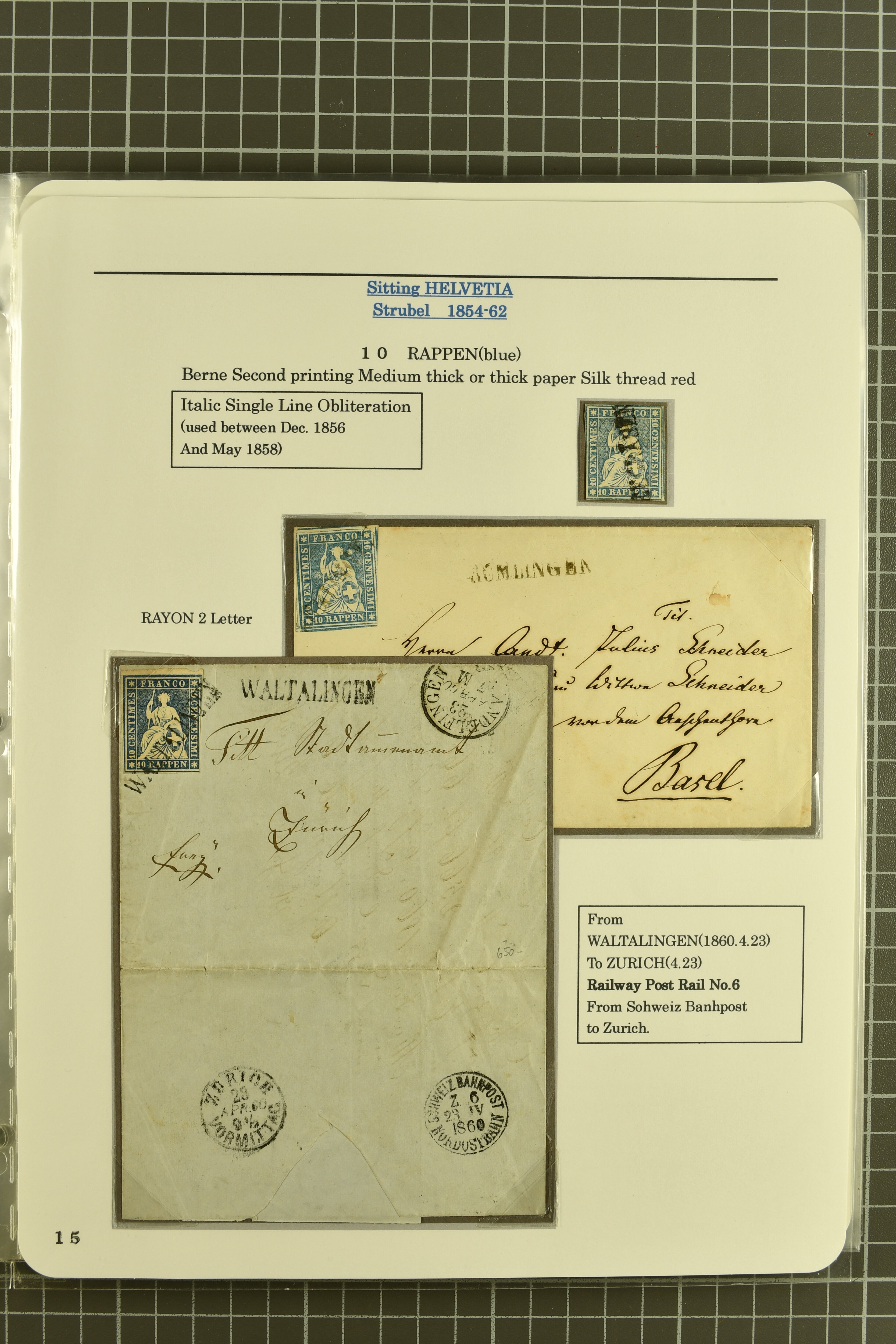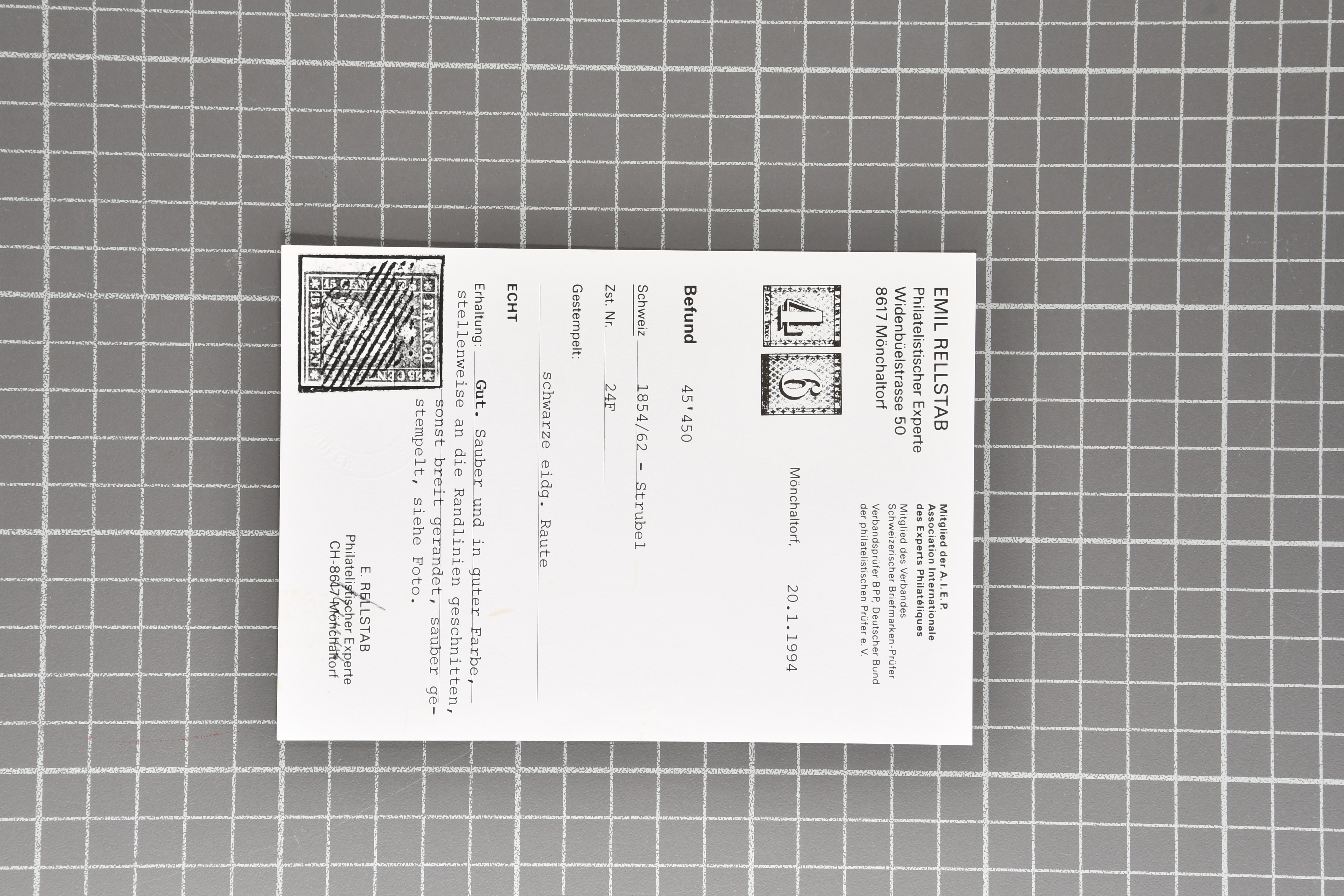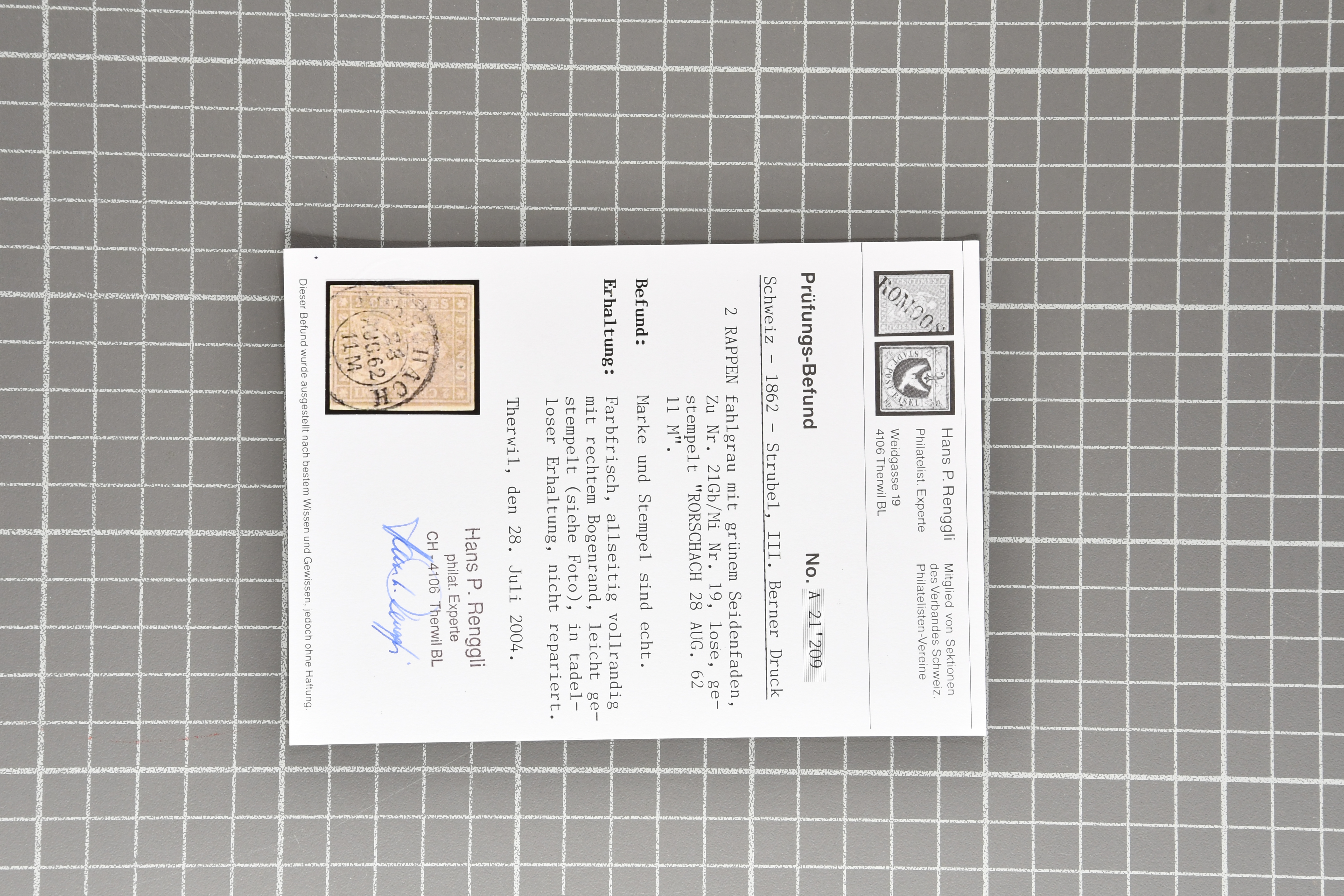 9792 cover image1854/62: Lot 20 Strubelfrankaturen. Dabei, 10 Rp. blau (2) und 15 Rp. rötlichkarmin (SBK 24B), meist weissrandig und mit deutlich ausgeprägtem Relief, je klar entw. mit schwarzer Genfer Raute auf Damenbriefumschlag nach Paris (F), 10 Rp. lebhaftpreussischblau auf dünnem Zürcher Papier (SBK 23E) mit Bogenrand rechts, entw. mit seltener 7-liniger Raute von Biel (AW 52), 10 Rp. grauultramarin auf dünnem Münchner Papier (SBK 23F) auf frischem Faltbrief von Bern nach Thun, 15 Rp. rötlichkarmin (SBK 24F), farbfr. und weissrandig auf kleinformatigem Faltbrief mit Vermerk "sehr bressant" von St. Gallen nach Ossingen (ZH), sehr farbfr. 20 Rp. gelblichorange (SBK 25F) auf Nachnahmebrief im 2. Briefkreis von Aarau nach Dornach (SO) oder 2 Rp. grau (SBK 21G) auf Drucksache von Winterthur nach Basel. Vorab gute Erhaltung; drei Befunde, sechs Atteste. SBK=CHF 10'000 (Image 1) (Image 2) (Image 3) (Image 4) (Image 5) (Image 6) (Image 7) (Image 8) (Image 9) (Image 10) (Image 11) (Image 12) (Image 13) (Image 14) (Image 15) (Image 16) (Image 17) (Image 18) (Image 19) (Image 20) (Image 21)
