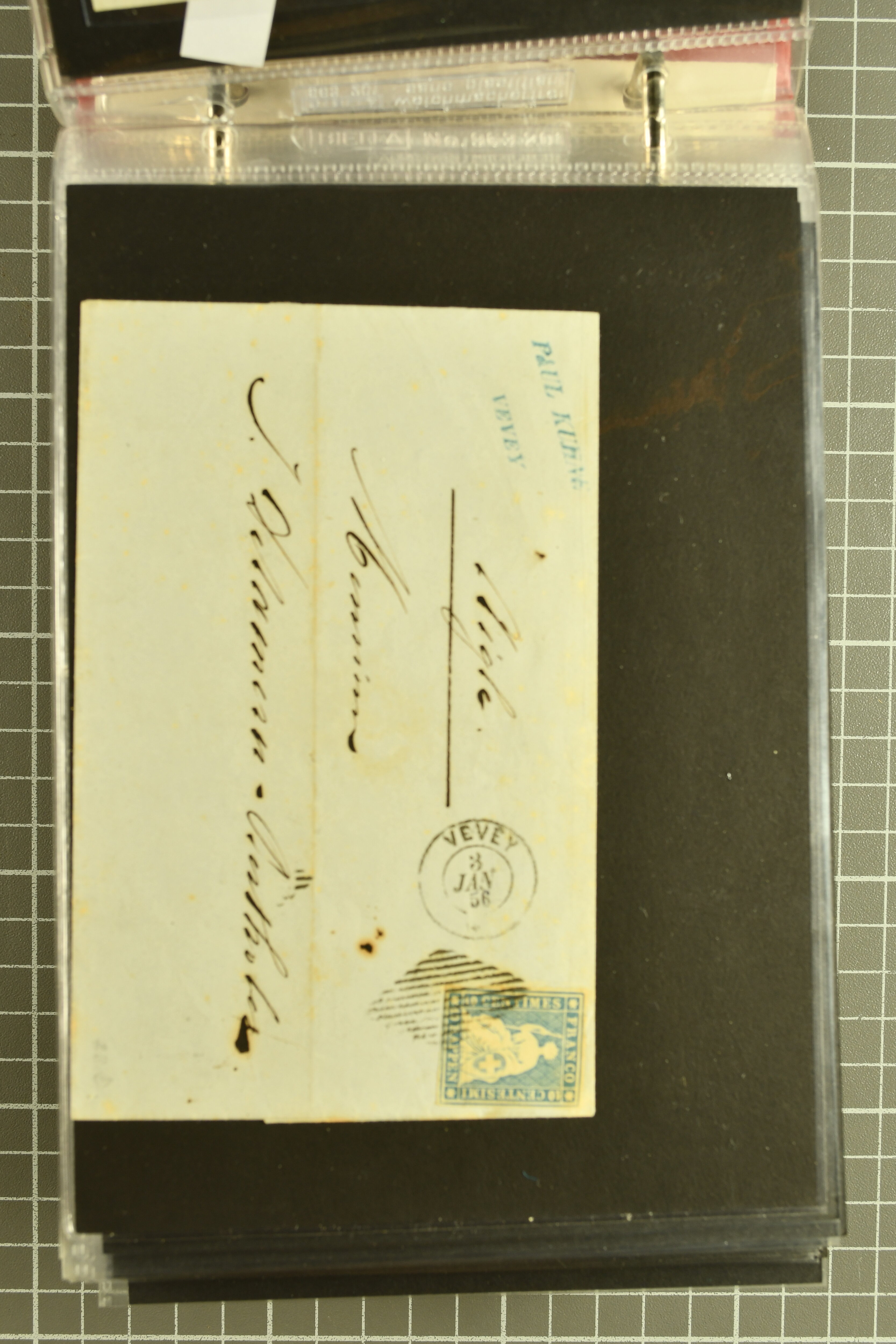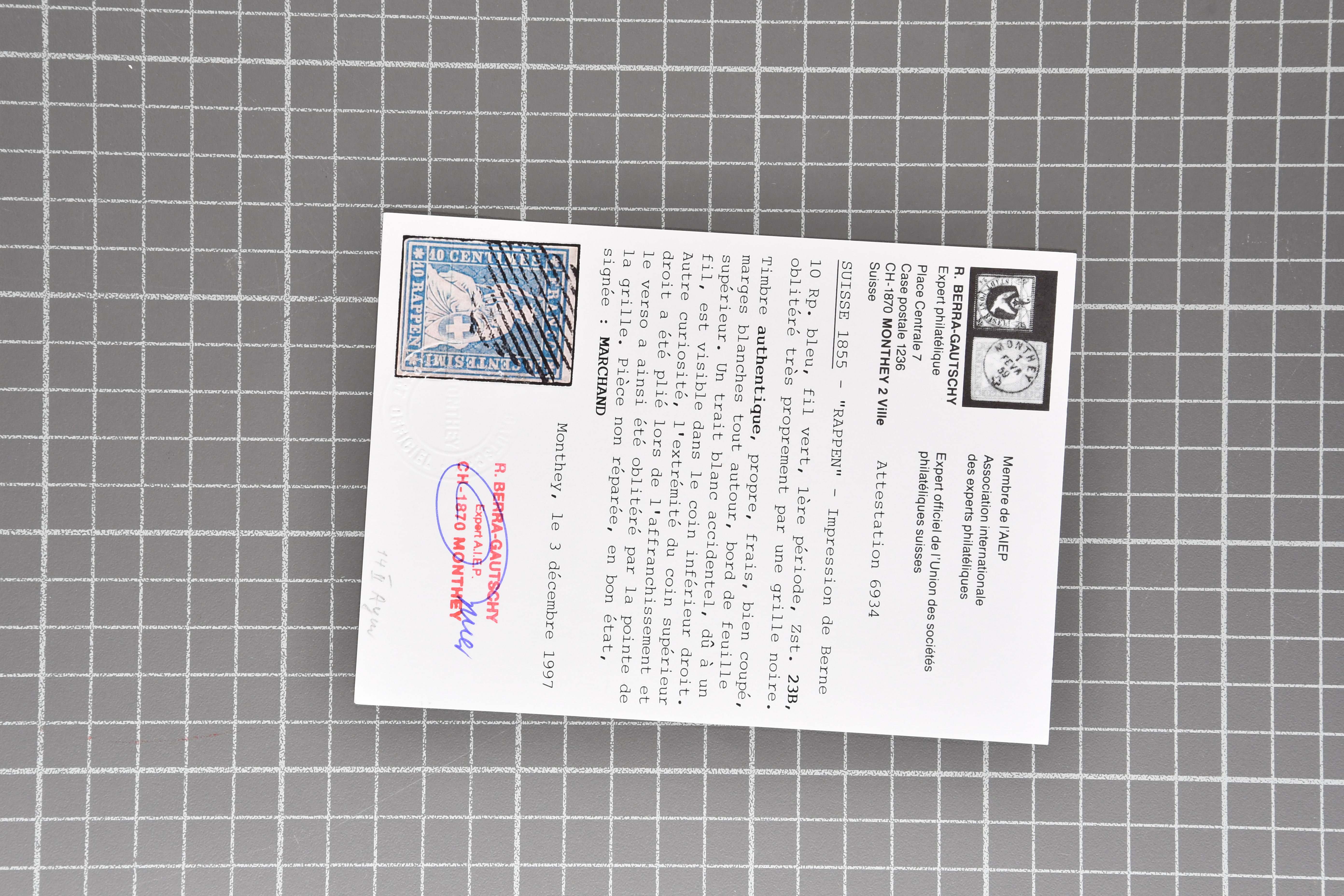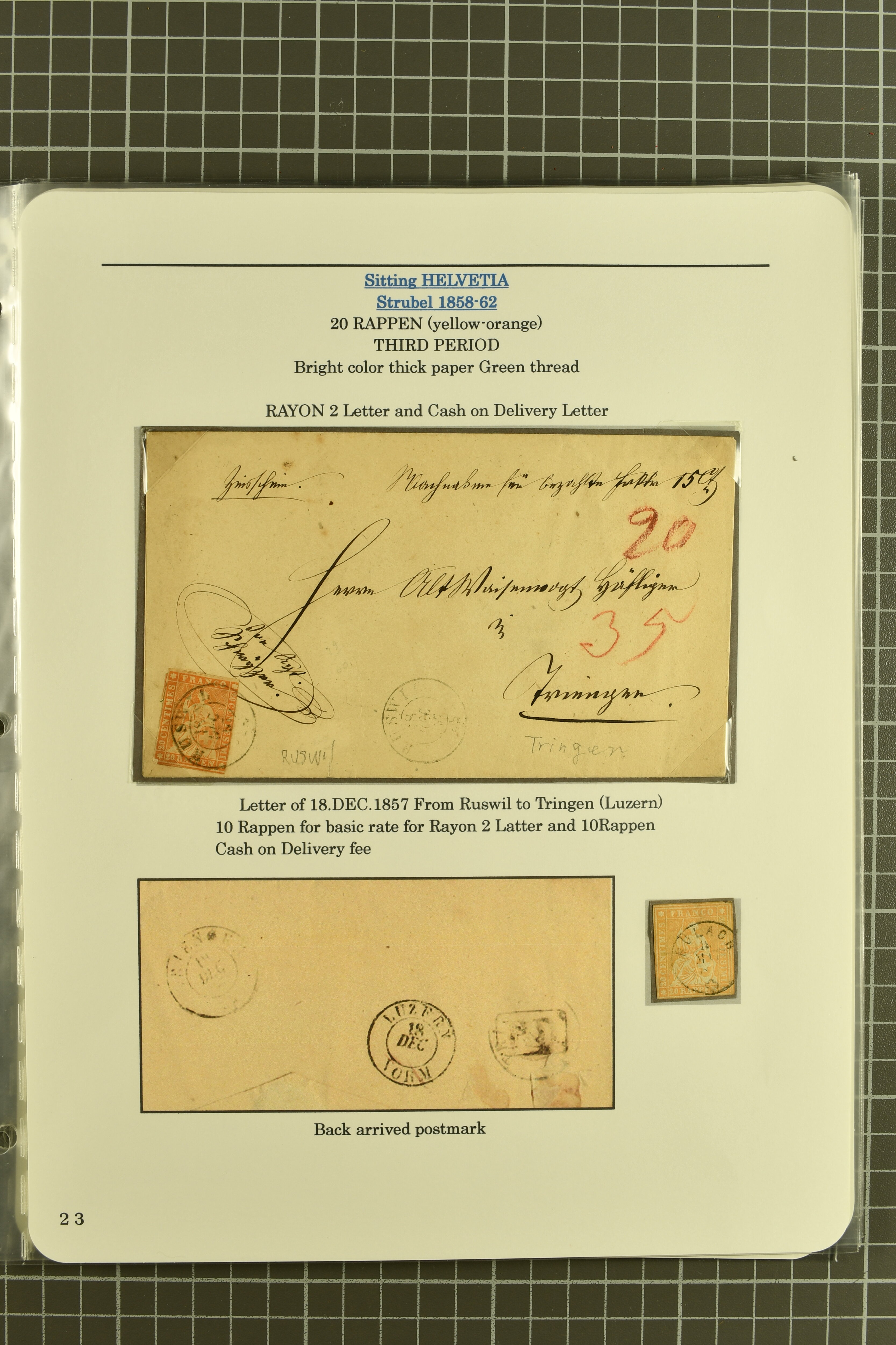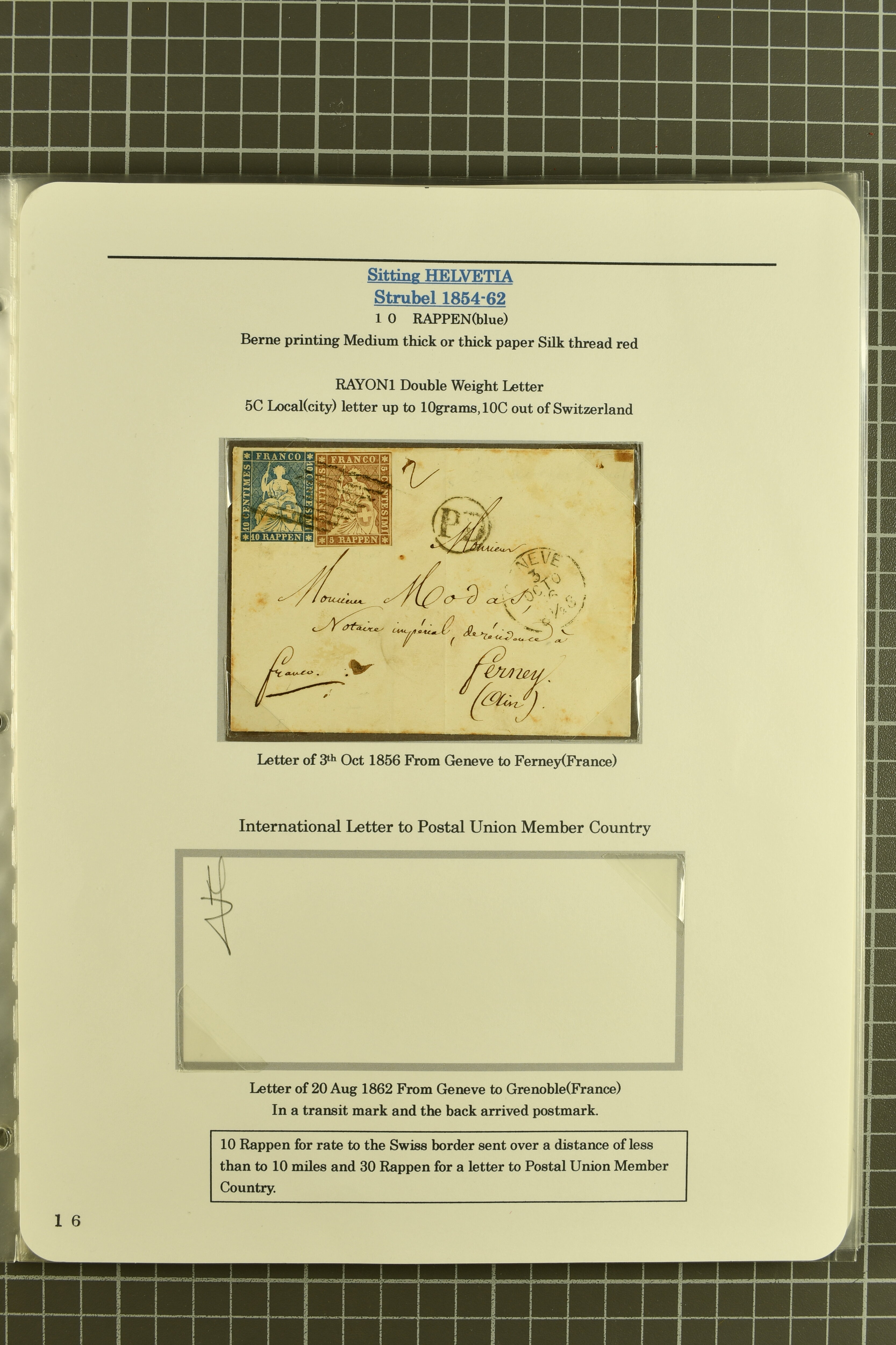 9792 cover image1854/62: Lot 20 Strubelfrankaturen. Dabei, 10 Rp. blau (2) und 15 Rp. rötlichkarmin (SBK 24B), meist weissrandig und mit deutlich ausgeprägtem Relief, je klar entw. mit schwarzer Genfer Raute auf Damenbriefumschlag nach Paris (F), 10 Rp. lebhaftpreussischblau auf dünnem Zürcher Papier (SBK 23E) mit Bogenrand rechts, entw. mit seltener 7-liniger Raute von Biel (AW 52), 10 Rp. grauultramarin auf dünnem Münchner Papier (SBK 23F) auf frischem Faltbrief von Bern nach Thun, 15 Rp. rötlichkarmin (SBK 24F), farbfr. und weissrandig auf kleinformatigem Faltbrief mit Vermerk "sehr bressant" von St. Gallen nach Ossingen (ZH), sehr farbfr. 20 Rp. gelblichorange (SBK 25F) auf Nachnahmebrief im 2. Briefkreis von Aarau nach Dornach (SO) oder 2 Rp. grau (SBK 21G) auf Drucksache von Winterthur nach Basel. Vorab gute Erhaltung; drei Befunde, sechs Atteste. SBK=CHF 10'000 (Image 1) (Image 2) (Image 3) (Image 4) (Image 5) (Image 6) (Image 7) (Image 8) (Image 9) (Image 10) (Image 11) (Image 12) (Image 13) (Image 14) (Image 15) (Image 16) (Image 17) (Image 18) (Image 19) (Image 20) (Image 21)