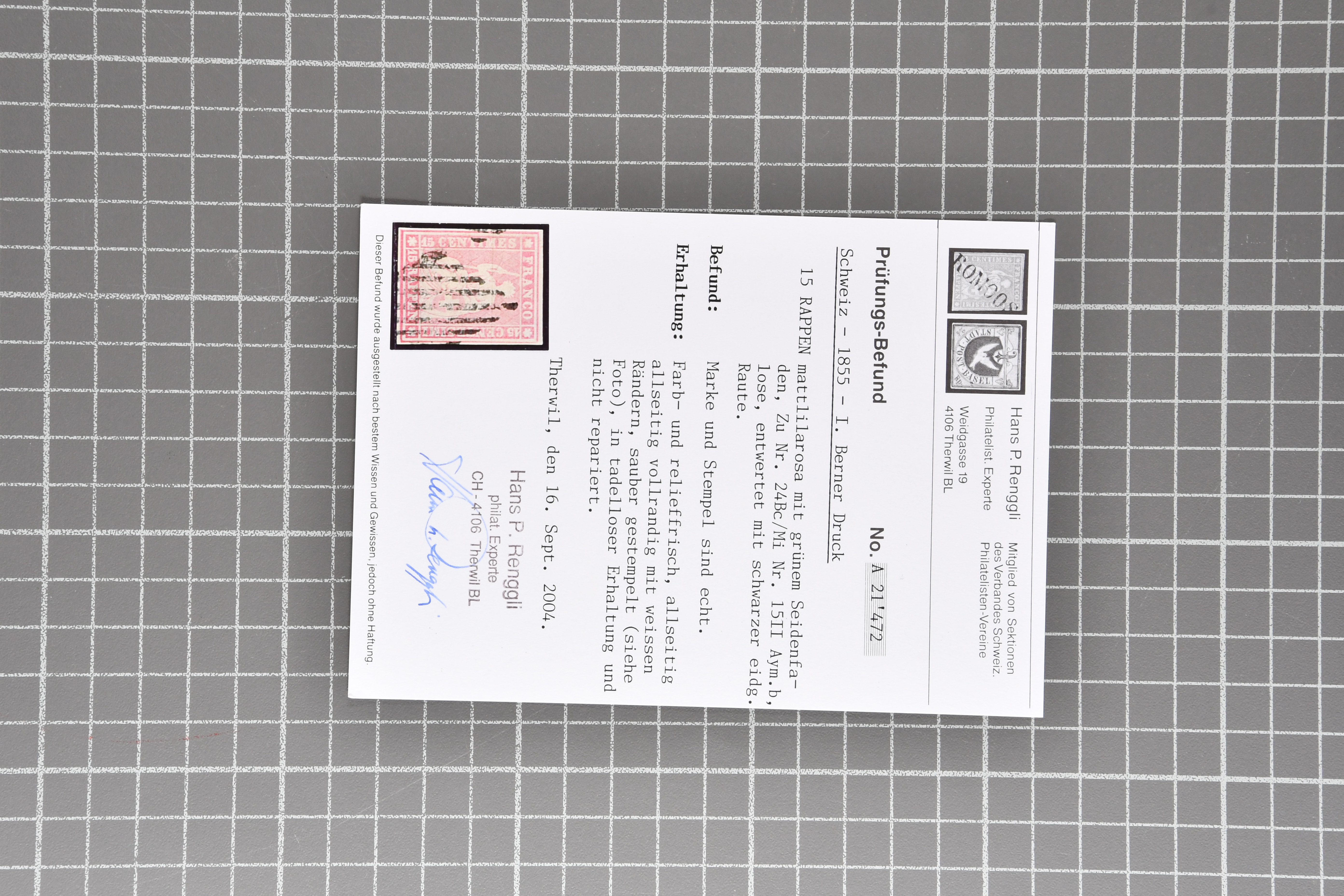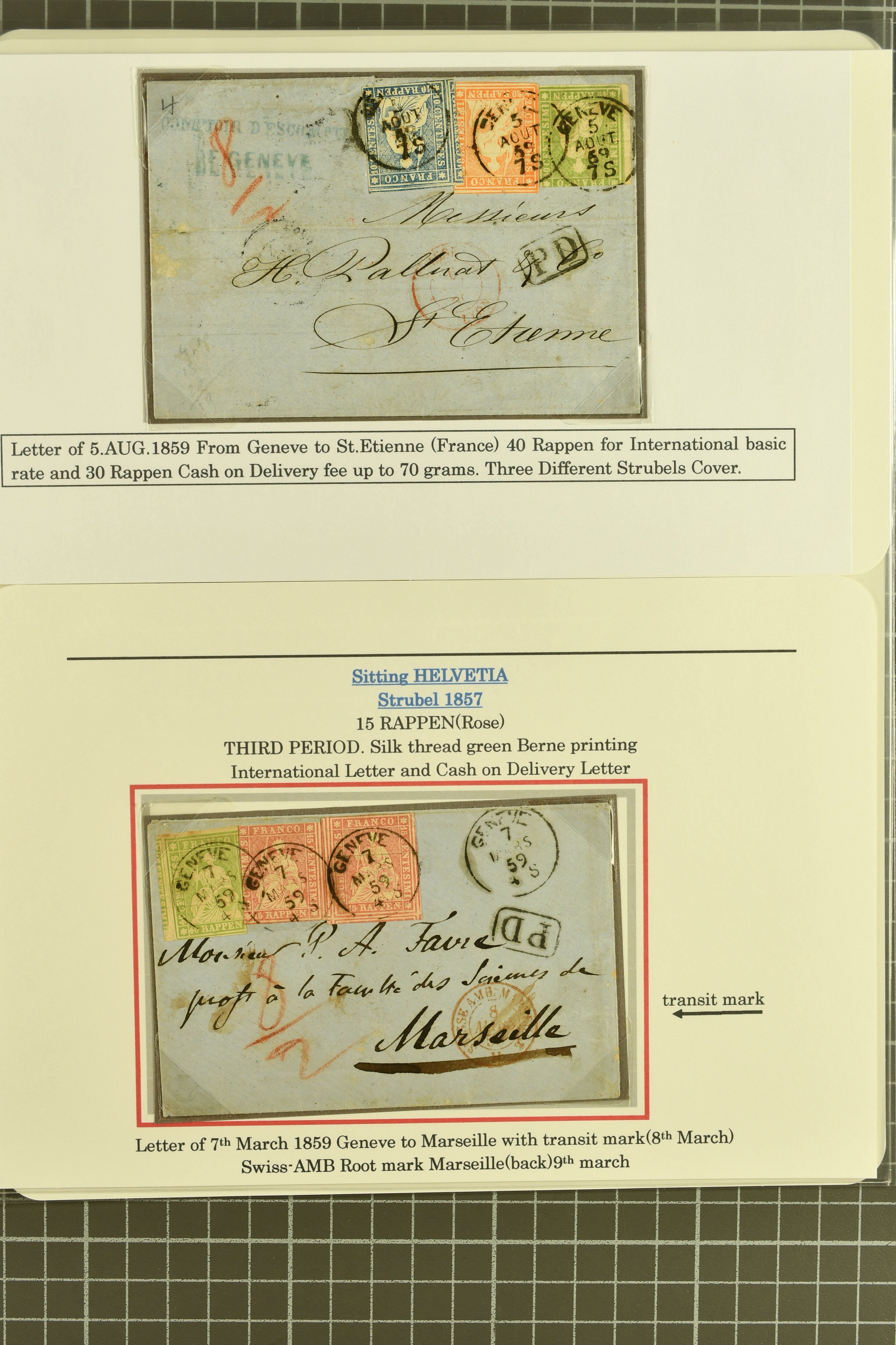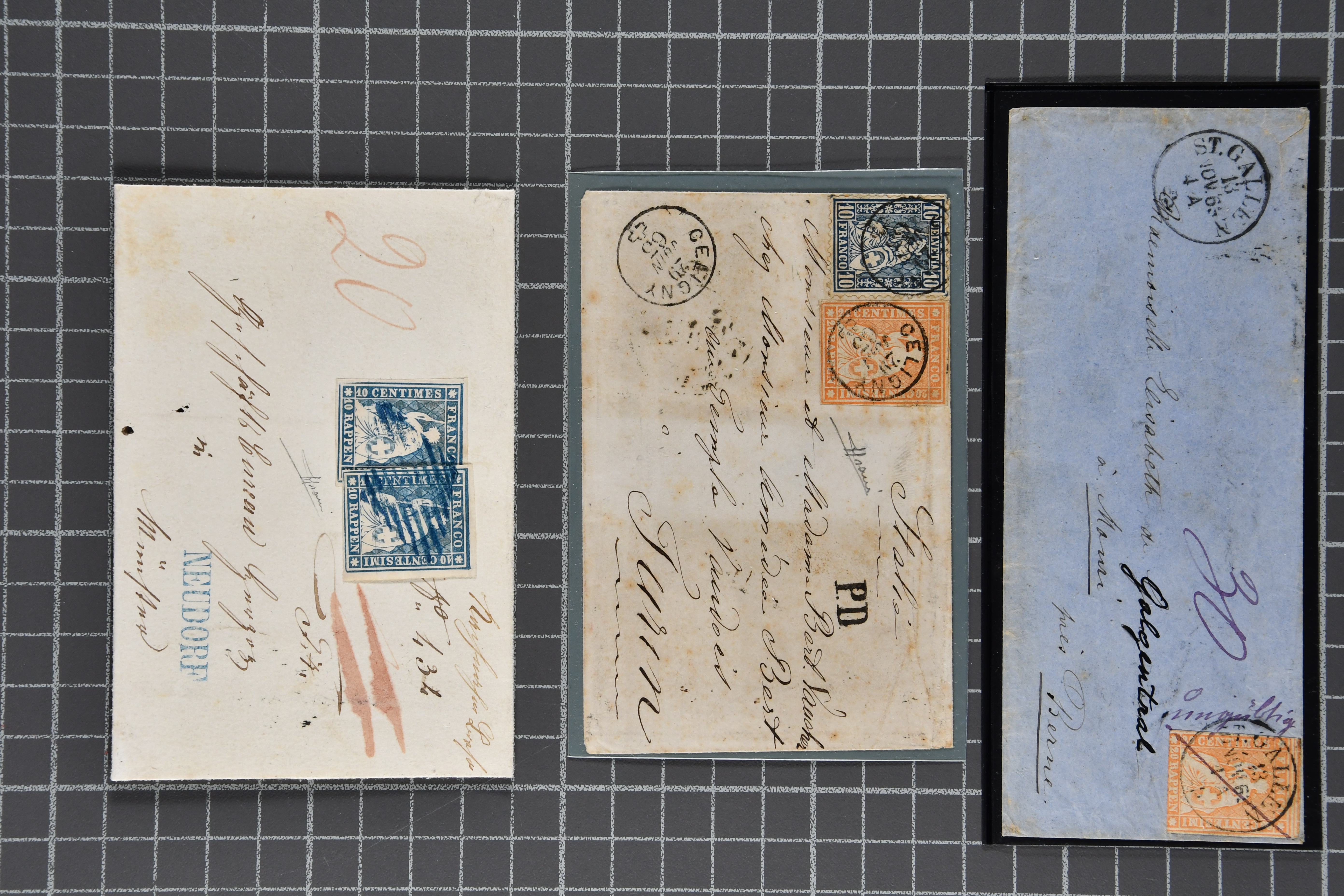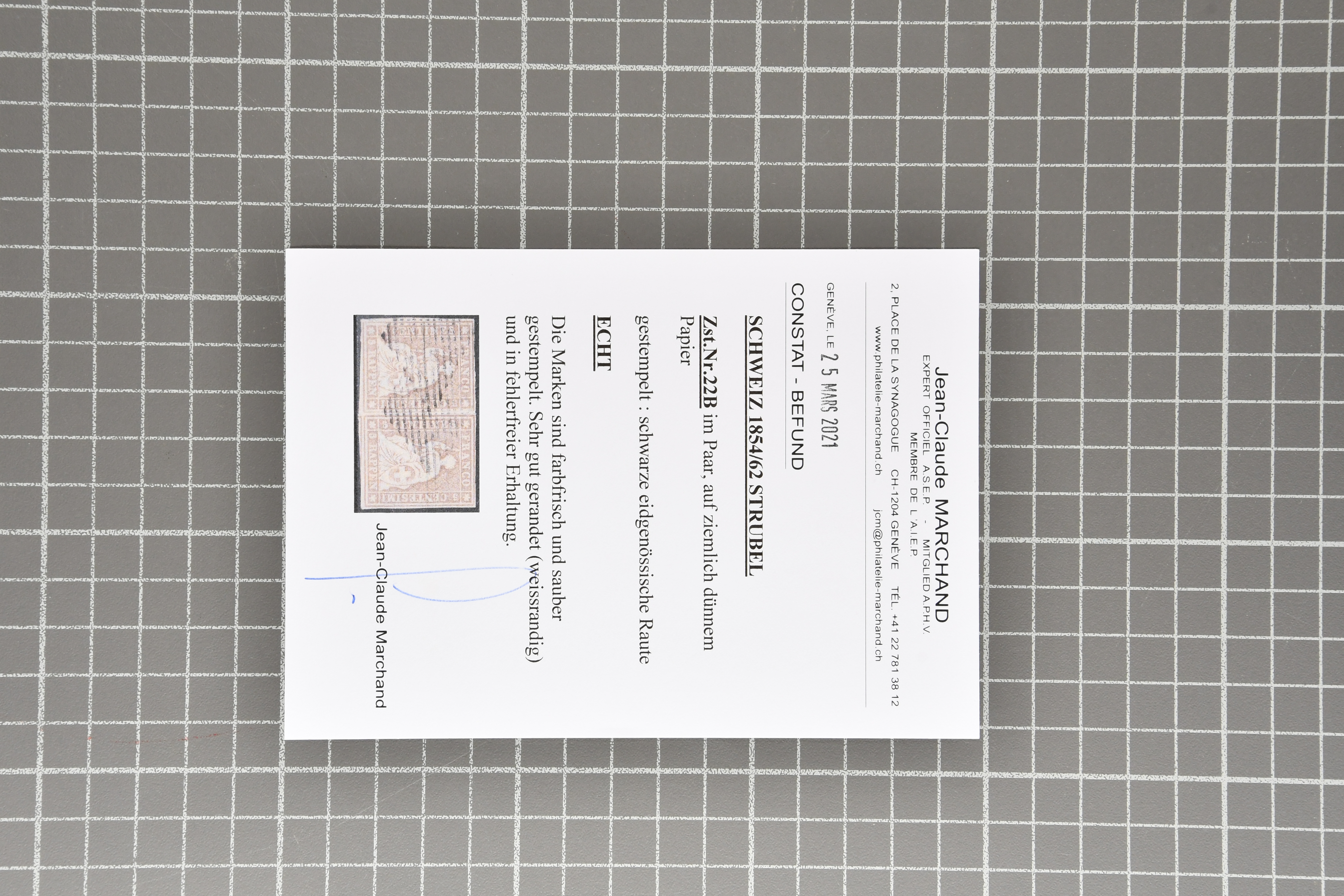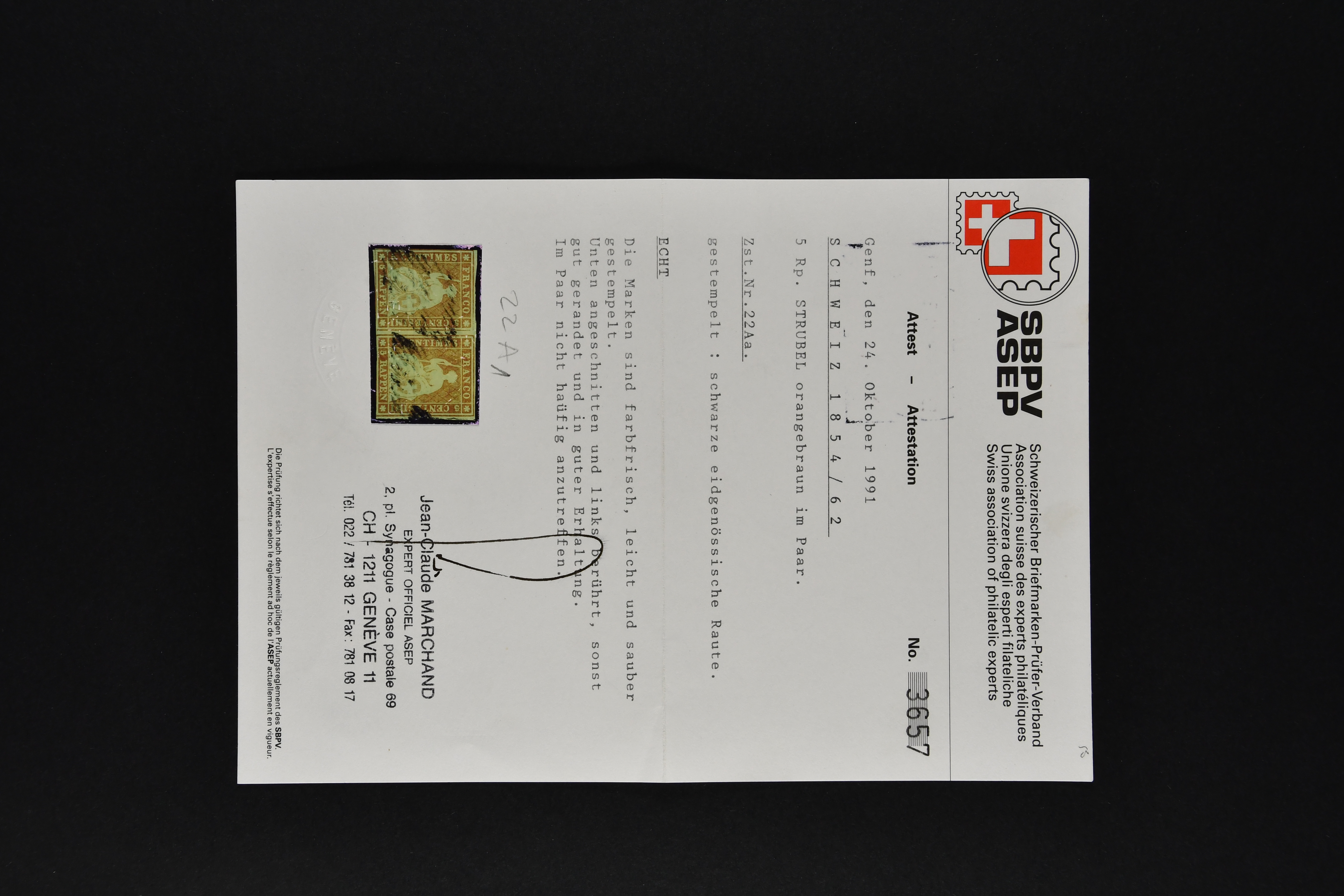9792 cover image1854/62: Lot 20 Strubelfrankaturen. Dabei, 10 Rp. blau (2) und 15 Rp. rötlichkarmin (SBK 24B), meist weissrandig und mit deutlich ausgeprägtem Relief, je klar entw. mit schwarzer Genfer Raute auf Damenbriefumschlag nach Paris (F), 10 Rp. lebhaftpreussischblau auf dünnem Zürcher Papier (SBK 23E) mit Bogenrand rechts, entw. mit seltener 7-liniger Raute von Biel (AW 52), 10 Rp. grauultramarin auf dünnem Münchner Papier (SBK 23F) auf frischem Faltbrief von Bern nach Thun, 15 Rp. rötlichkarmin (SBK 24F), farbfr. und weissrandig auf kleinformatigem Faltbrief mit Vermerk "sehr bressant" von St. Gallen nach Ossingen (ZH), sehr farbfr. 20 Rp. gelblichorange (SBK 25F) auf Nachnahmebrief im 2. Briefkreis von Aarau nach Dornach (SO) oder 2 Rp. grau (SBK 21G) auf Drucksache von Winterthur nach Basel. Vorab gute Erhaltung; drei Befunde, sechs Atteste. SBK=CHF 10'000 (Image 1) (Image 2) (Image 3) (Image 4) (Image 5) (Image 6) (Image 7) (Image 8) (Image 9) (Image 10) (Image 11) (Image 12) (Image 13) (Image 14) (Image 15) (Image 16) (Image 17) (Image 18) (Image 19) (Image 20) (Image 21)
