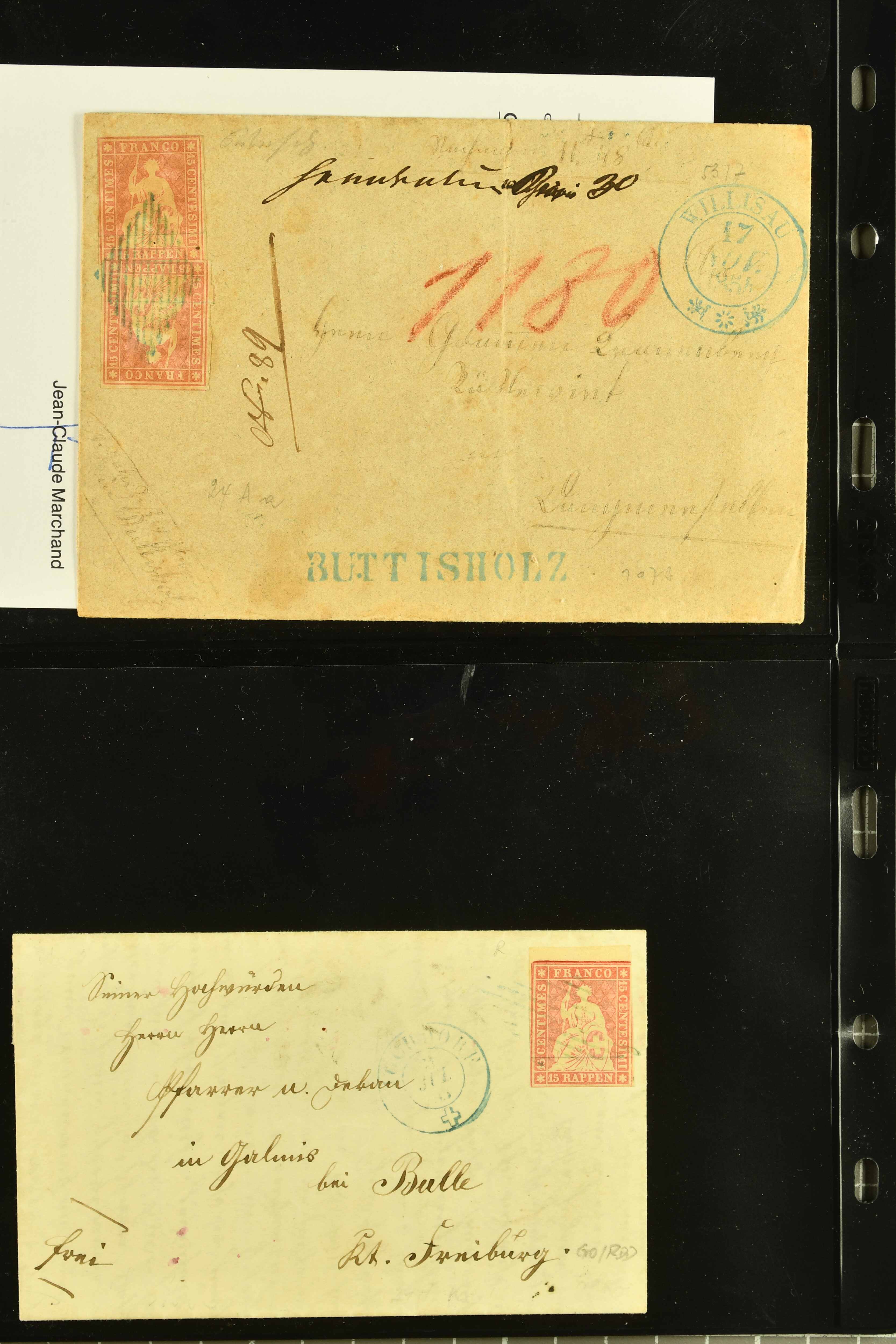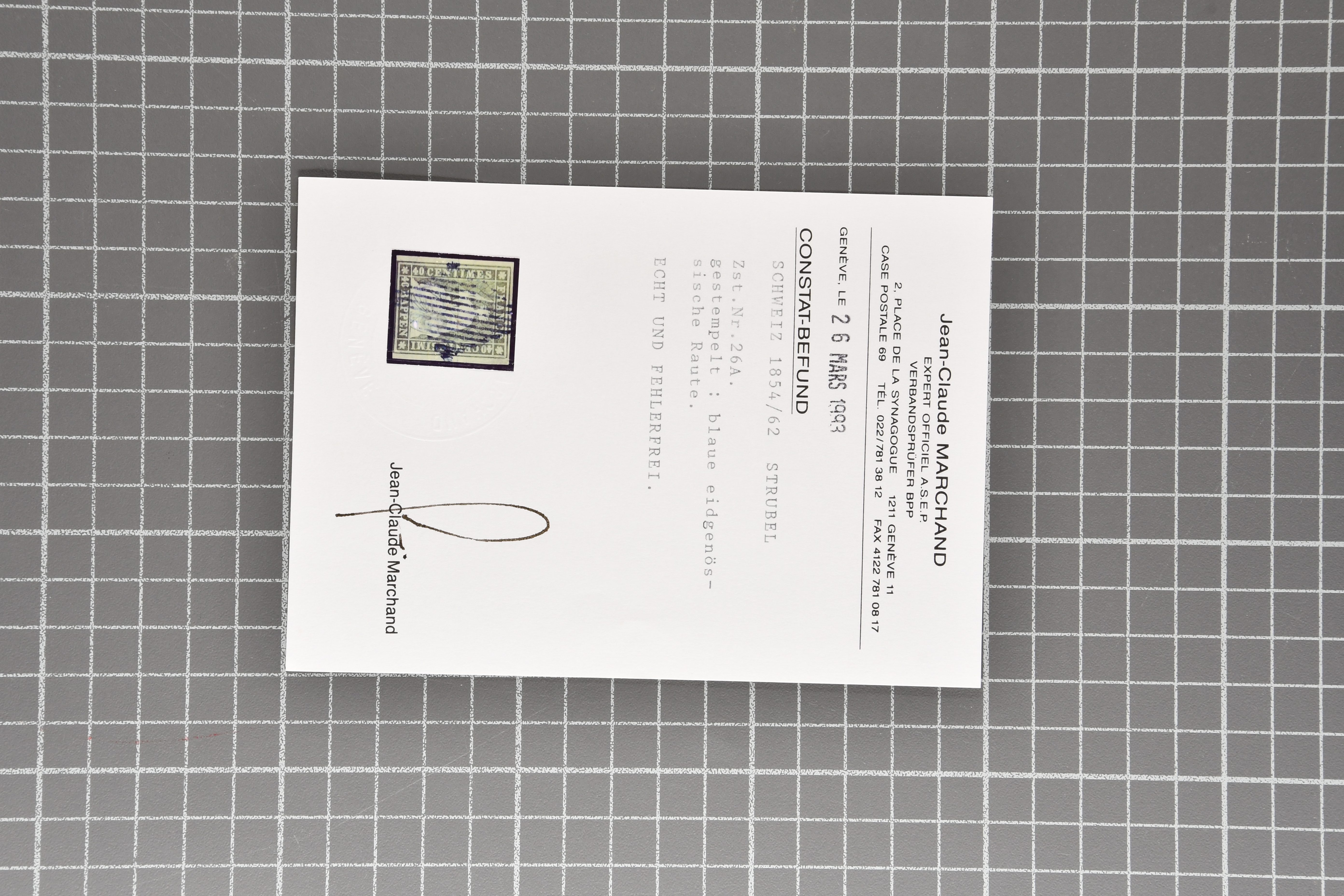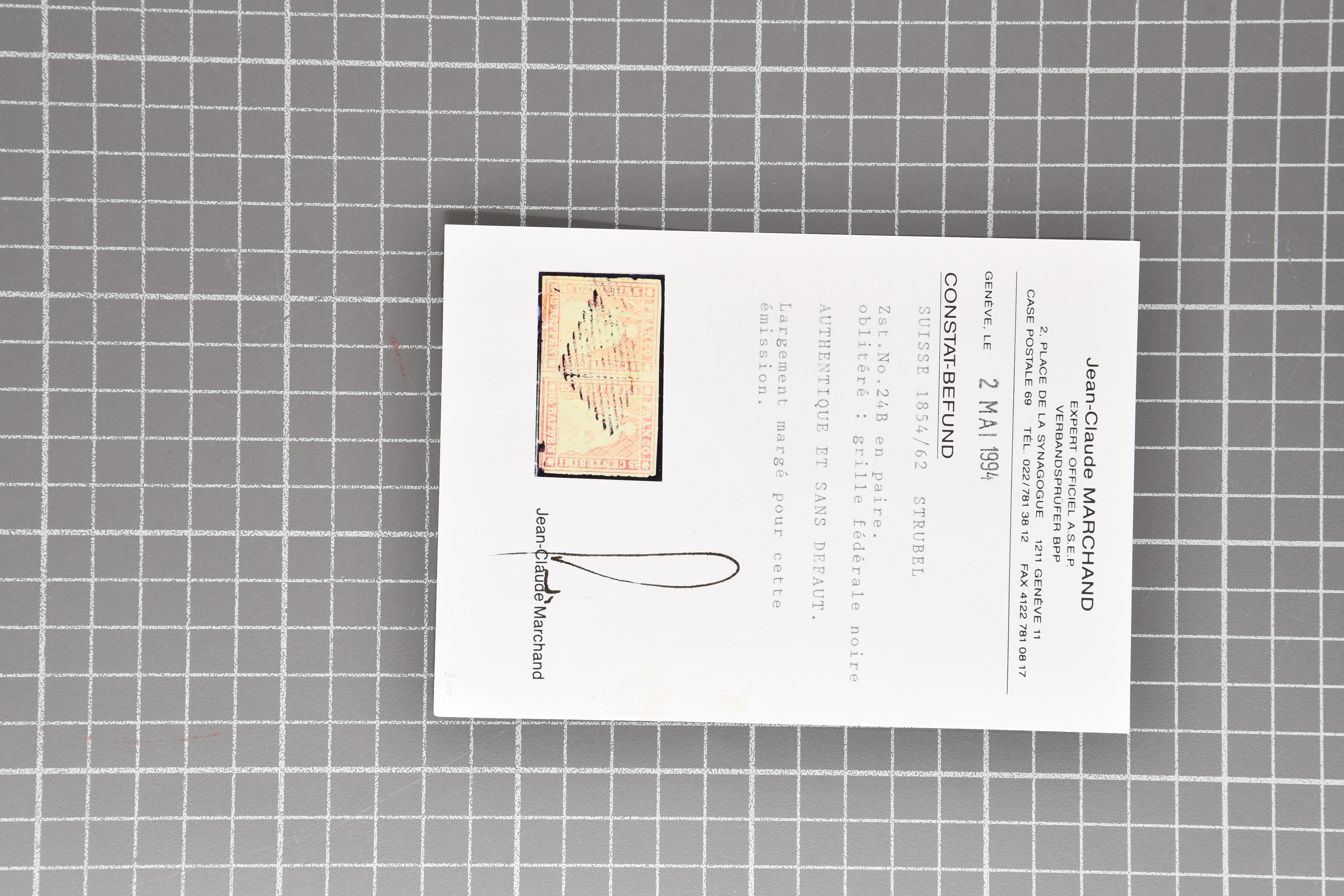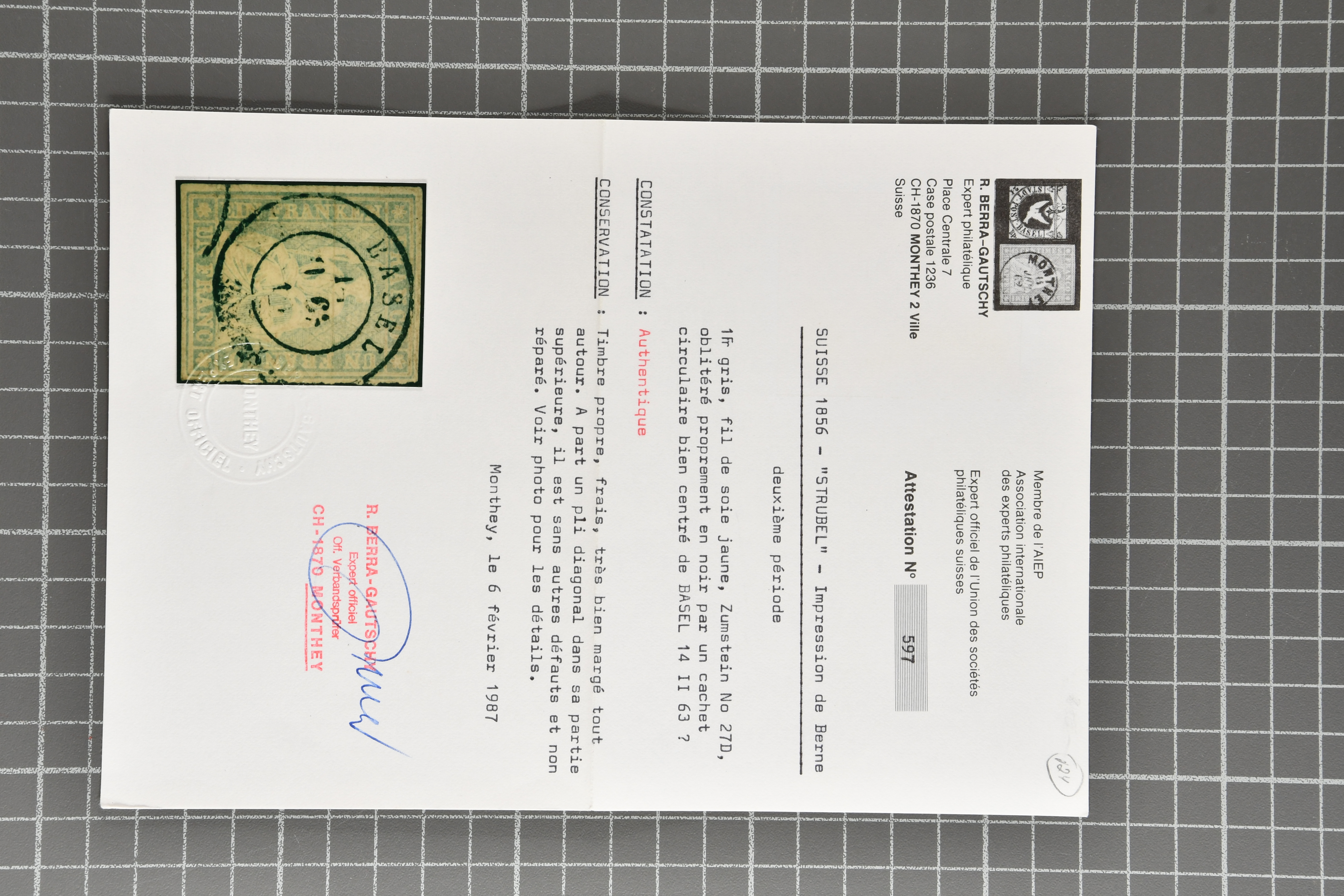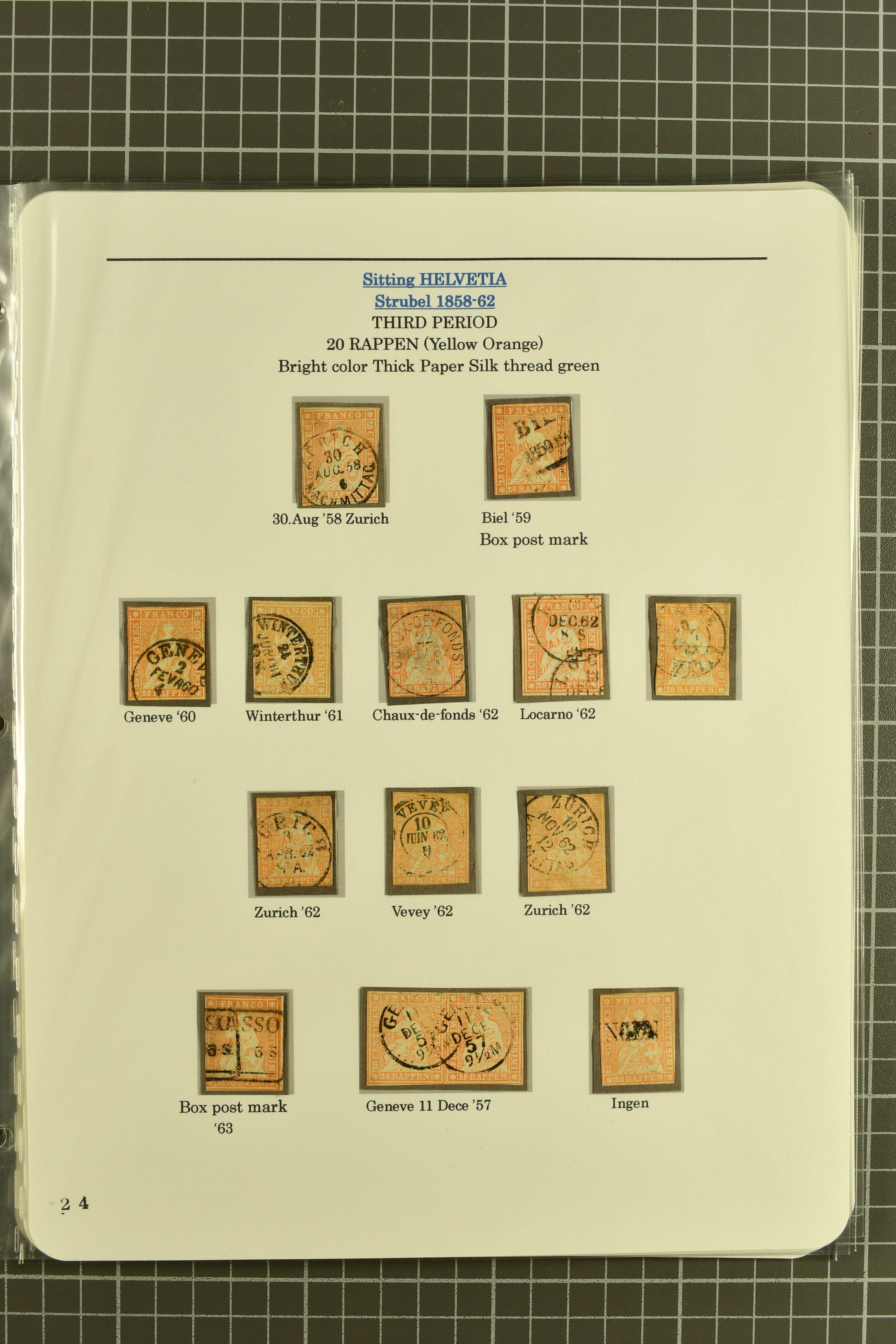 9792 cover image1854/62: Lot 20 Strubelfrankaturen. Dabei, 10 Rp. blau (2) und 15 Rp. rötlichkarmin (SBK 24B), meist weissrandig und mit deutlich ausgeprägtem Relief, je klar entw. mit schwarzer Genfer Raute auf Damenbriefumschlag nach Paris (F), 10 Rp. lebhaftpreussischblau auf dünnem Zürcher Papier (SBK 23E) mit Bogenrand rechts, entw. mit seltener 7-liniger Raute von Biel (AW 52), 10 Rp. grauultramarin auf dünnem Münchner Papier (SBK 23F) auf frischem Faltbrief von Bern nach Thun, 15 Rp. rötlichkarmin (SBK 24F), farbfr. und weissrandig auf kleinformatigem Faltbrief mit Vermerk "sehr bressant" von St. Gallen nach Ossingen (ZH), sehr farbfr. 20 Rp. gelblichorange (SBK 25F) auf Nachnahmebrief im 2. Briefkreis von Aarau nach Dornach (SO) oder 2 Rp. grau (SBK 21G) auf Drucksache von Winterthur nach Basel. Vorab gute Erhaltung; drei Befunde, sechs Atteste. SBK=CHF 10'000 (Image 1) (Image 2) (Image 3) (Image 4) (Image 5) (Image 6) (Image 7) (Image 8) (Image 9) (Image 10) (Image 11) (Image 12) (Image 13) (Image 14) (Image 15) (Image 16) (Image 17) (Image 18) (Image 19) (Image 20) (Image 21)
