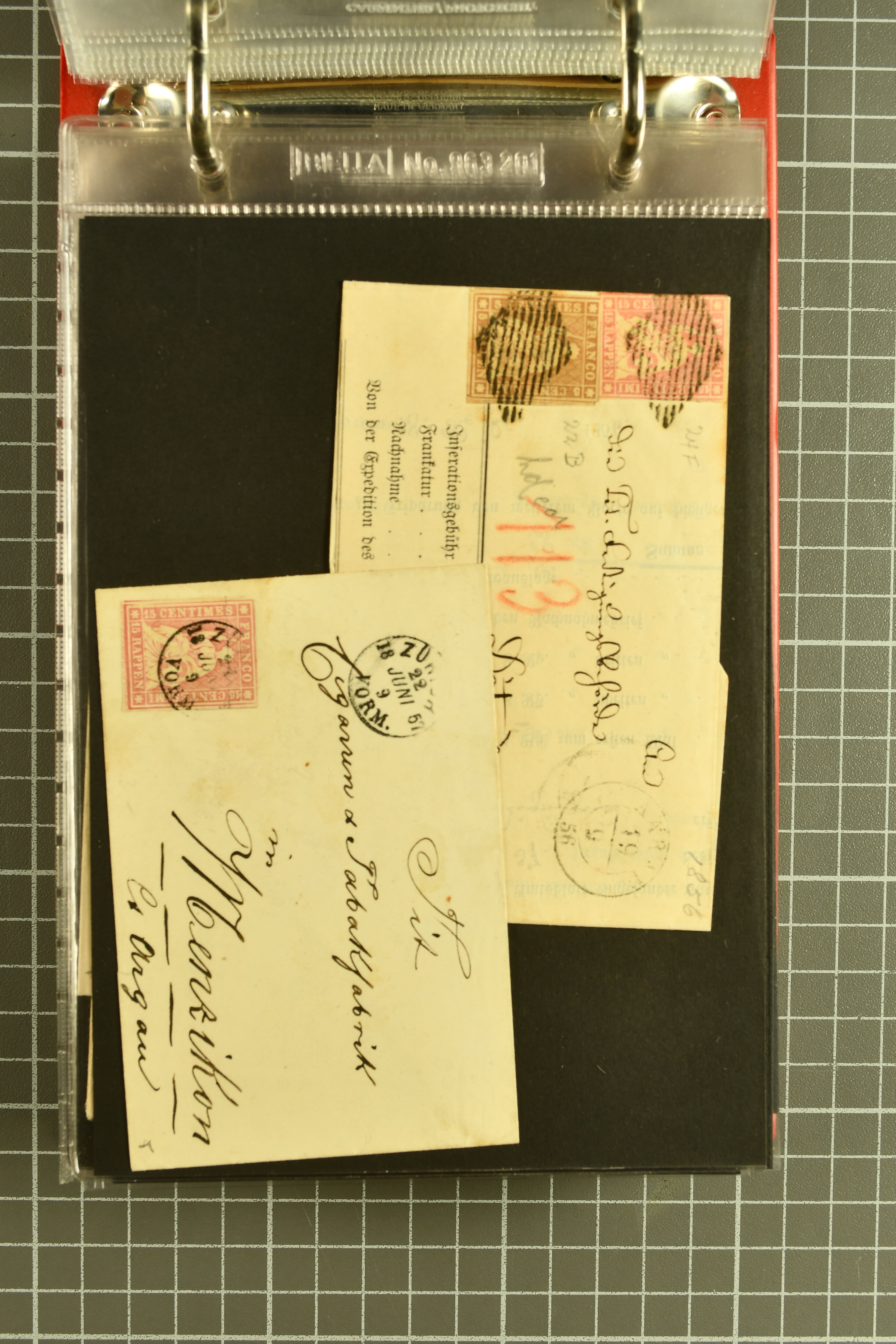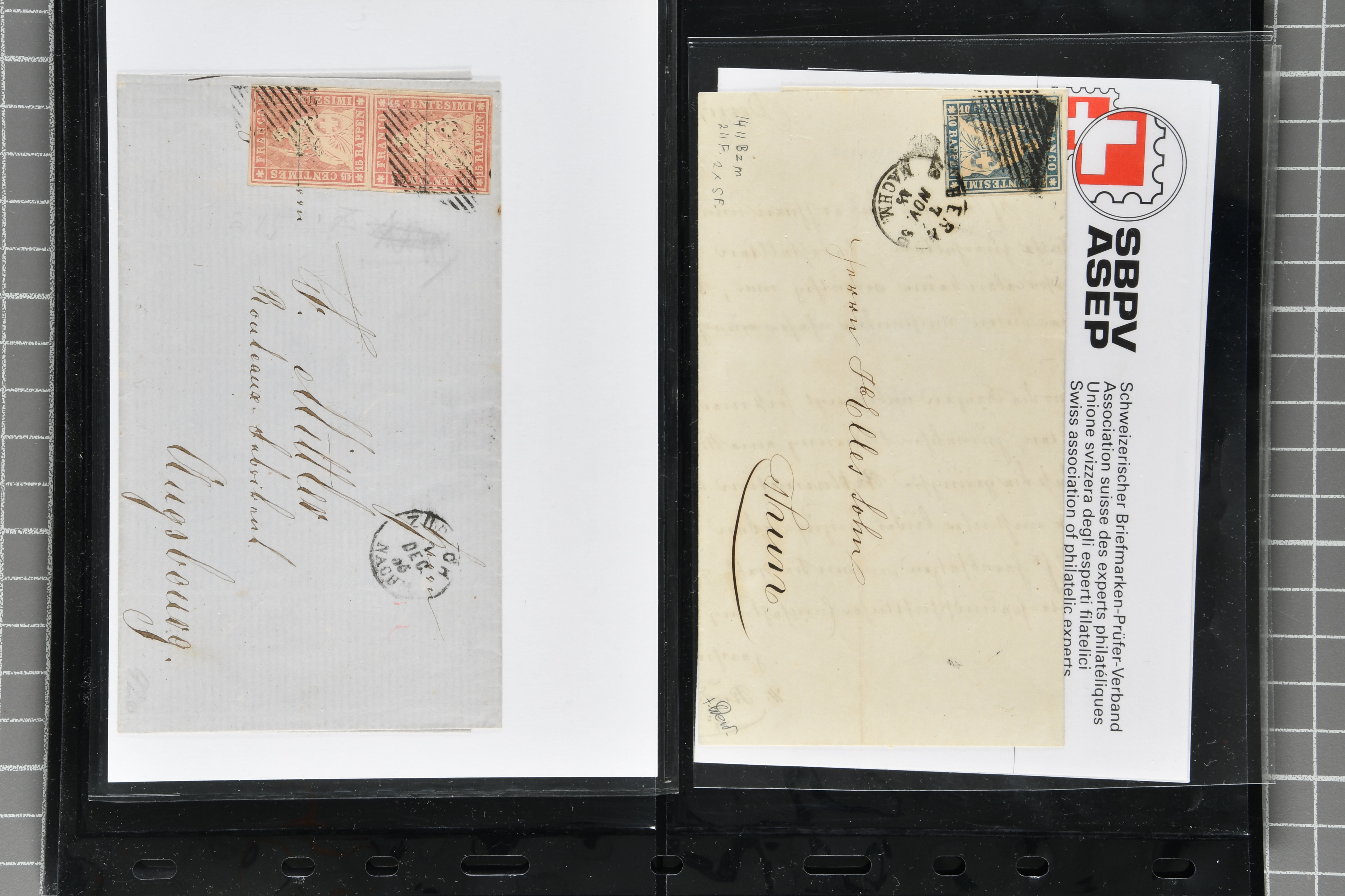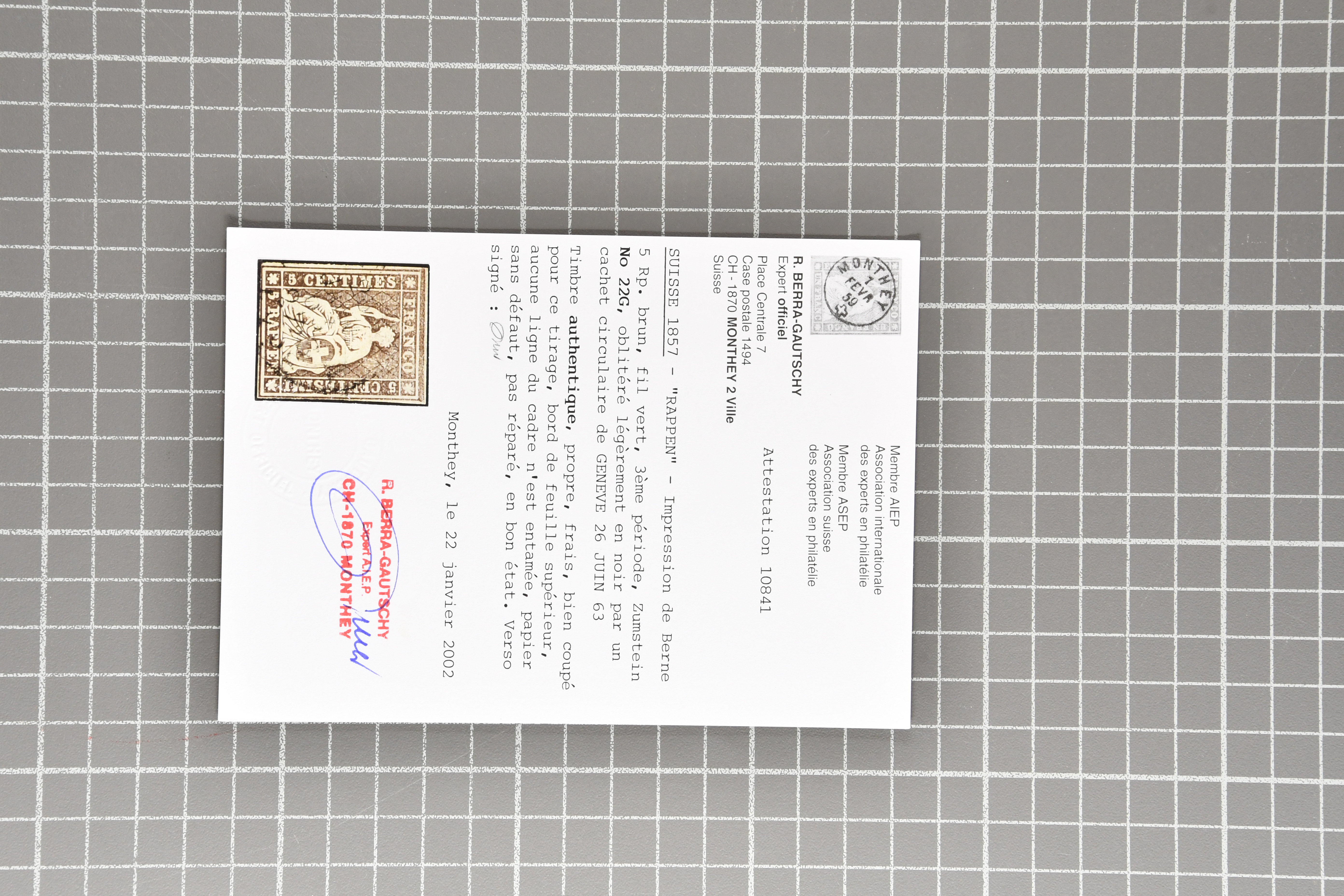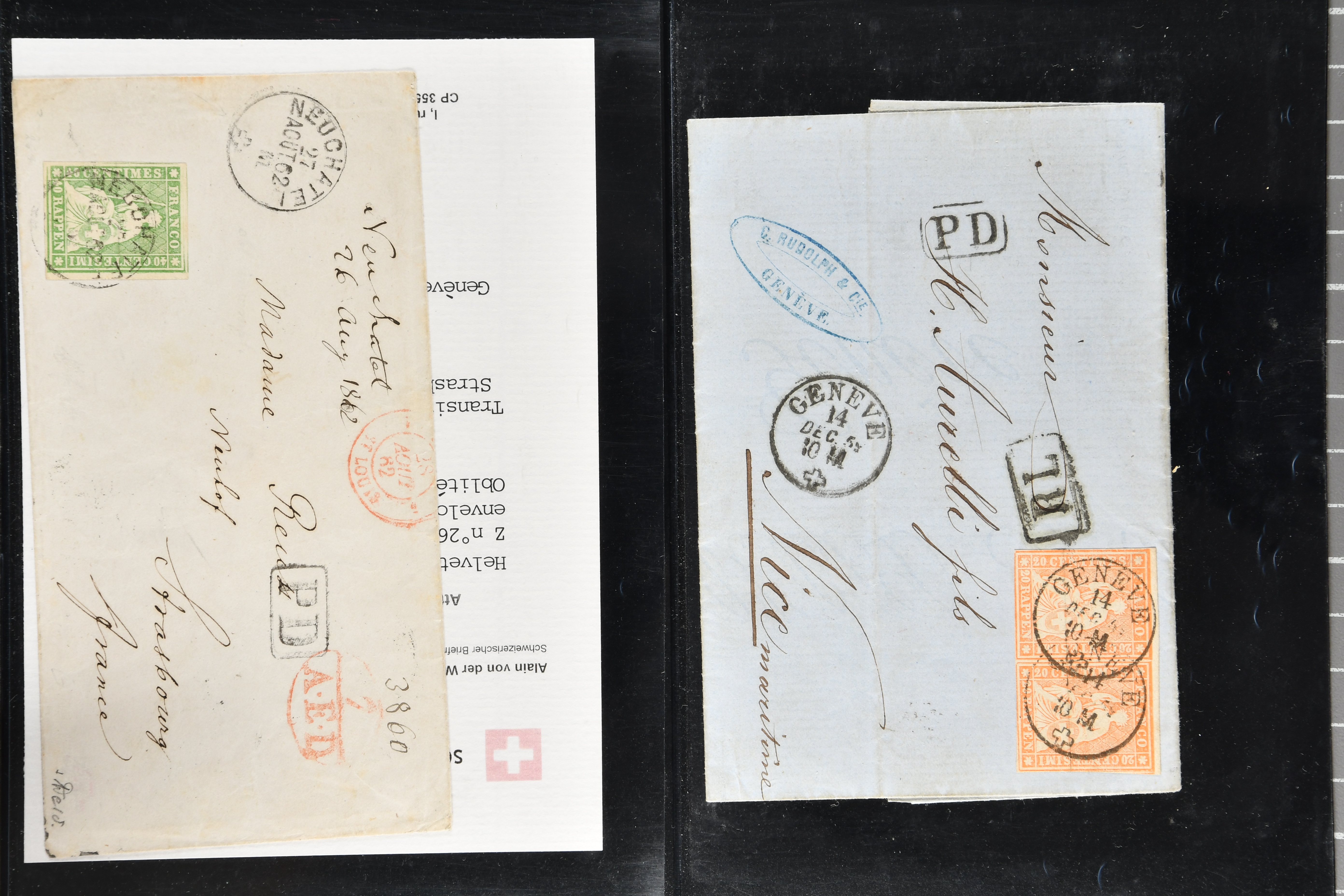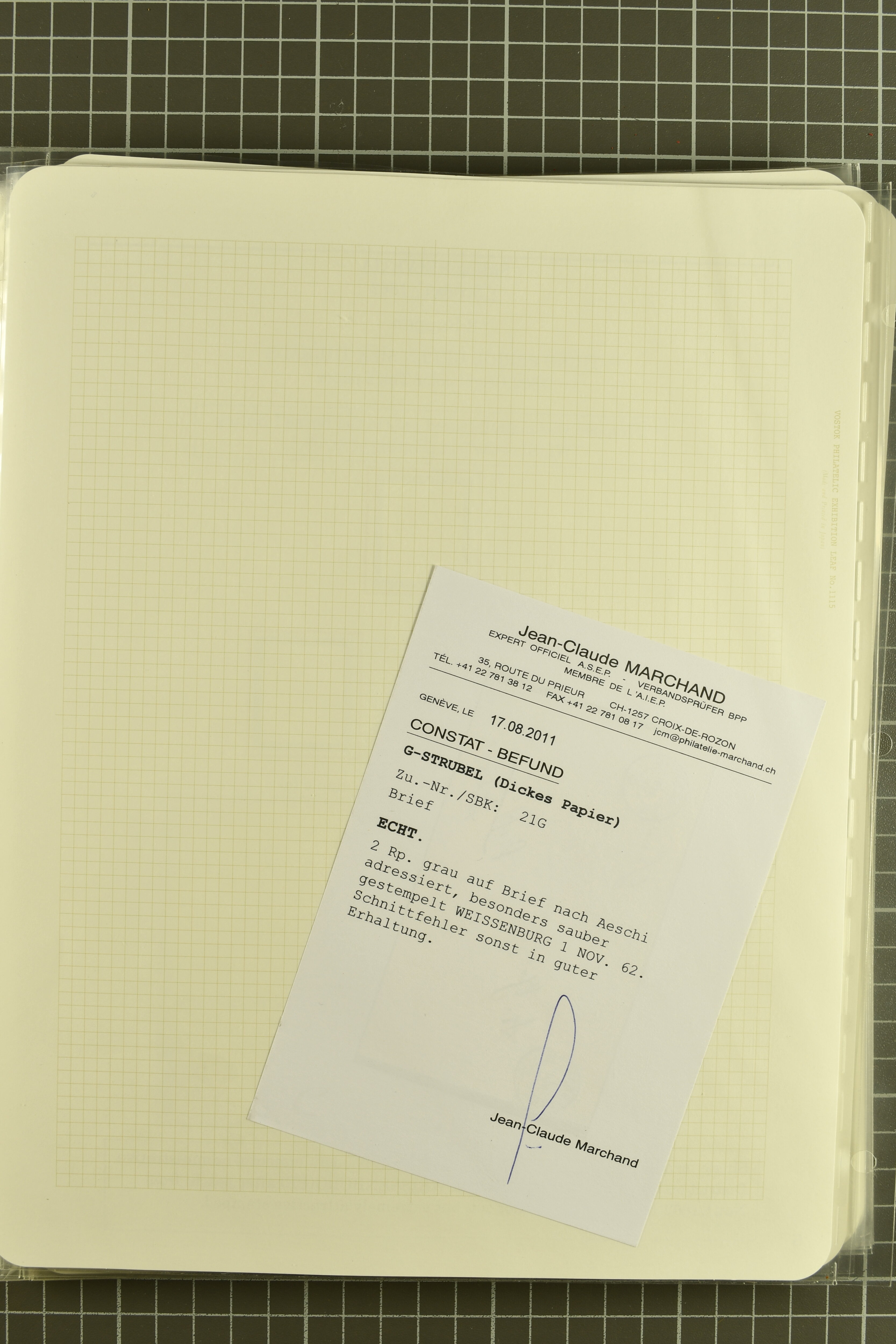 9792 cover image1854/62: Lot 20 Strubelfrankaturen. Dabei, 10 Rp. blau (2) und 15 Rp. rötlichkarmin (SBK 24B), meist weissrandig und mit deutlich ausgeprägtem Relief, je klar entw. mit schwarzer Genfer Raute auf Damenbriefumschlag nach Paris (F), 10 Rp. lebhaftpreussischblau auf dünnem Zürcher Papier (SBK 23E) mit Bogenrand rechts, entw. mit seltener 7-liniger Raute von Biel (AW 52), 10 Rp. grauultramarin auf dünnem Münchner Papier (SBK 23F) auf frischem Faltbrief von Bern nach Thun, 15 Rp. rötlichkarmin (SBK 24F), farbfr. und weissrandig auf kleinformatigem Faltbrief mit Vermerk "sehr bressant" von St. Gallen nach Ossingen (ZH), sehr farbfr. 20 Rp. gelblichorange (SBK 25F) auf Nachnahmebrief im 2. Briefkreis von Aarau nach Dornach (SO) oder 2 Rp. grau (SBK 21G) auf Drucksache von Winterthur nach Basel. Vorab gute Erhaltung; drei Befunde, sechs Atteste. SBK=CHF 10'000 (Image 1) (Image 2) (Image 3) (Image 4) (Image 5) (Image 6) (Image 7) (Image 8) (Image 9) (Image 10) (Image 11) (Image 12) (Image 13) (Image 14) (Image 15) (Image 16) (Image 17) (Image 18) (Image 19) (Image 20) (Image 21)