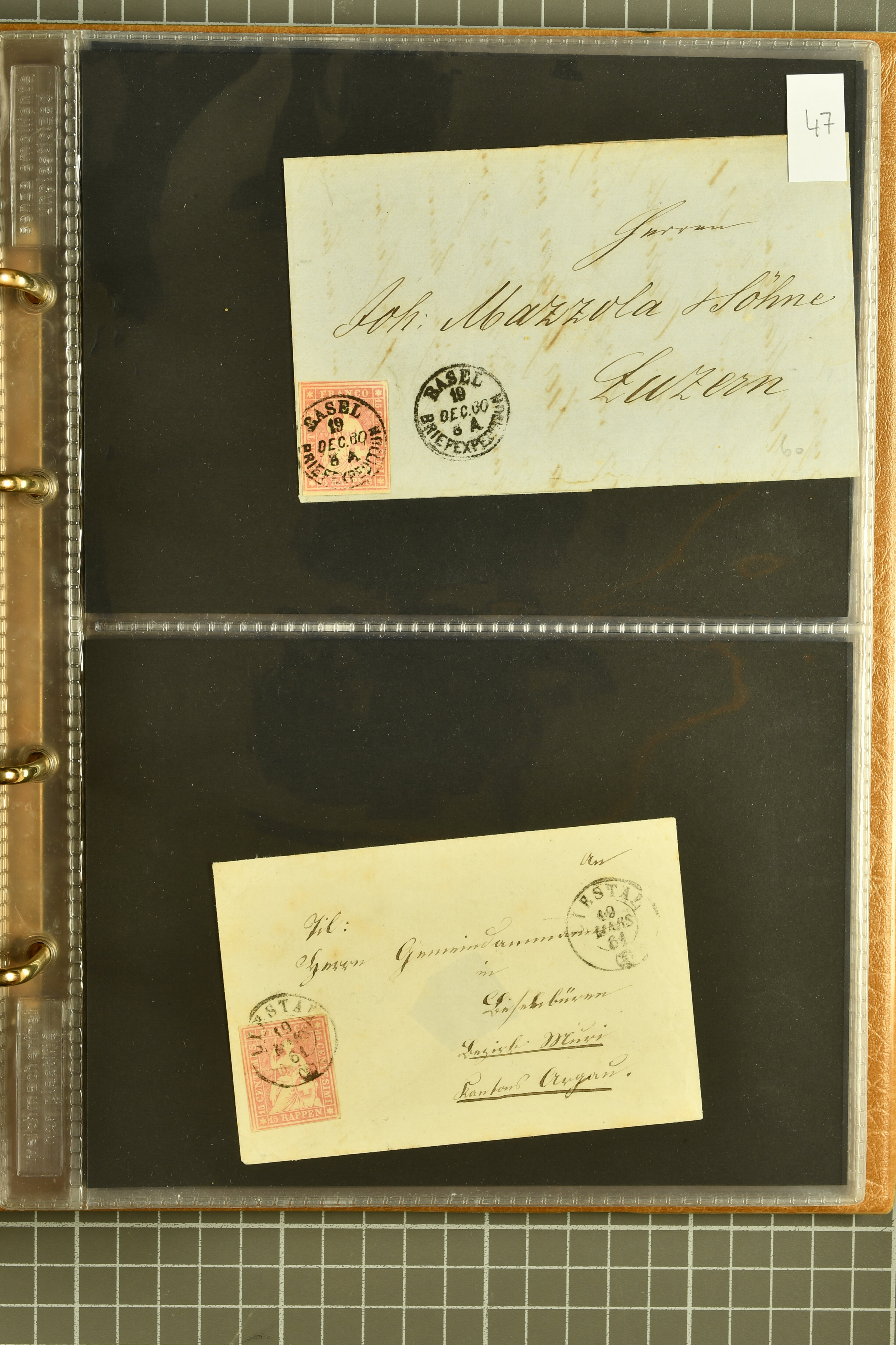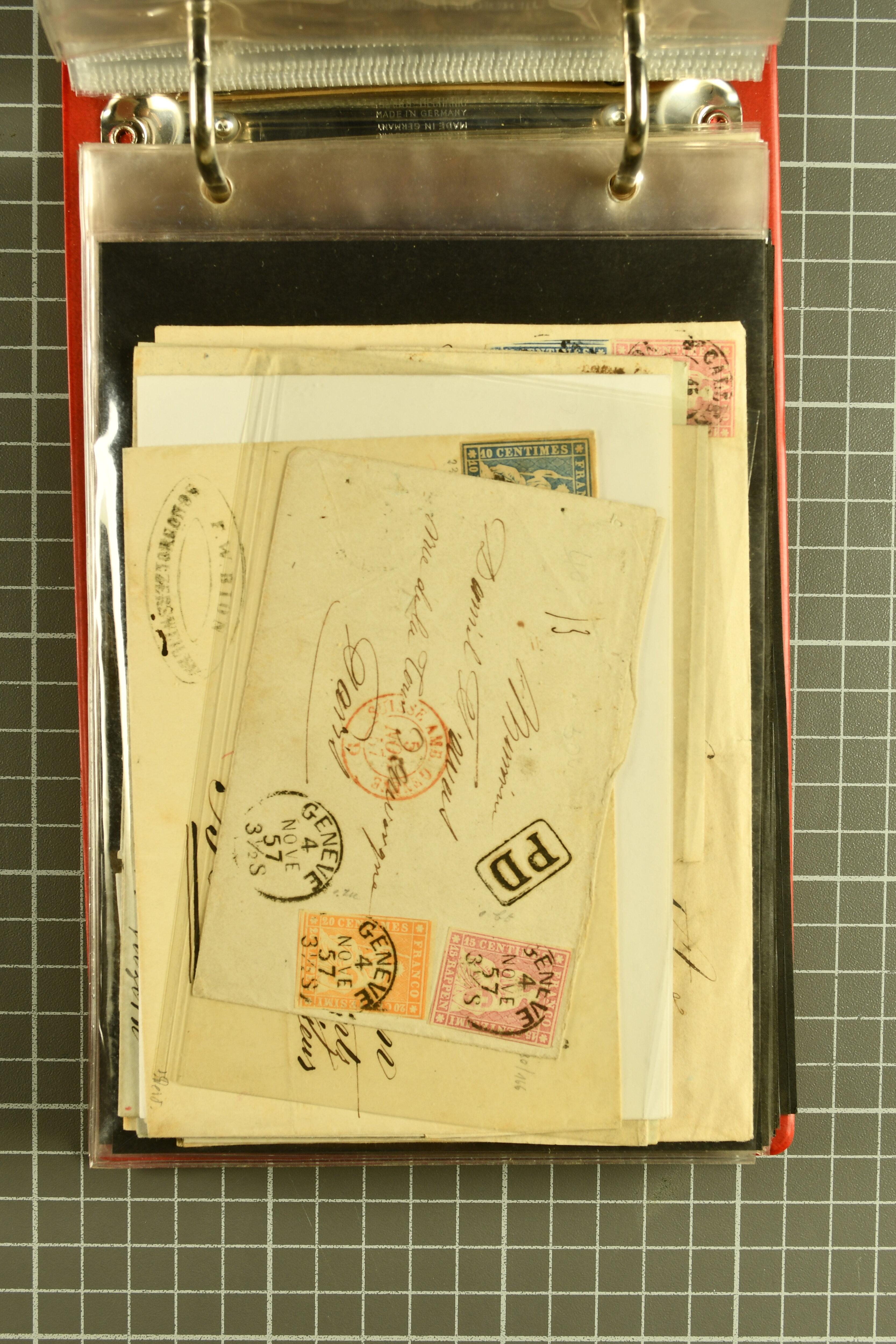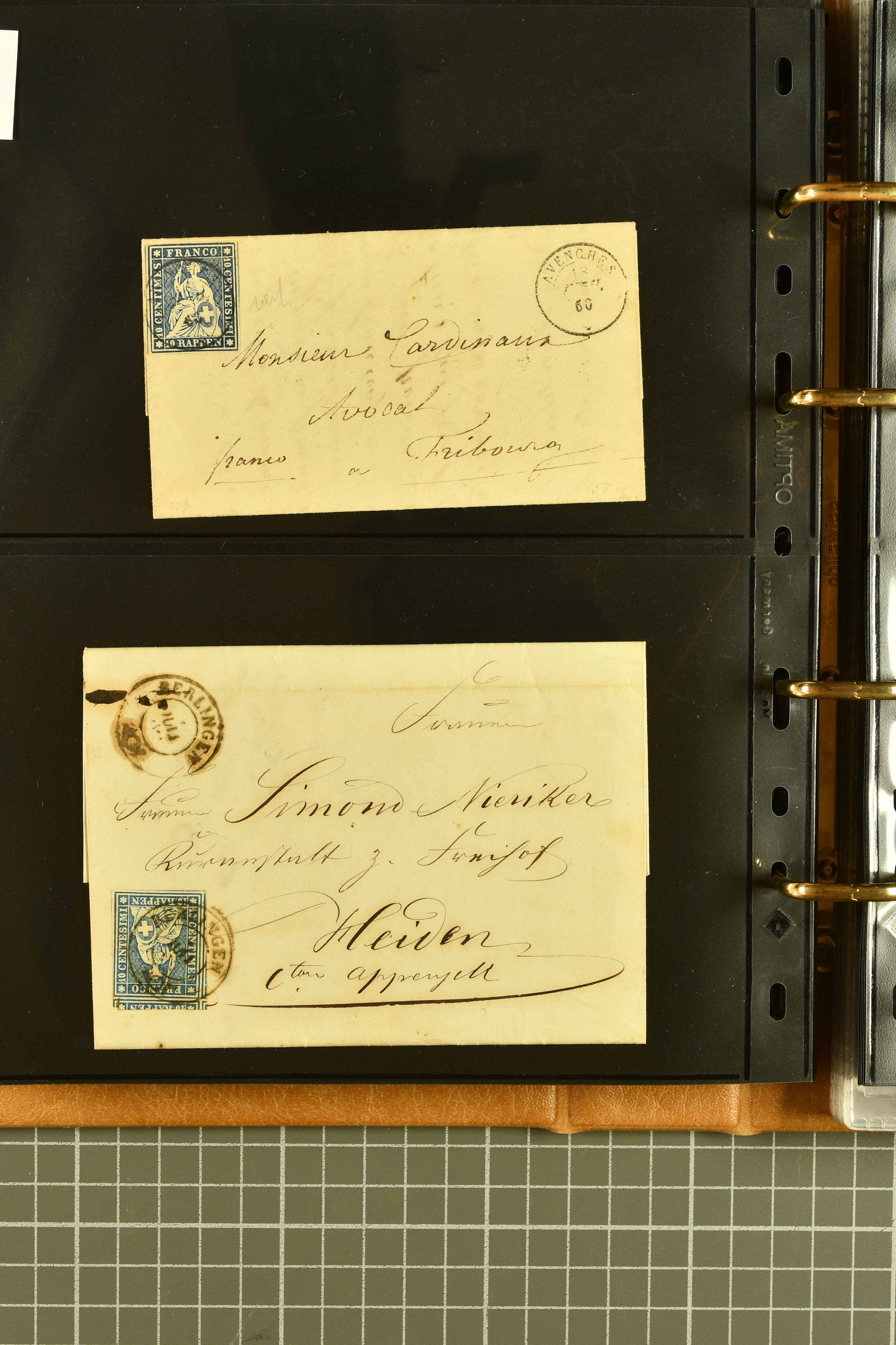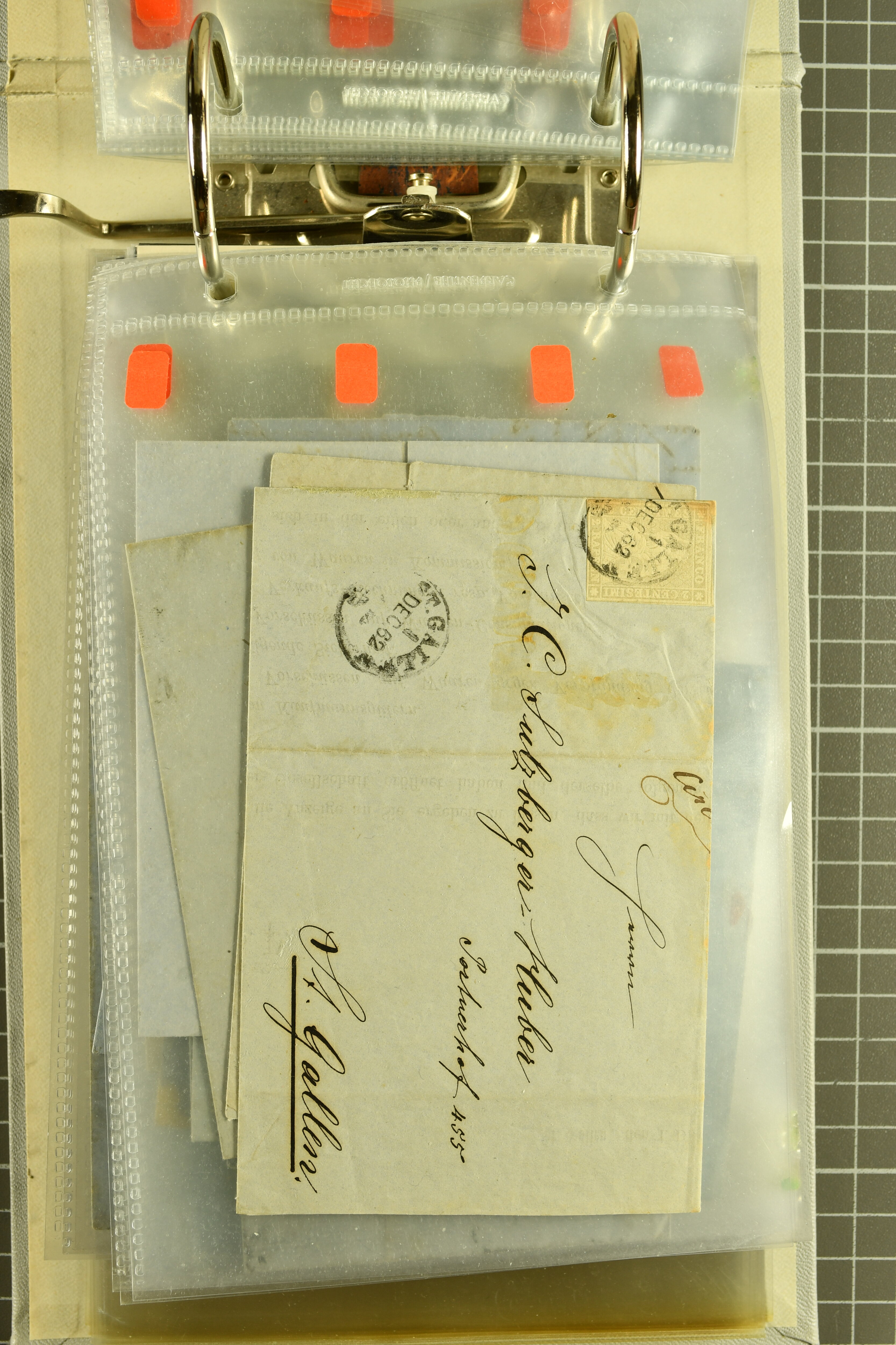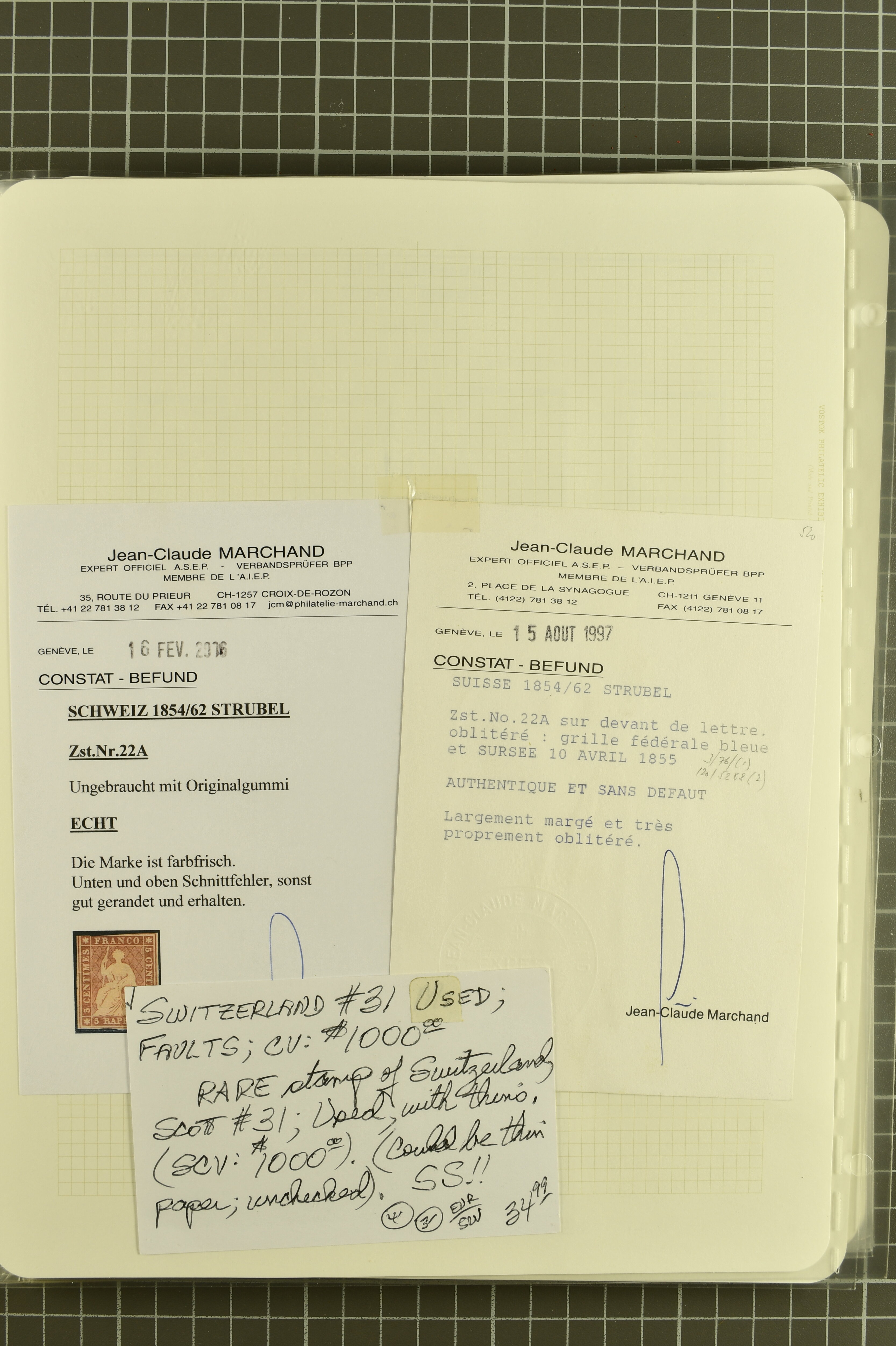 9792 cover image1854/62: Lot 20 Strubelfrankaturen. Dabei, 10 Rp. blau (2) und 15 Rp. rötlichkarmin (SBK 24B), meist weissrandig und mit deutlich ausgeprägtem Relief, je klar entw. mit schwarzer Genfer Raute auf Damenbriefumschlag nach Paris (F), 10 Rp. lebhaftpreussischblau auf dünnem Zürcher Papier (SBK 23E) mit Bogenrand rechts, entw. mit seltener 7-liniger Raute von Biel (AW 52), 10 Rp. grauultramarin auf dünnem Münchner Papier (SBK 23F) auf frischem Faltbrief von Bern nach Thun, 15 Rp. rötlichkarmin (SBK 24F), farbfr. und weissrandig auf kleinformatigem Faltbrief mit Vermerk "sehr bressant" von St. Gallen nach Ossingen (ZH), sehr farbfr. 20 Rp. gelblichorange (SBK 25F) auf Nachnahmebrief im 2. Briefkreis von Aarau nach Dornach (SO) oder 2 Rp. grau (SBK 21G) auf Drucksache von Winterthur nach Basel. Vorab gute Erhaltung; drei Befunde, sechs Atteste. SBK=CHF 10'000 (Image 1) (Image 2) (Image 3) (Image 4) (Image 5) (Image 6) (Image 7) (Image 8) (Image 9) (Image 10) (Image 11) (Image 12) (Image 13) (Image 14) (Image 15) (Image 16) (Image 17) (Image 18) (Image 19) (Image 20) (Image 21)