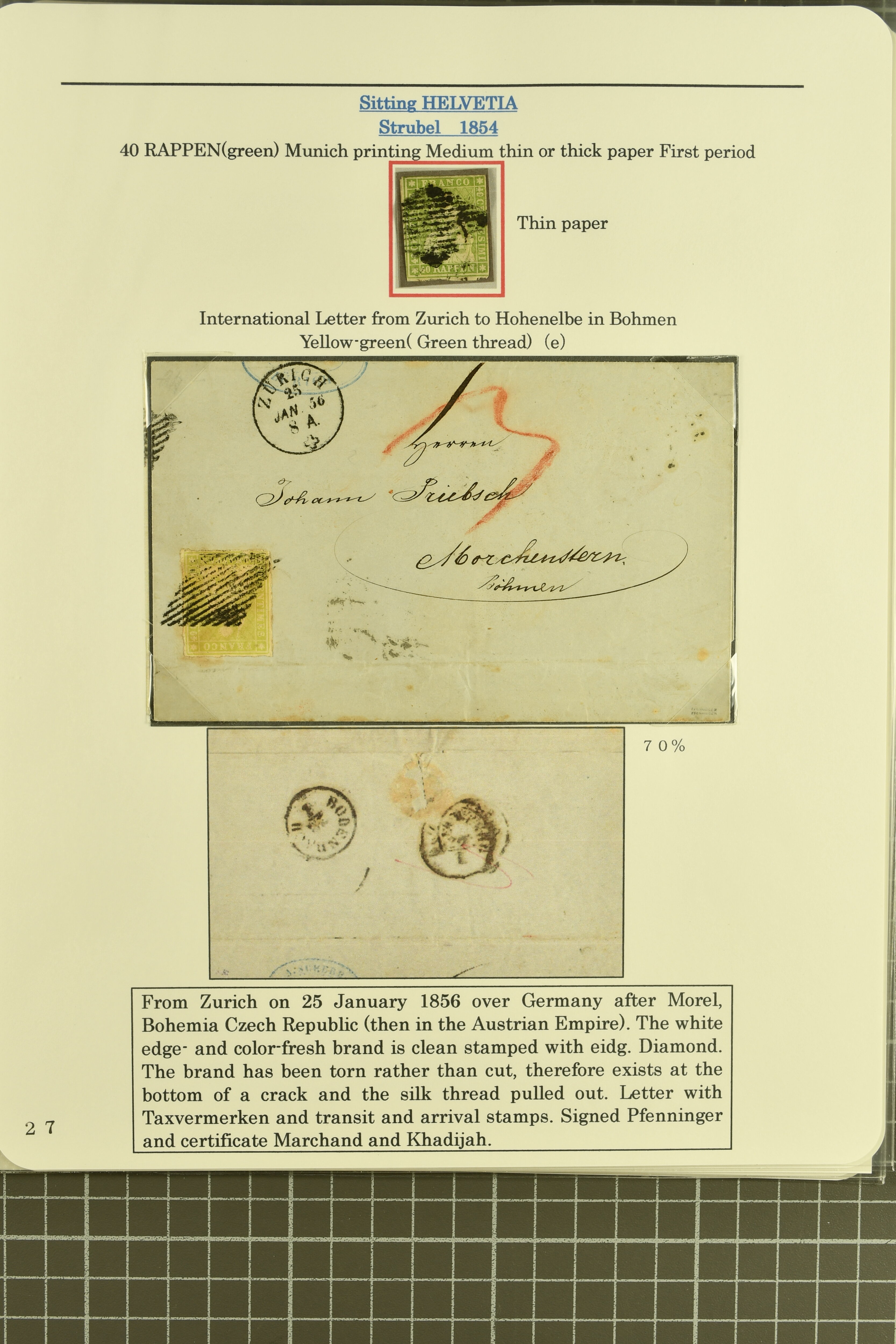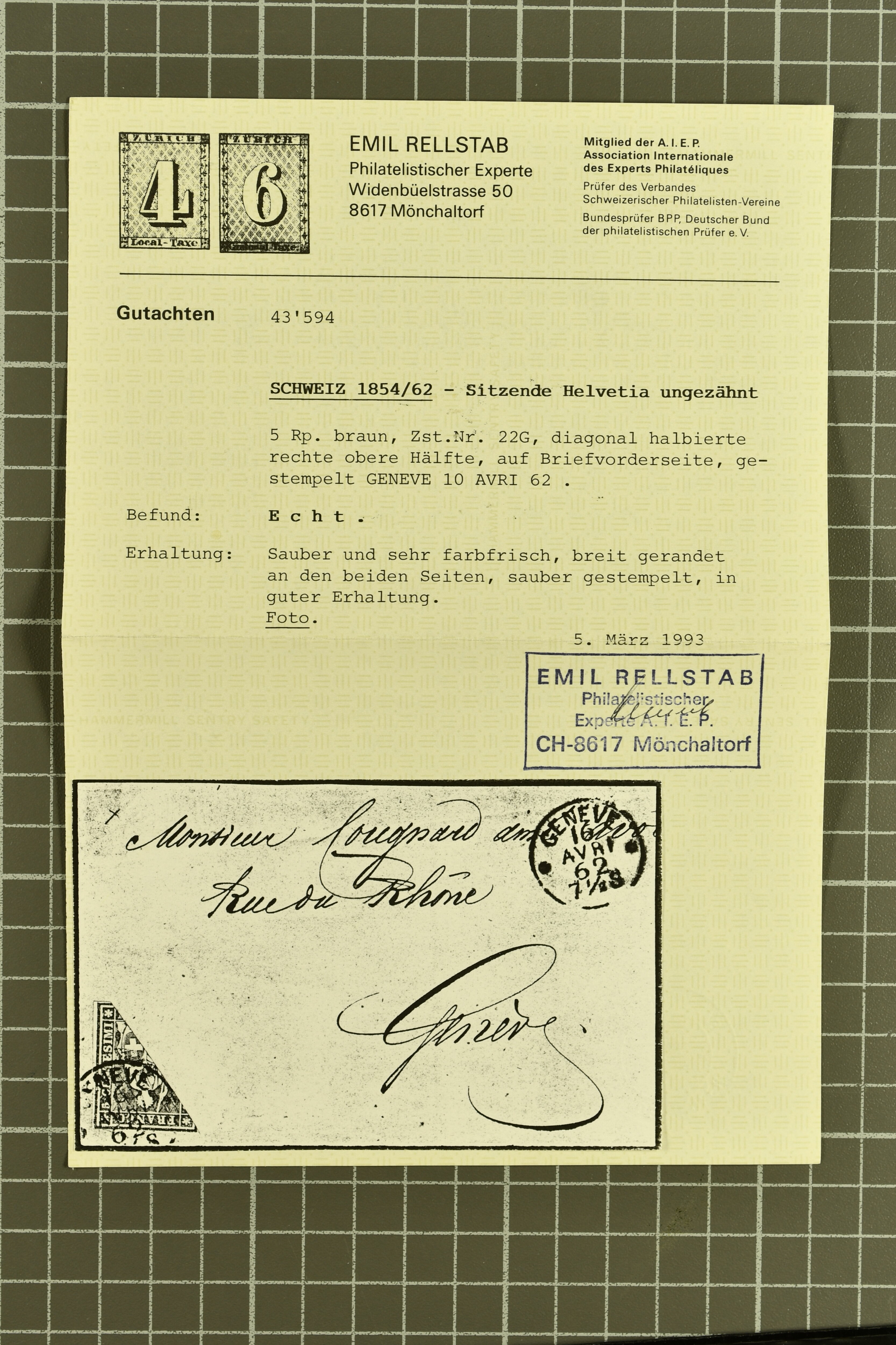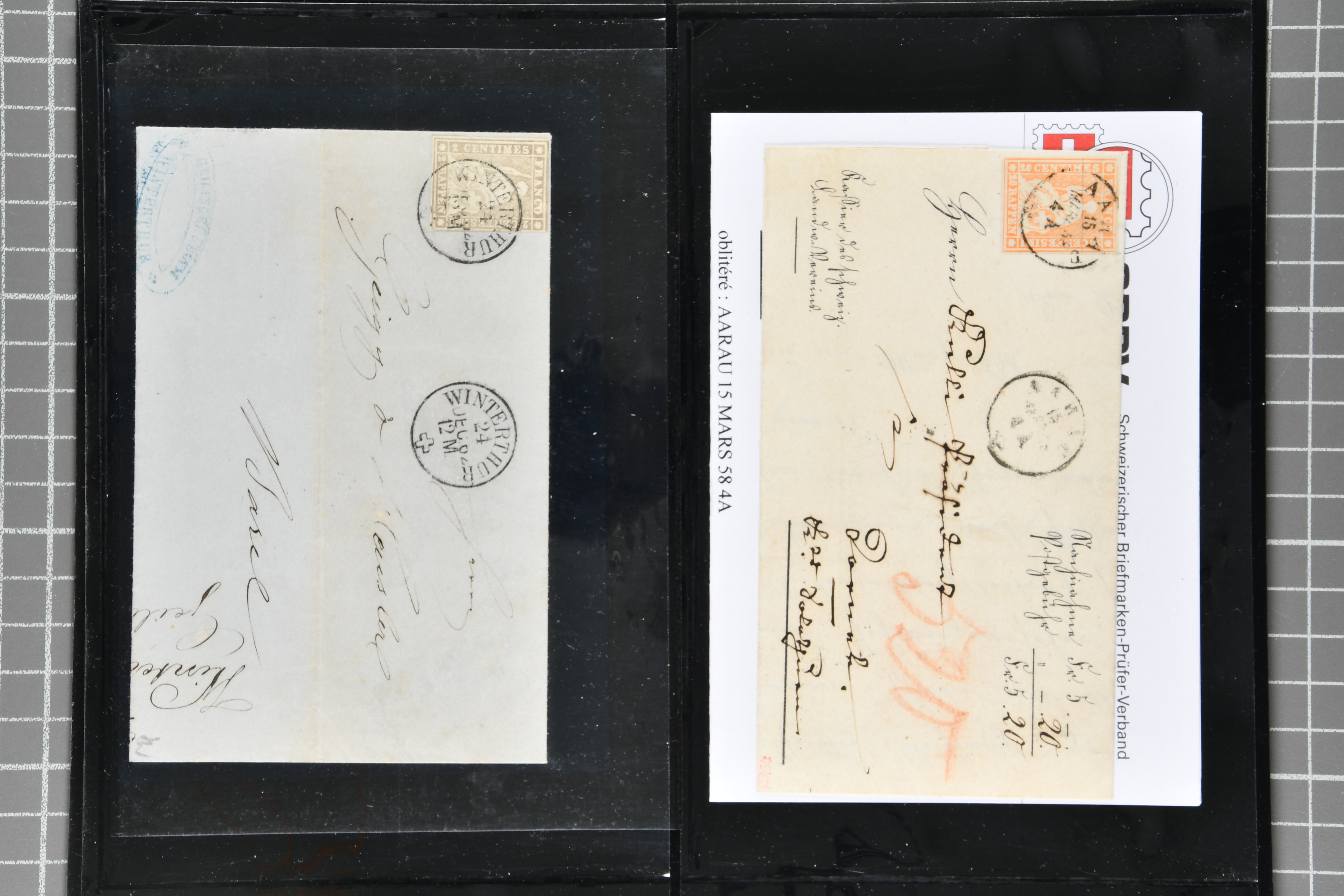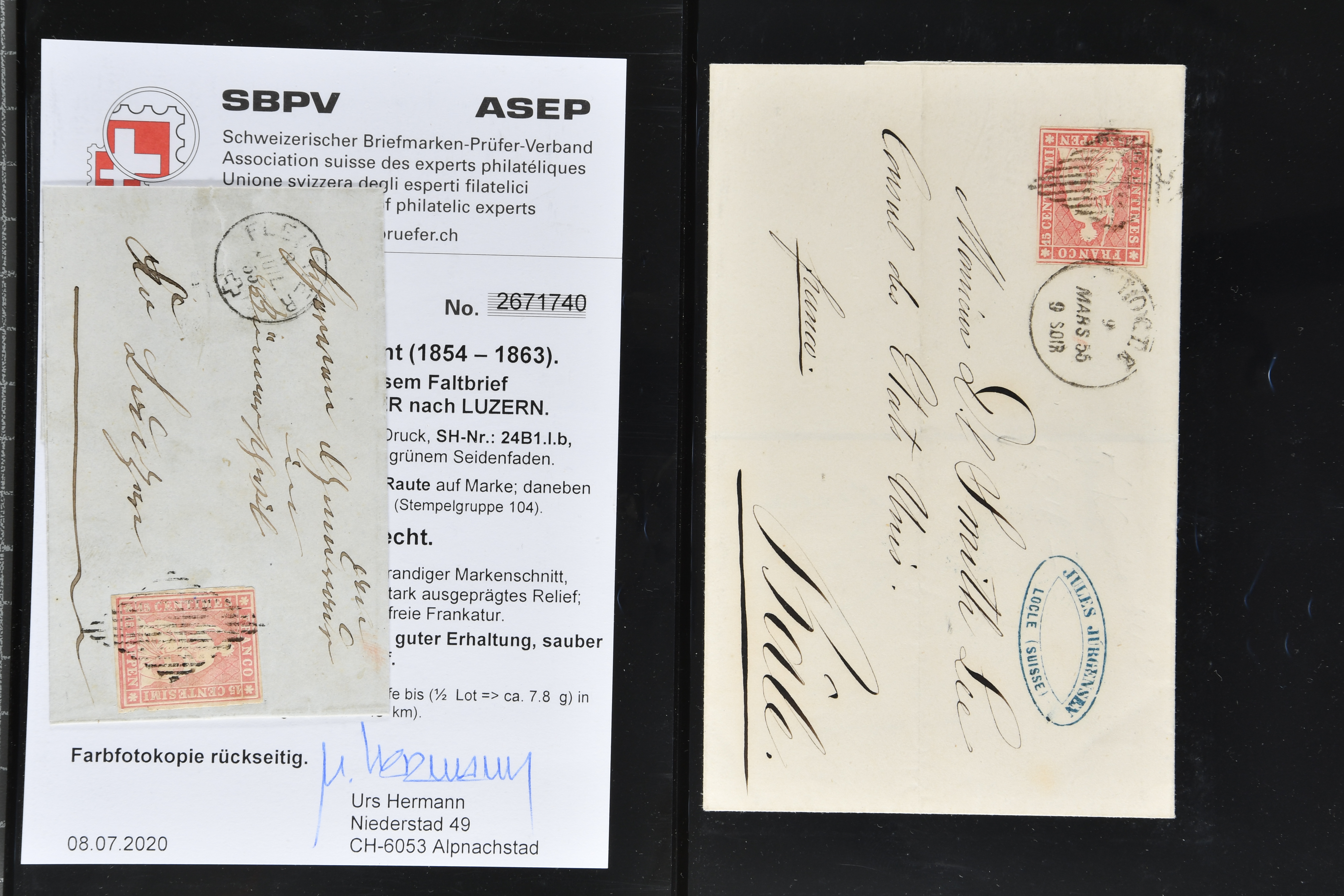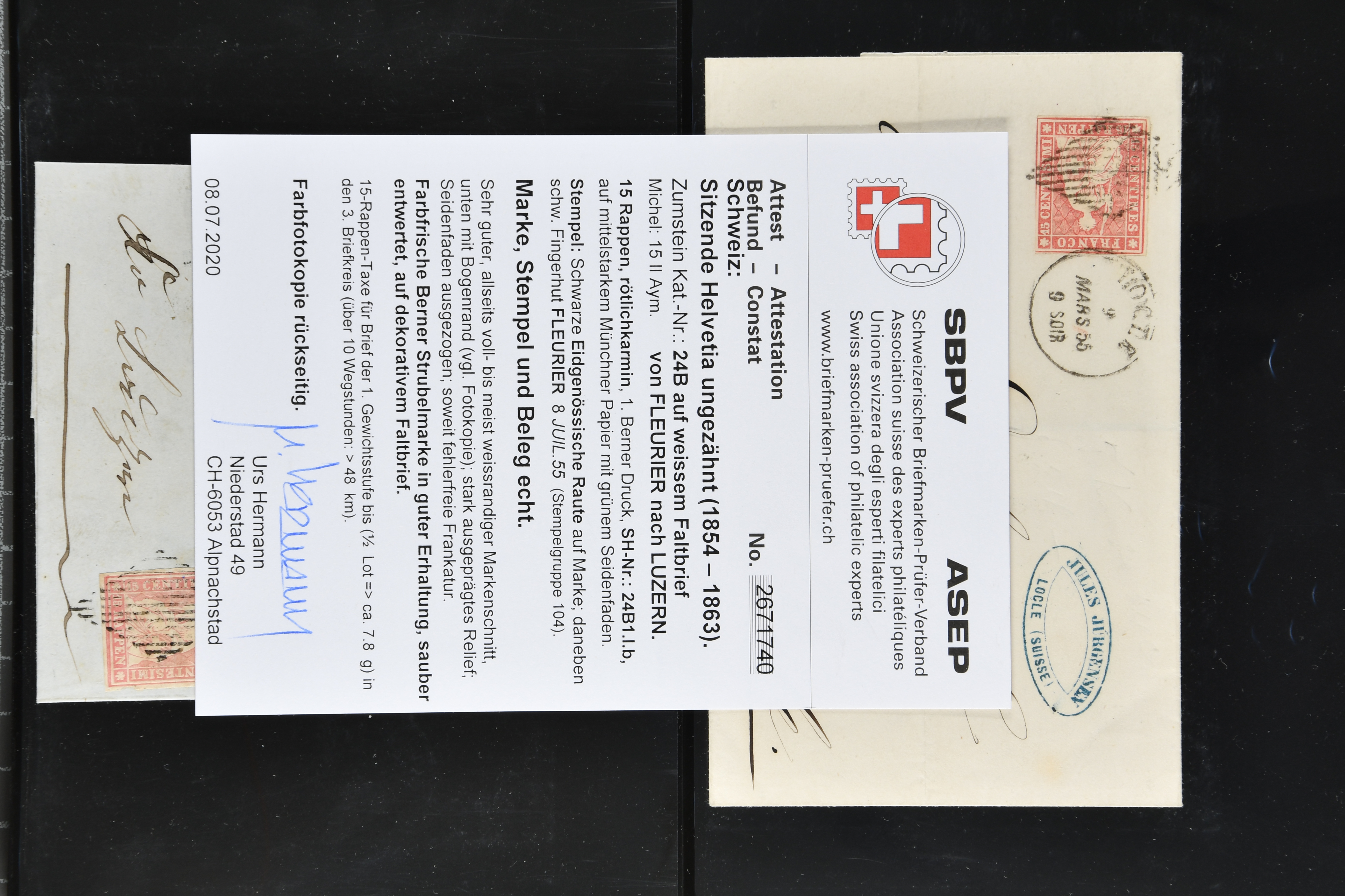 9778 image1854/62: Ziemlich spezialisierte Sammlung mit 21 Briefen und 110 ungebr./gest. Einzelwerten auf 23 Ausstellungsblättern. Dabei elf ungebr. Werte inkl. 5 Rp. braun (SBK 22A), 20 Rp. gelblichorange (SBK 25G), 40 Rp. olivgrün (2, SBK 26G) und 1 Fr. grau (SBK 27D), bessere gest. Werte wie neun Exemplare der 2 Rp. grau (SBK 21G), drei Exemplare 1 Fr. grau mit schwarzem Seidenfaden (SBK 27C) und sechs mit gelbem Seidenfaden (SBK 27D) sowie interessante Frankaturen wie 2 Rp. grau, ideal klar und übergehend entw. mit kl. Zweikreisstp. "WEISSENBURG 1 NOV. 62" auf frischer Trauer-Drucksache nach Aeschi bei Spiez, 5 Rp. braun (SBK 22G), diagonal halbiert als sog. "Genfer Provisorium" auf Briefstück, 15 Rp. karminrot (SBK 24A) entw. mit seltener 10-liniger Raute von Triengen (AW 55) in schwarz auf Nachnahme-Faltbrieflein im Ort, 20 Rp. gelblichorange (SBK 25B) auf Faltbrieflein im Grenzrayon von Genf nach Bonneville, Savoyen (Sardinien) sowie auf Nachnahme von Langenthal nach Dagmersellen mit nebenges. Schreibschriftspt. "Gondiswil" oder 40 Rp. grünlicholiv (SBK 26C) im waagr. Paar auf sauberem Faltbrief von Schaffhausen nach Leipzig, Sachsen. Unterschiedliche Erhaltung; vier Befunde. SBK=CHF 30'000+ (Image 1) (Image 2) (Image 3) (Image 4) (Image 5) (Image 6) (Image 7) (Image 8) (Image 9) (Image 10) (Image 11) (Image 12) (Image 13) (Image 14) (Image 15) (Image 16) (Image 17) (Image 18) (Image 19) (Image 20) (Image 21) (Image 22) (Image 23) (Image 24) (Image 25) (Image 26)