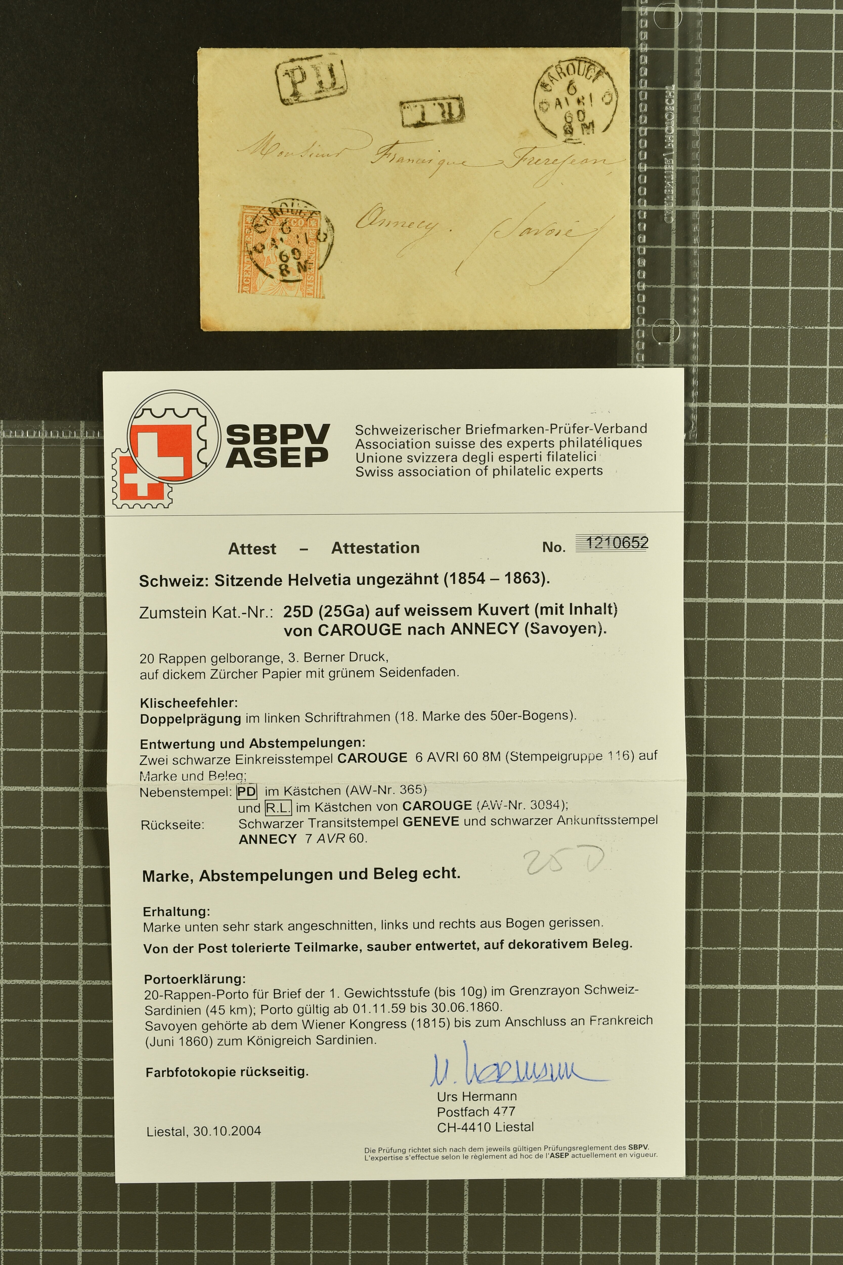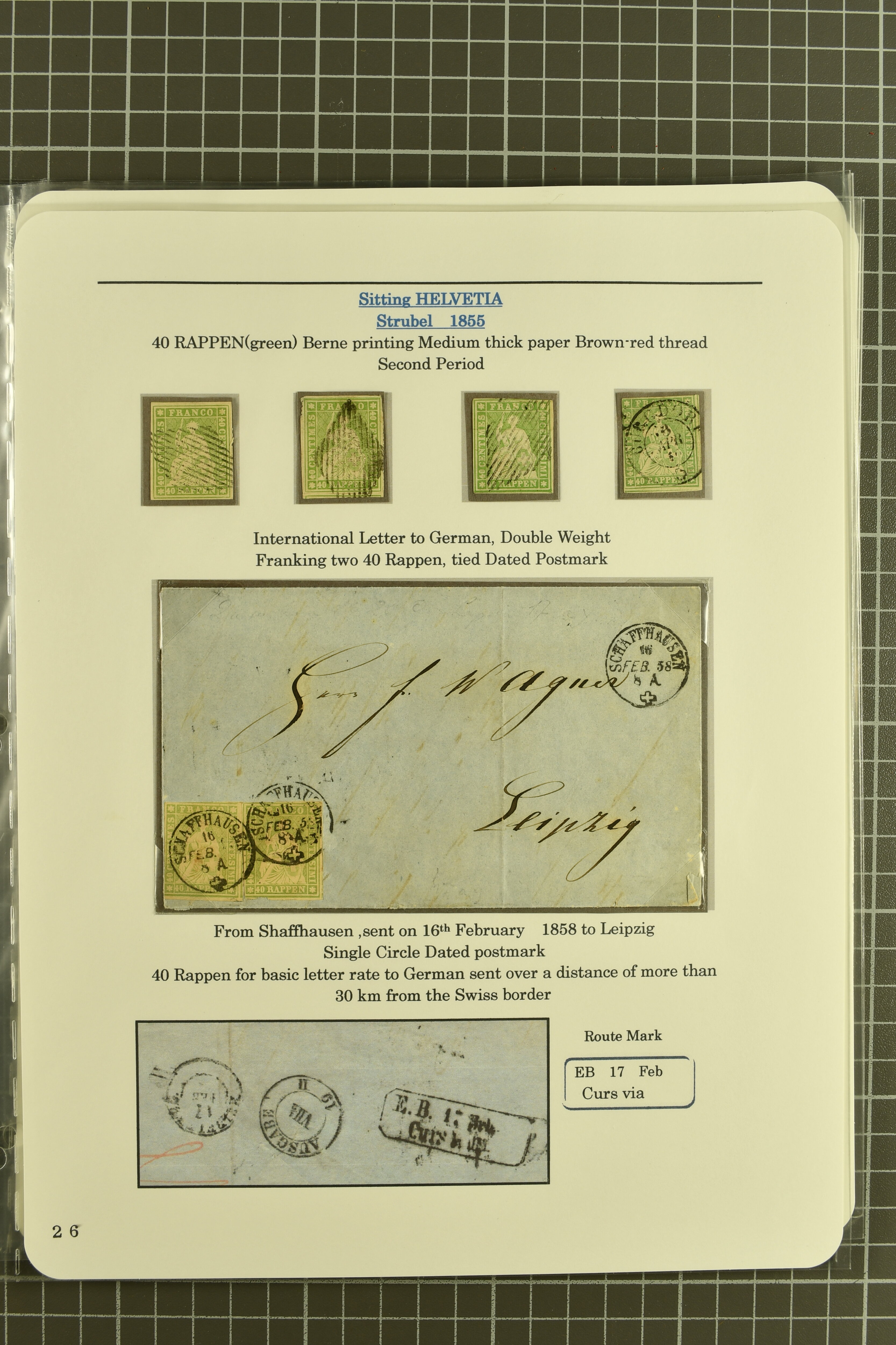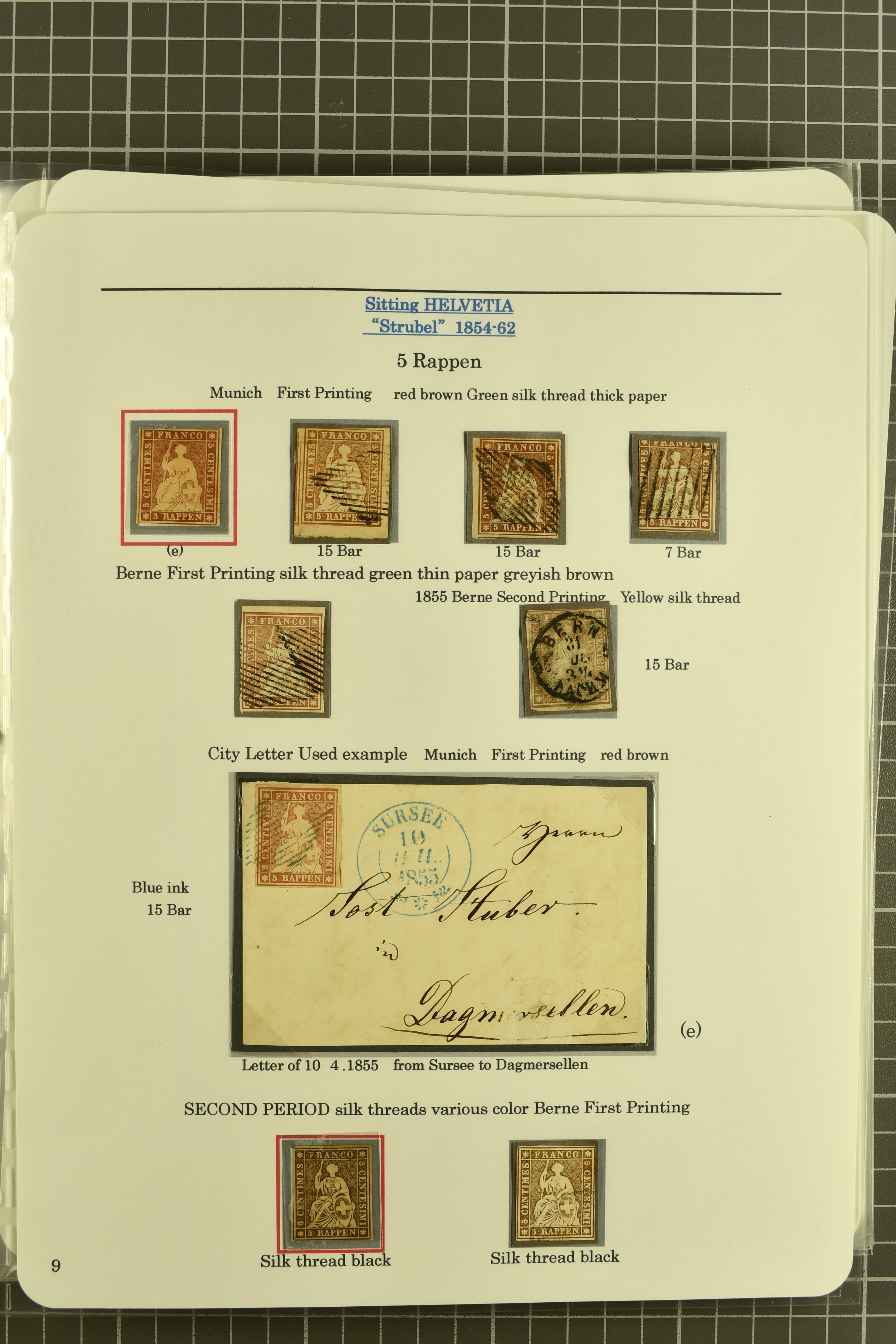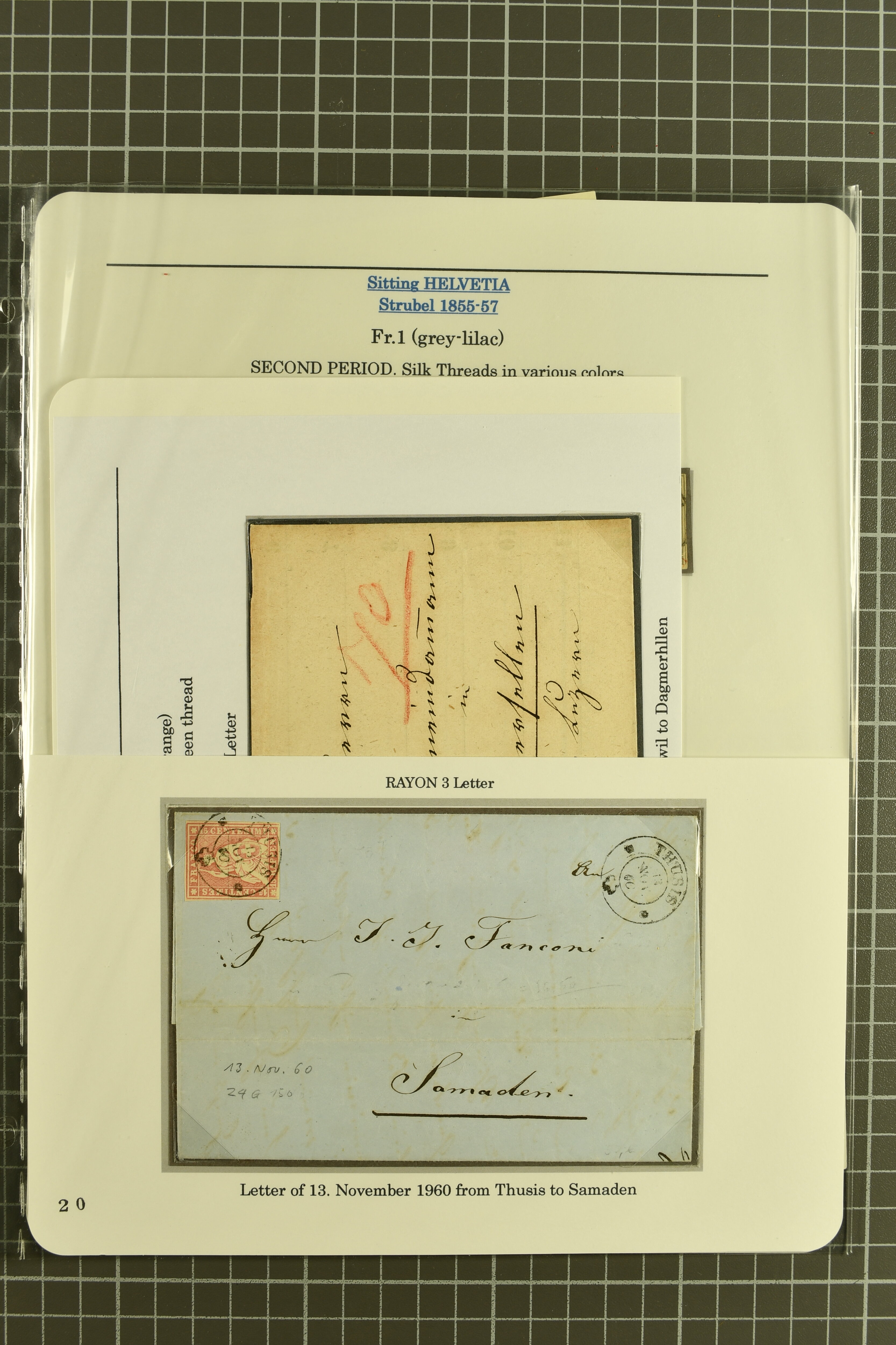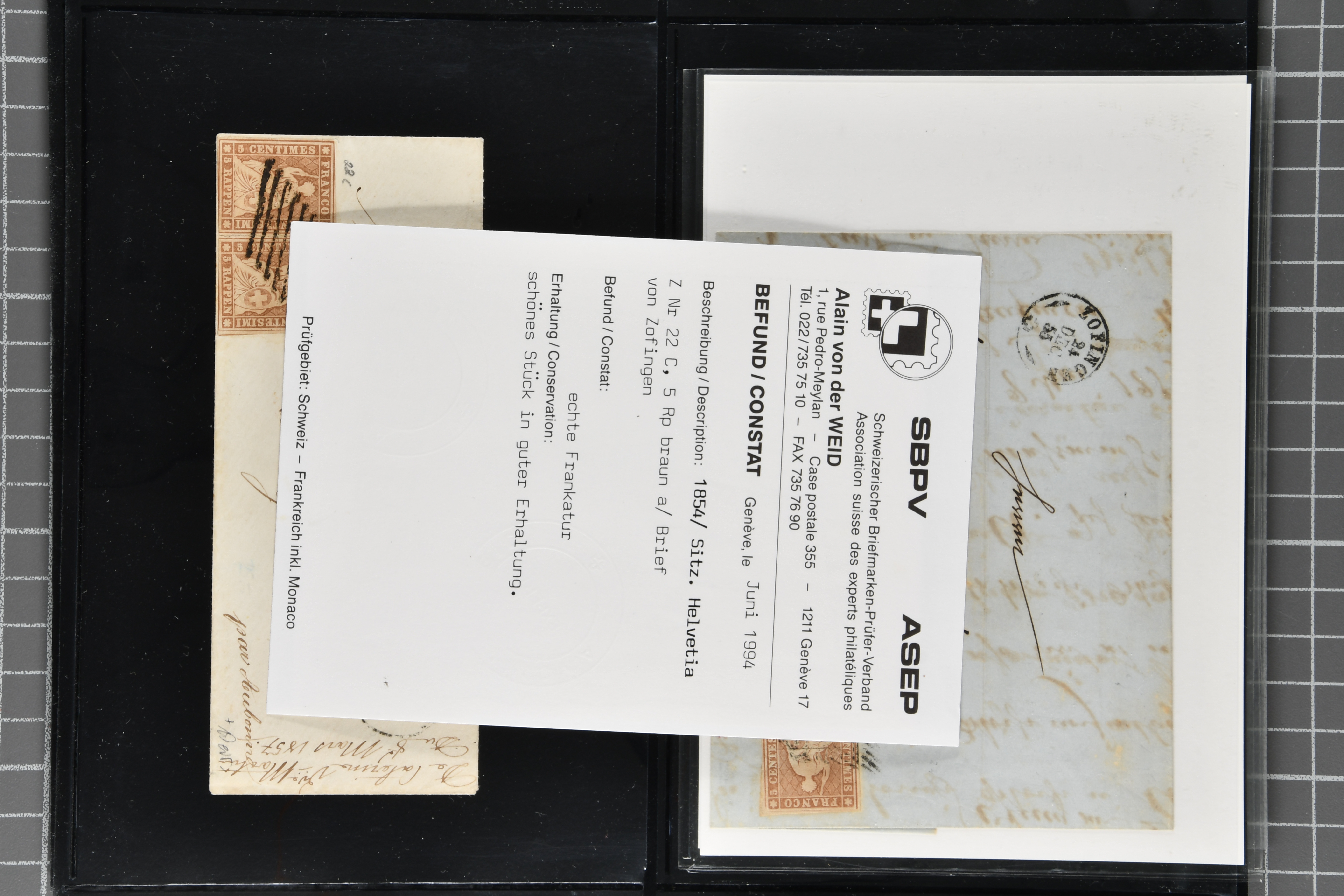9778 image1854/62: Ziemlich spezialisierte Sammlung mit 21 Briefen und 110 ungebr./gest. Einzelwerten auf 23 Ausstellungsblättern. Dabei elf ungebr. Werte inkl. 5 Rp. braun (SBK 22A), 20 Rp. gelblichorange (SBK 25G), 40 Rp. olivgrün (2, SBK 26G) und 1 Fr. grau (SBK 27D), bessere gest. Werte wie neun Exemplare der 2 Rp. grau (SBK 21G), drei Exemplare 1 Fr. grau mit schwarzem Seidenfaden (SBK 27C) und sechs mit gelbem Seidenfaden (SBK 27D) sowie interessante Frankaturen wie 2 Rp. grau, ideal klar und übergehend entw. mit kl. Zweikreisstp. "WEISSENBURG 1 NOV. 62" auf frischer Trauer-Drucksache nach Aeschi bei Spiez, 5 Rp. braun (SBK 22G), diagonal halbiert als sog. "Genfer Provisorium" auf Briefstück, 15 Rp. karminrot (SBK 24A) entw. mit seltener 10-liniger Raute von Triengen (AW 55) in schwarz auf Nachnahme-Faltbrieflein im Ort, 20 Rp. gelblichorange (SBK 25B) auf Faltbrieflein im Grenzrayon von Genf nach Bonneville, Savoyen (Sardinien) sowie auf Nachnahme von Langenthal nach Dagmersellen mit nebenges. Schreibschriftspt. "Gondiswil" oder 40 Rp. grünlicholiv (SBK 26C) im waagr. Paar auf sauberem Faltbrief von Schaffhausen nach Leipzig, Sachsen. Unterschiedliche Erhaltung; vier Befunde. SBK=CHF 30'000+ (Image 1) (Image 2) (Image 3) (Image 4) (Image 5) (Image 6) (Image 7) (Image 8) (Image 9) (Image 10) (Image 11) (Image 12) (Image 13) (Image 14) (Image 15) (Image 16) (Image 17) (Image 18) (Image 19) (Image 20) (Image 21) (Image 22) (Image 23) (Image 24) (Image 25) (Image 26)